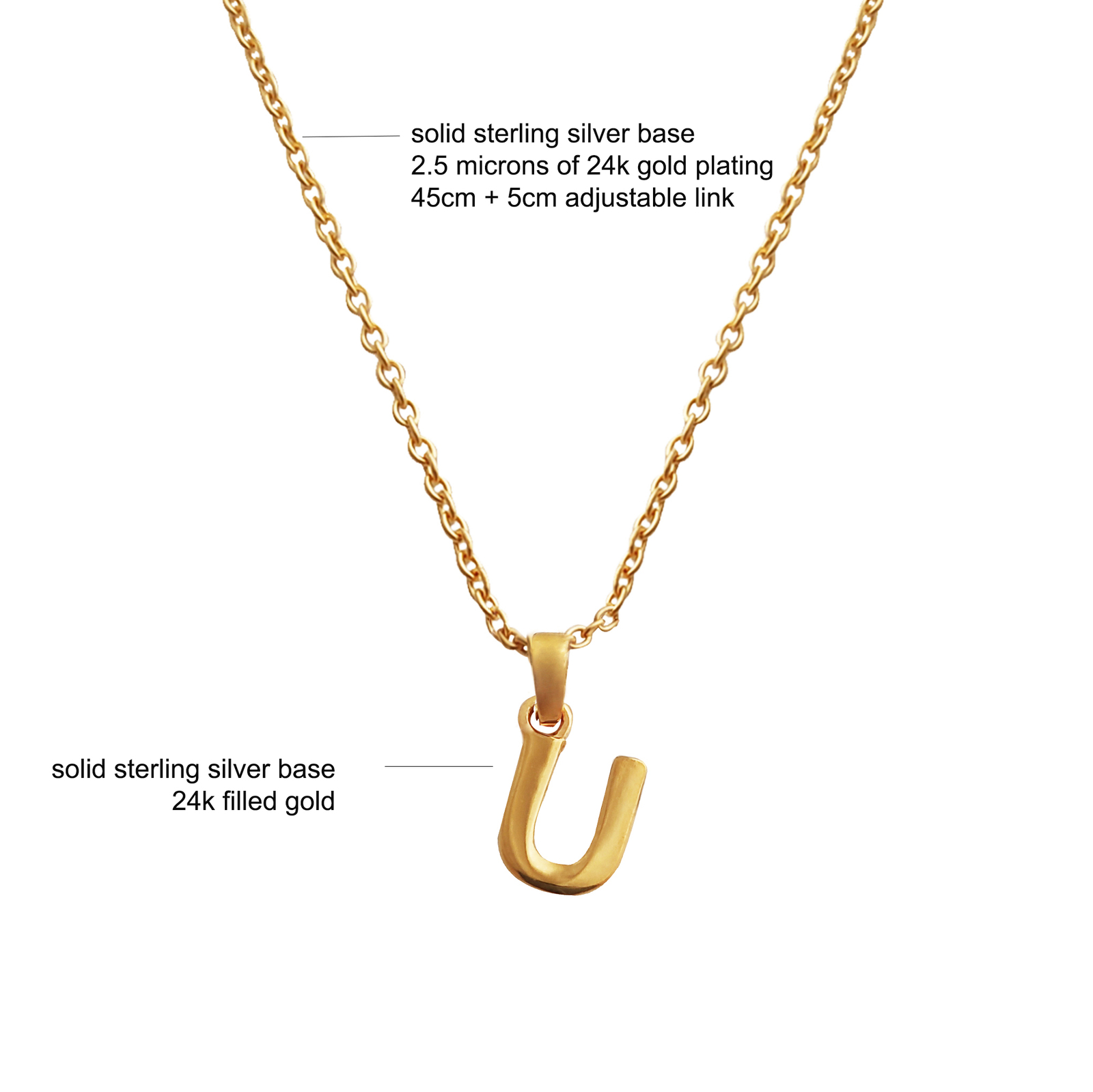 Jewellery with meaning, with quality and with a reason to keep for a lifetime. Culturesse 24K gold filled initial pendant necklaces are designed to be simple, timeless and ethical to make each piece meaningful for you and for the ones you love and care. The initial letter pendant is made of solid sterling silver with pure 24k filled gold (rolled gold) forming a much thicker gold bond to the sterling silver base, making the pendant durable for a lifetime, and radiating a luxurious gold shine. The necklace is made of solid sterling silver with 2.5 microns of pure 24k gold plating. Each necklace comes with a 5cm adjustable link for more flexible styling options. Perfect for women and girls of all ages. Suitable for all personal styles. Hypoallergenic, nickel, cadmium and lead free. Allergy free. 100% Skin safe.