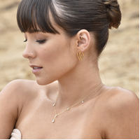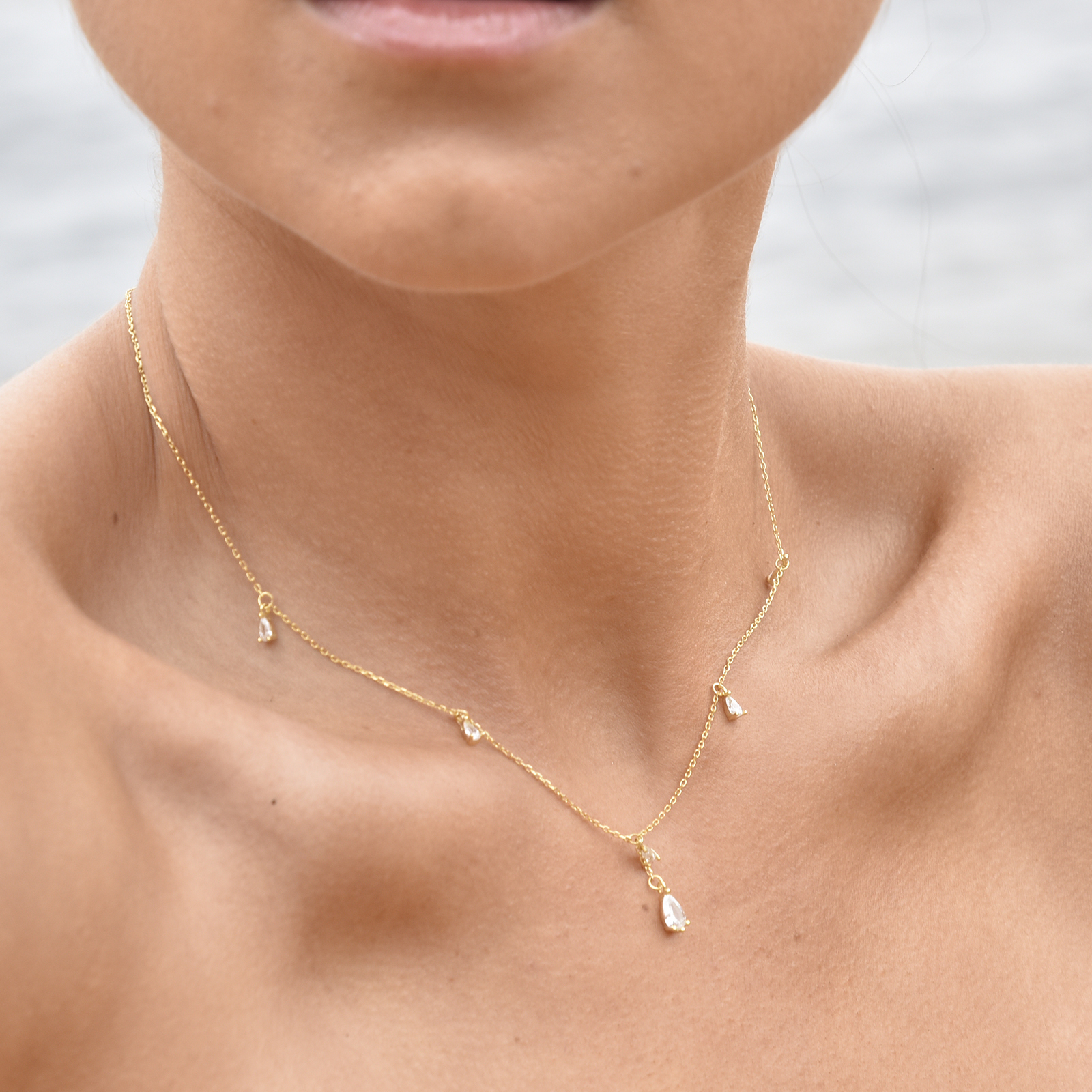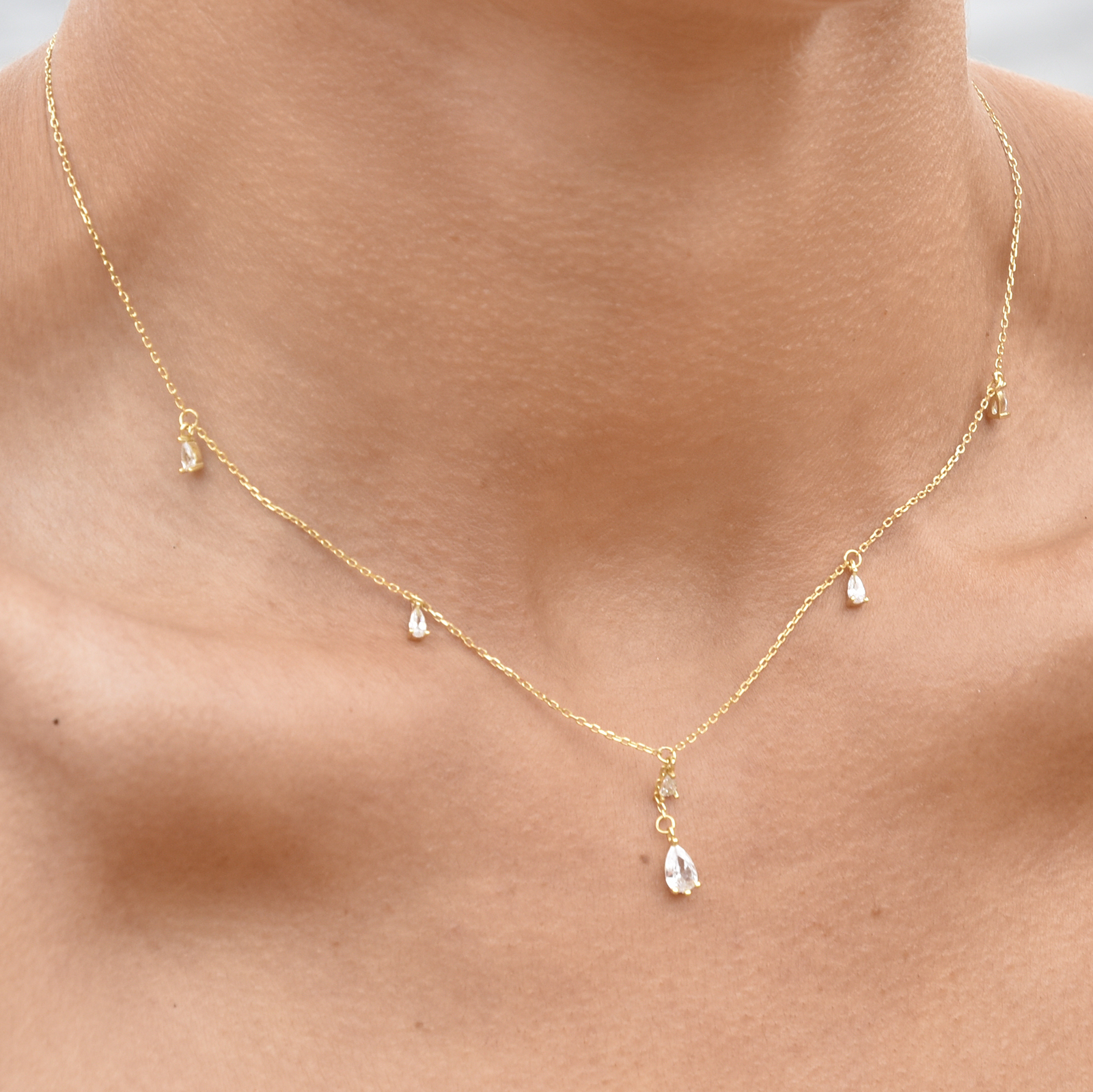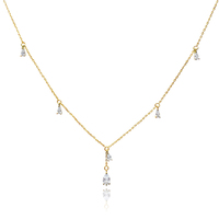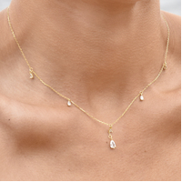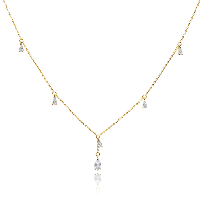 Chic, feminine and delicate. Introducing Brita Dainty Teardrop Diamante Necklace (Gold) - a soft and sweet fine neckpiece for your effortless everyday styling / layering. This design features 5 teardrop shaped Austrian zirconias evenly spaced apart on the necklace - with an additional stone attached to a short chain in the centre, with a larger zirconia pendant. The necklace is made of sterling silver with 18K gold plating. It is 44cm long including a 5cm adjustable link, allowing for a more flexible fit. Perfect for modern, retro, chic, fine, necklace layering, boho, smart casual, casual, everyday styles and more. Suitable for teens. Hypoallergenic, nickel, cadmium and lead free.