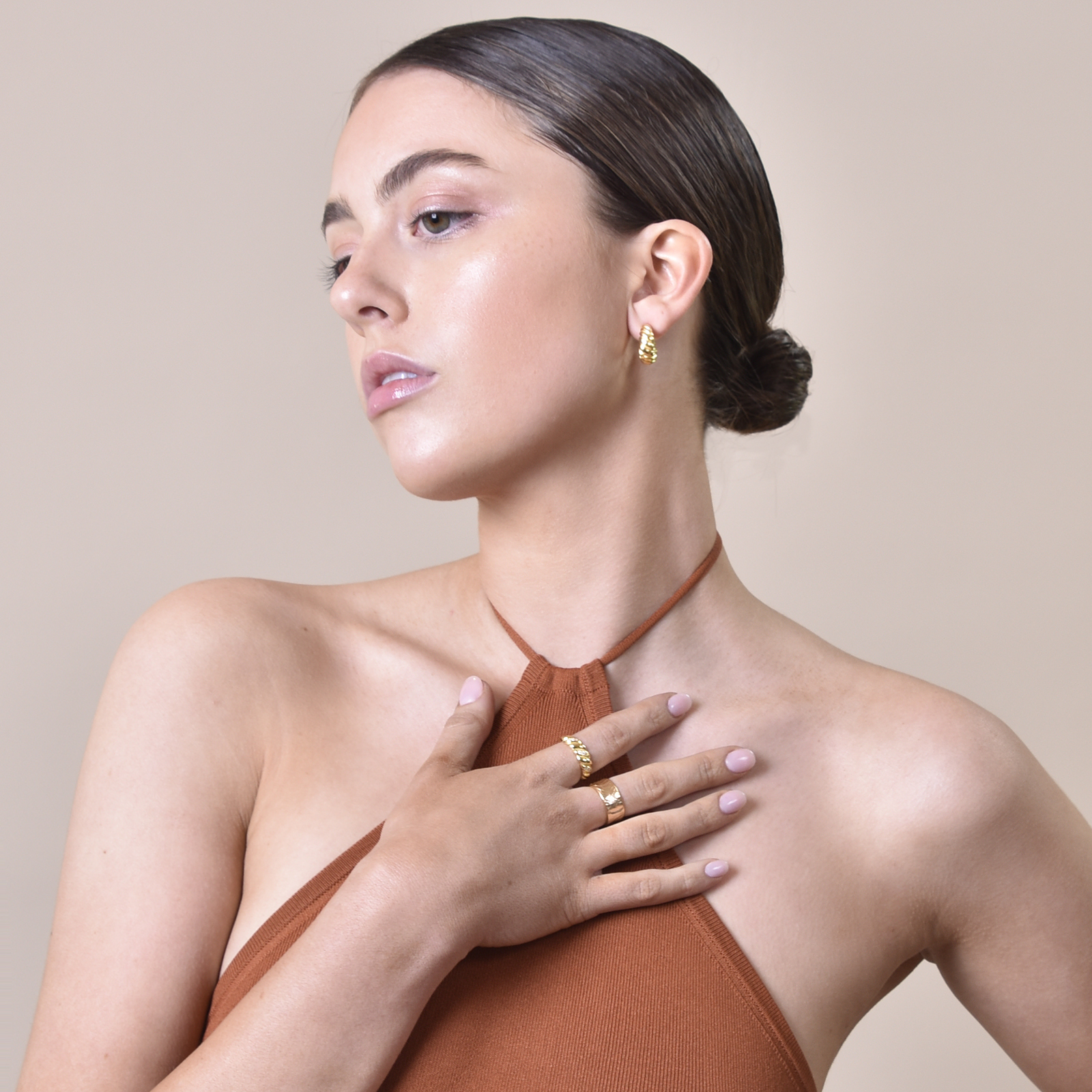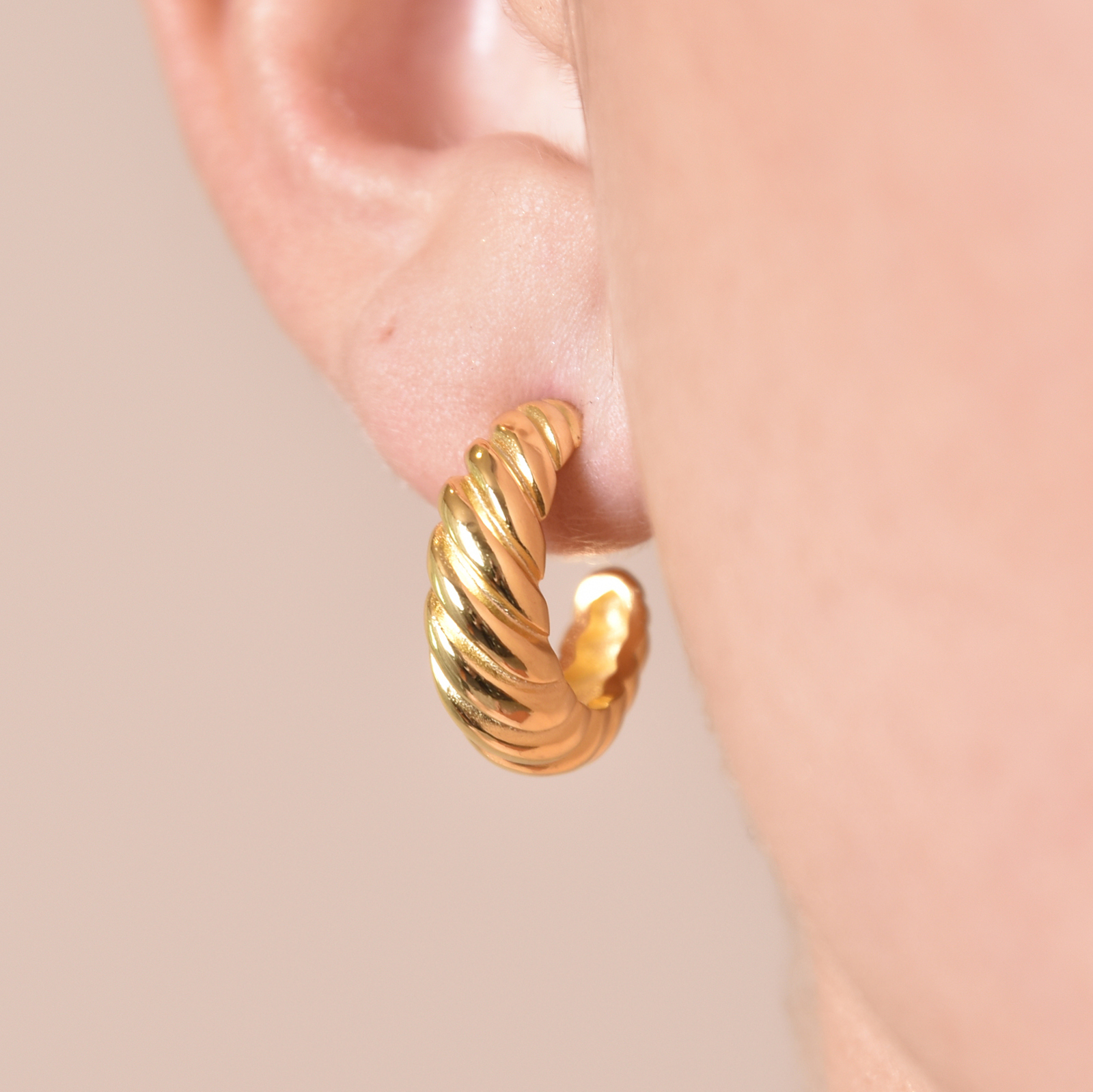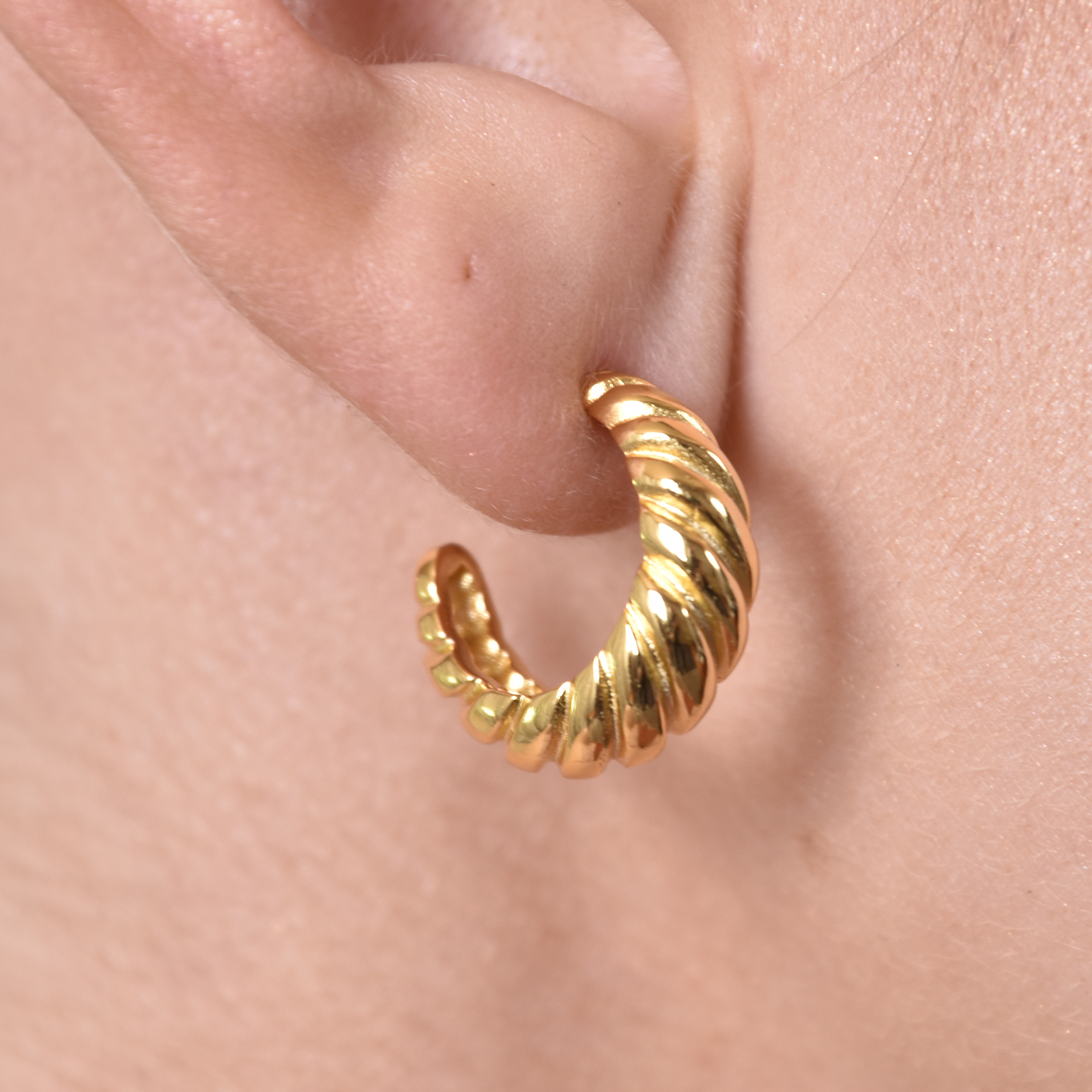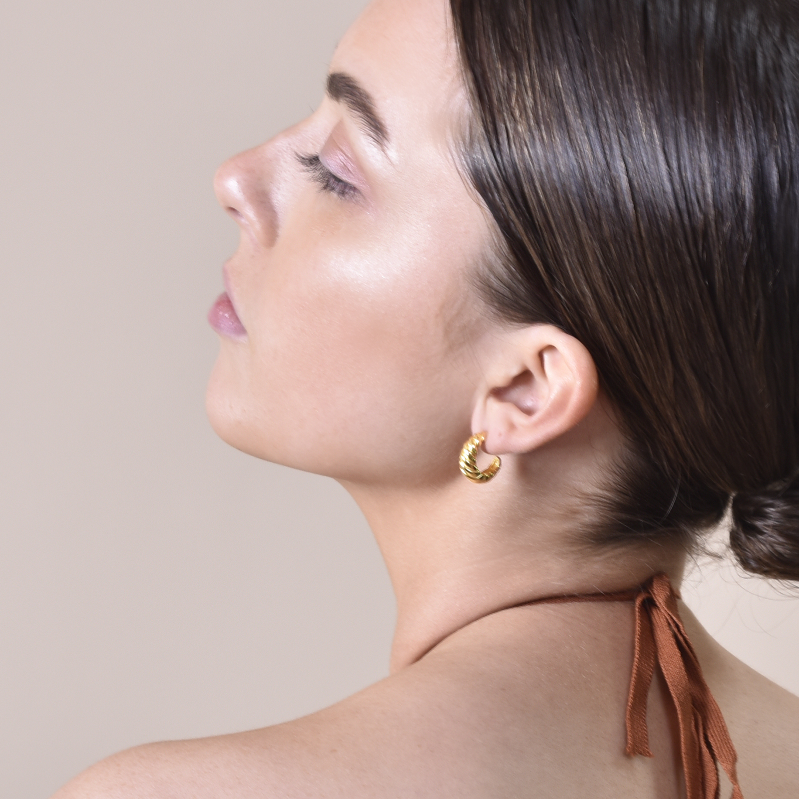 Ear staples that are timeless, super chic and versatile for styling. Introducing Gianni Croissant C Hoop Earrings (Gold Vermeil) - a classic croissant style earring ethically made to last a lifetime. This design features semi-chunky twisted three-quarter C hoops made of solid sterling silver and 2.5 microns of 18K gold plating (heavily gold plated to Gold Vermeil Jewellery Standards). They are of a comfortable weight for wearing all day and suitable for all personal styles. Hypoallergenic, nickel, cadmium and lead free.