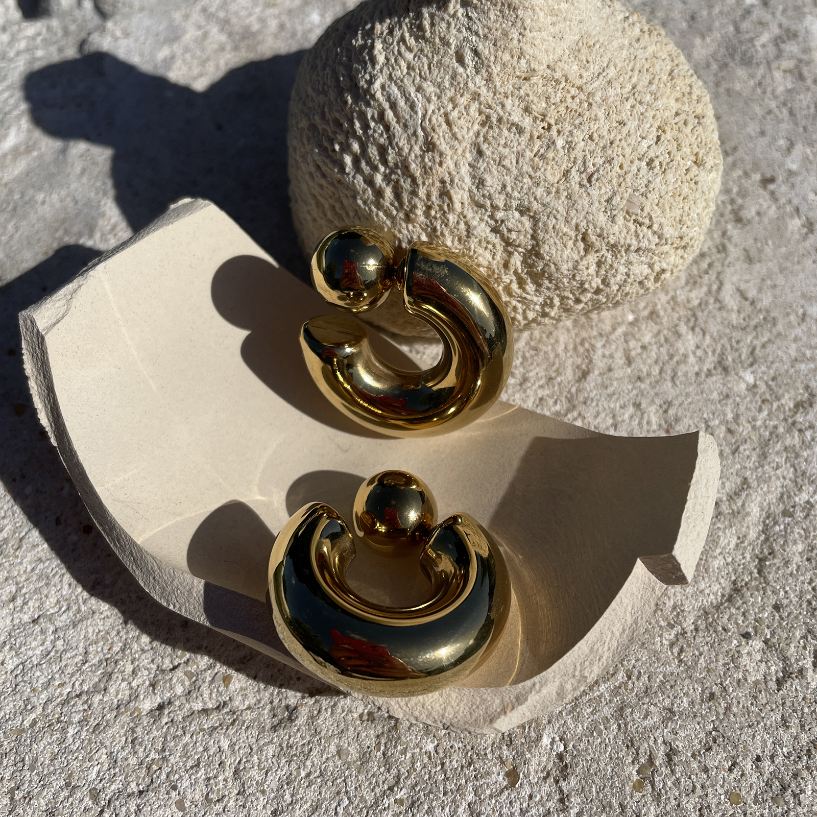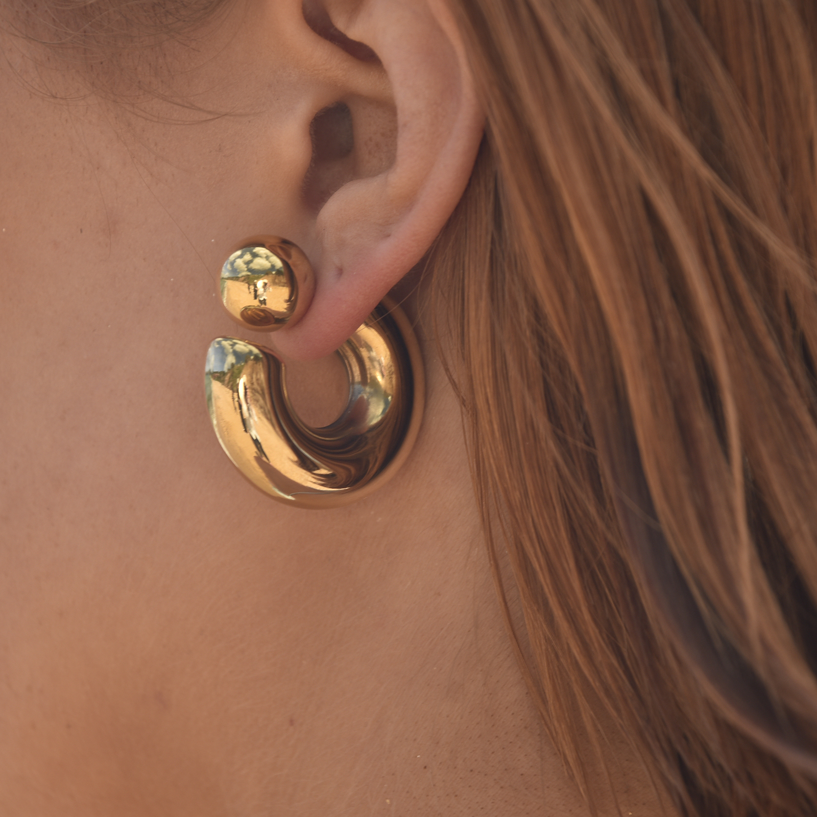 Trendy, verstaile and ready to be dressed up or down. Introducing Adair Chunky C Hoop Earrings (Gold) - a ready-to-rock ear love that instantly adds a trendy vibe to your styling. This design features a chunky hollow C hoop with a round sphere closure. The earrings are made of environmental friendly stainless steel with 18ct gold plating. Make your casual chic style pop and mix and match with more chunky ear love. Available in gold or silver.