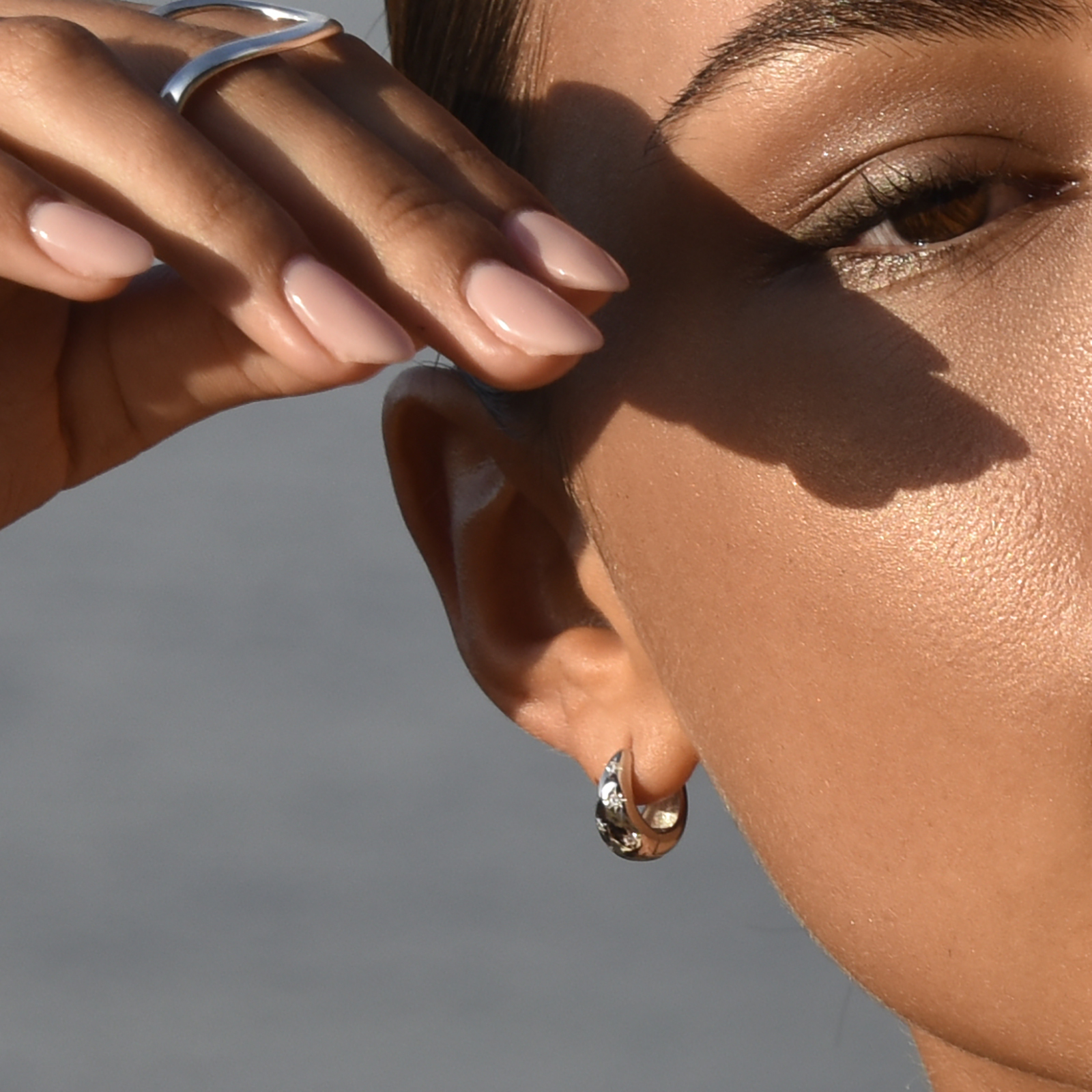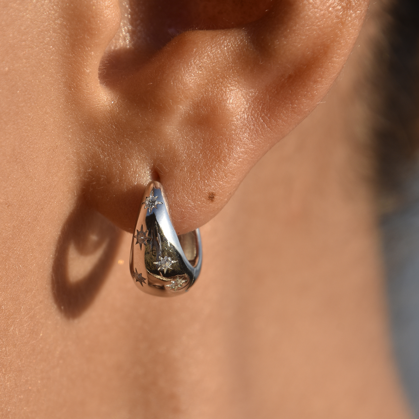 Chic, trendy and always appropriate. Introducing Adalyn Star-engraved Chunky Hoop Earrings (Silver) - a Parisian style ear love to delight your everyday styling. This design features chunky style huggie earrings that are wider at the bottom and tapered in towards the top. The front of each hoop is adorned with 5 engraved starburst features. The earrings are made in solid sterling silver for hypoallergenic and enduring wear. Perfect for modern, retro, chic, trendy, minimalist, feminine , girly, earring layering, smart casual, casual, everyday style and more. Hypoallergenic, nickel, lead, and cadmium free. Available in gold or silver.