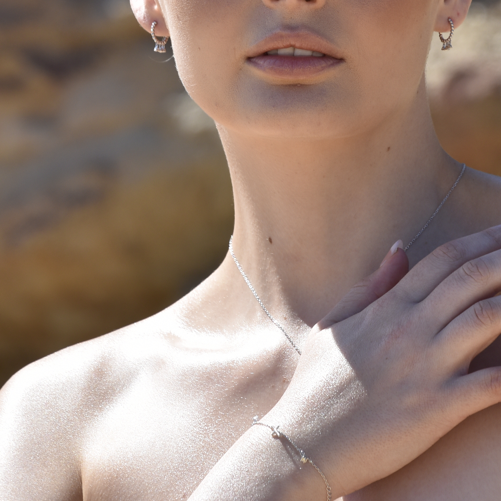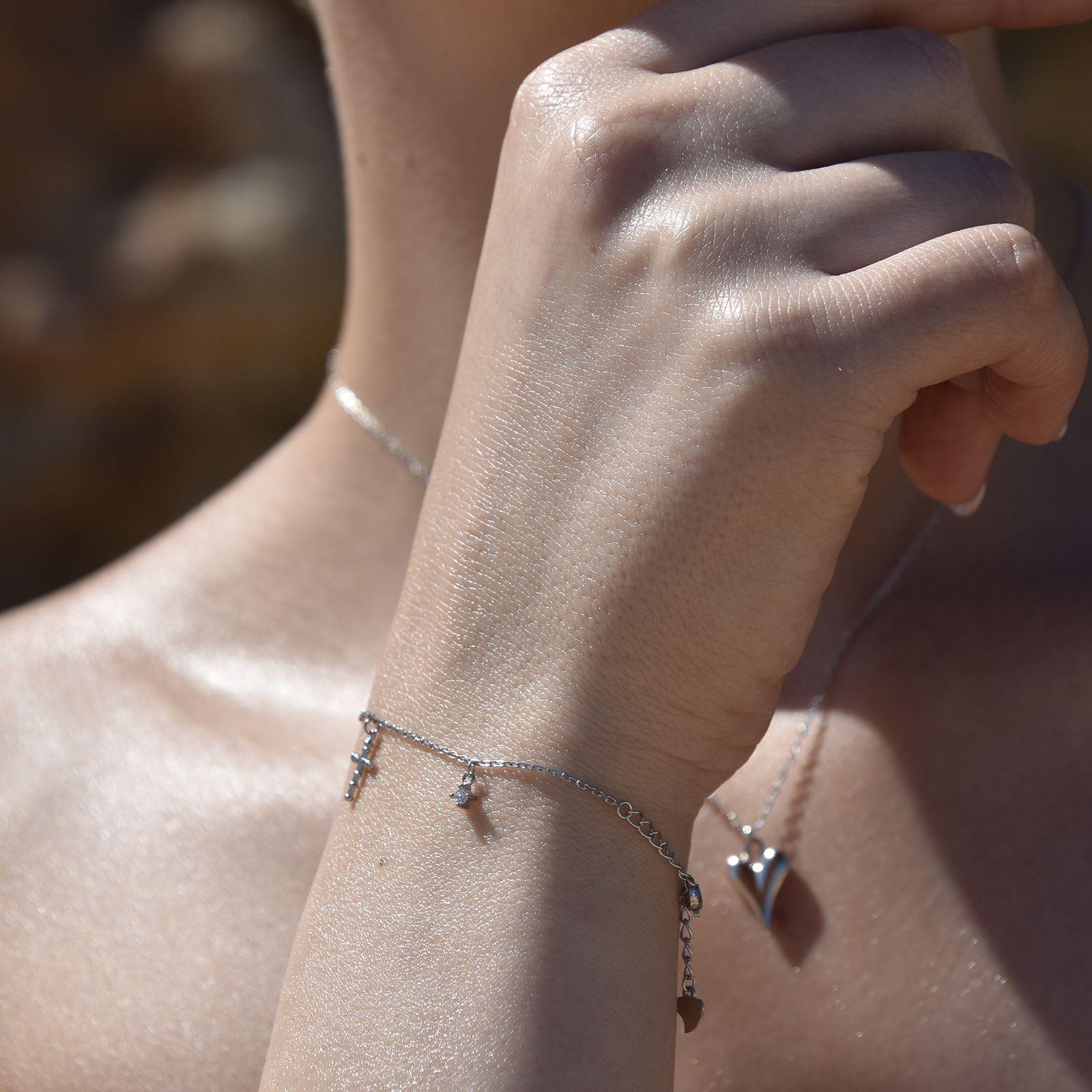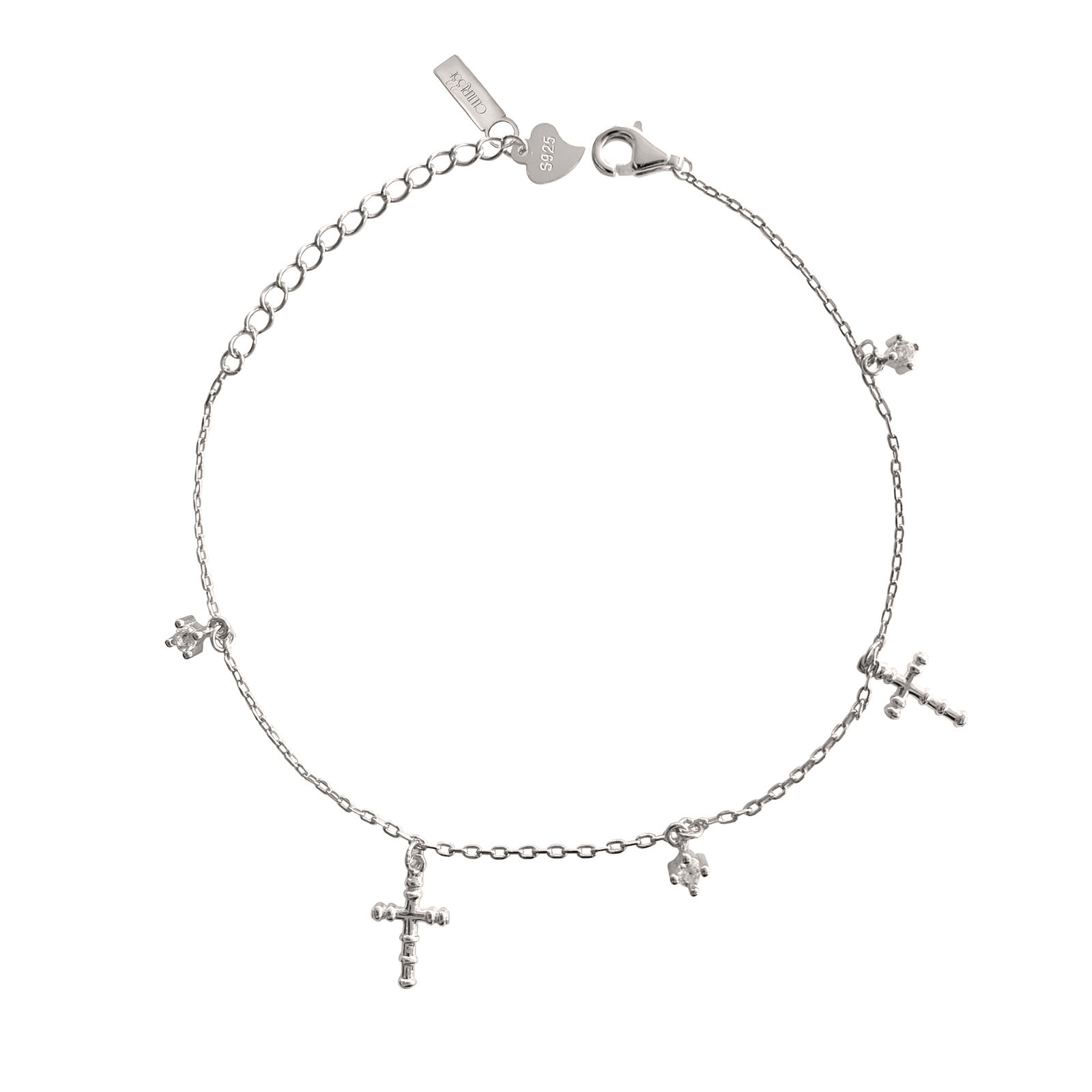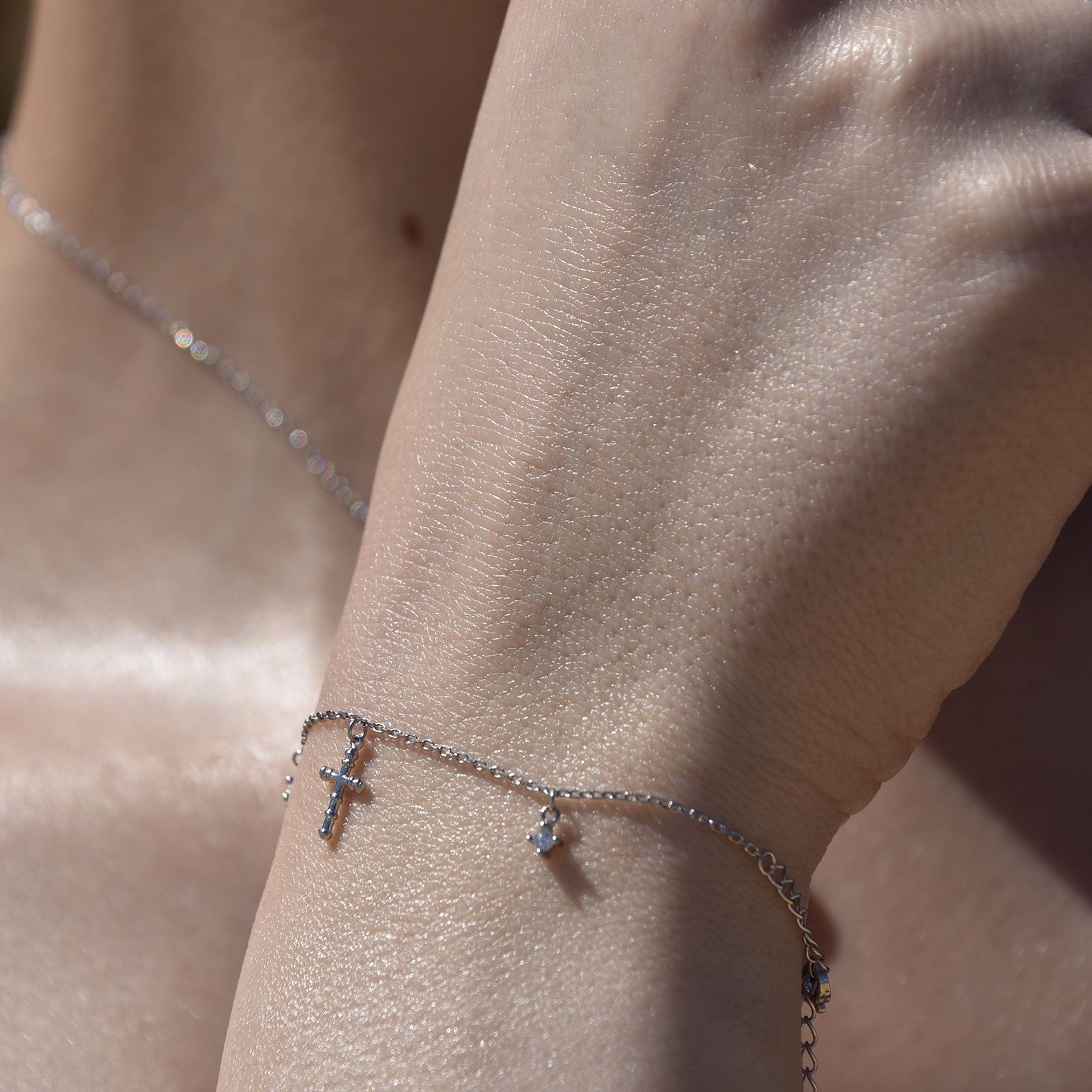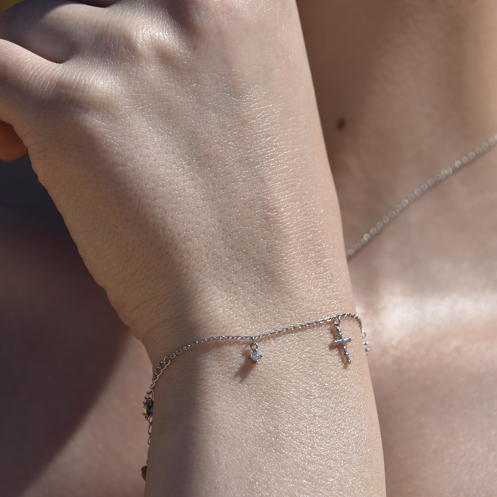 Chic, refined and detail rich. Introducing Adina Fine Diamante Cross Charm Bracelet (Silver) - a delicate wrist love exuding religious virtues. This design features a fine gold chain with 3 Austrian zircons and 2 cross charms evenly attached apart. This bracelet and the charms are made in solid sterling silver with rhodium plating to ensure hypoallergenic wear, durability, and an extra anti-tarnish protection. This bracelet is 19cm long including a 3.5cm adjustable link to suit your ideal fit. Perfect for modern, retro, delicate, fine, girly, religious, smart casual, casual, everyday styles and more. Perfect for wearing on its own or layering with other bracelets. Hypoallergenic, nickel, cadmium and lead free.