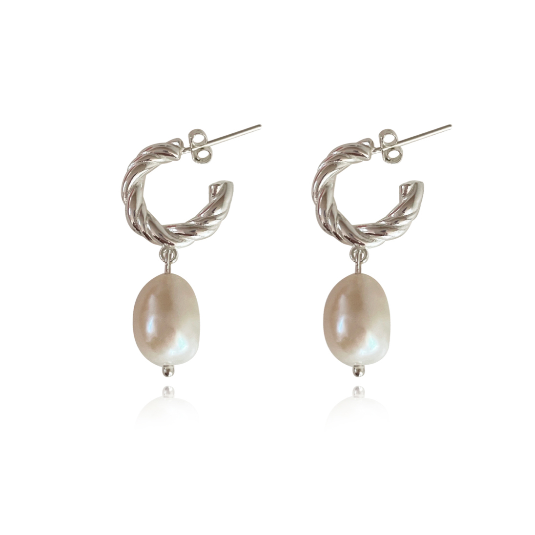 Pearl chicness that is on trend and versatile for styling. Introducing Adley Pearl Drop Earrings (Silver) - a stylish and lighthearted ear love for dress ups and dress downs. This design features twisted hoops made of solid sterling silver with a dangle of natural freshwater pearls. The earrings are of a comfortable weight for wearing long hours. A trendy and adorable pearl drop for pearl lovers of all ages. Perfect for modern, retro, coastal, summer, semi-formal, smart casual, casual styles and more. Hypoallergenic, nickel, cadmium and lead free.