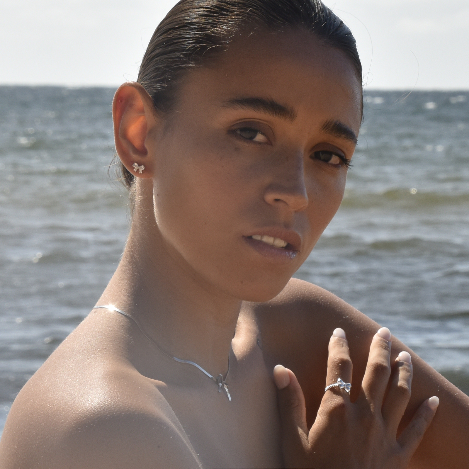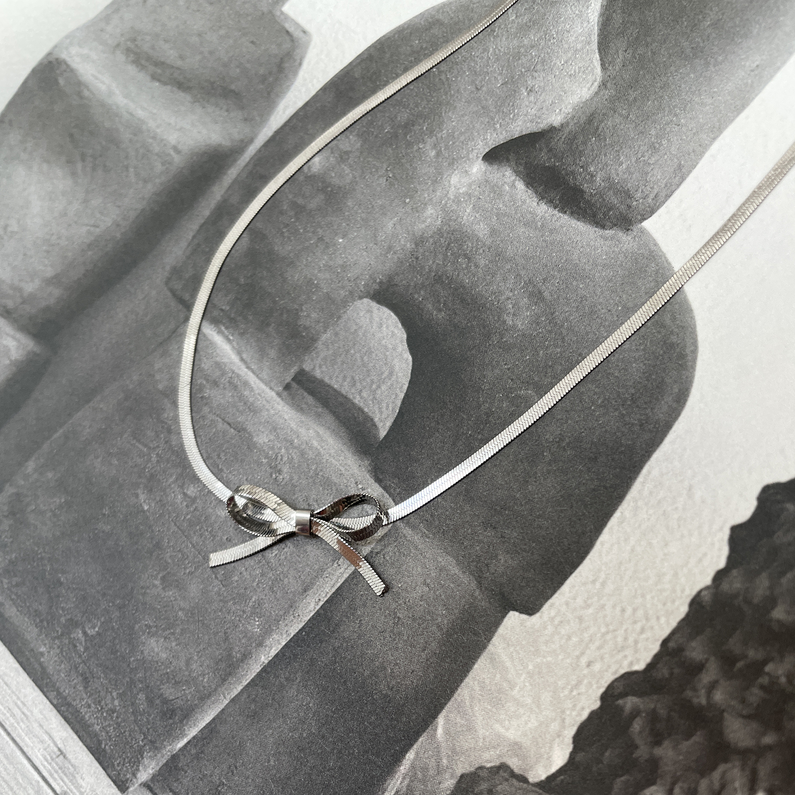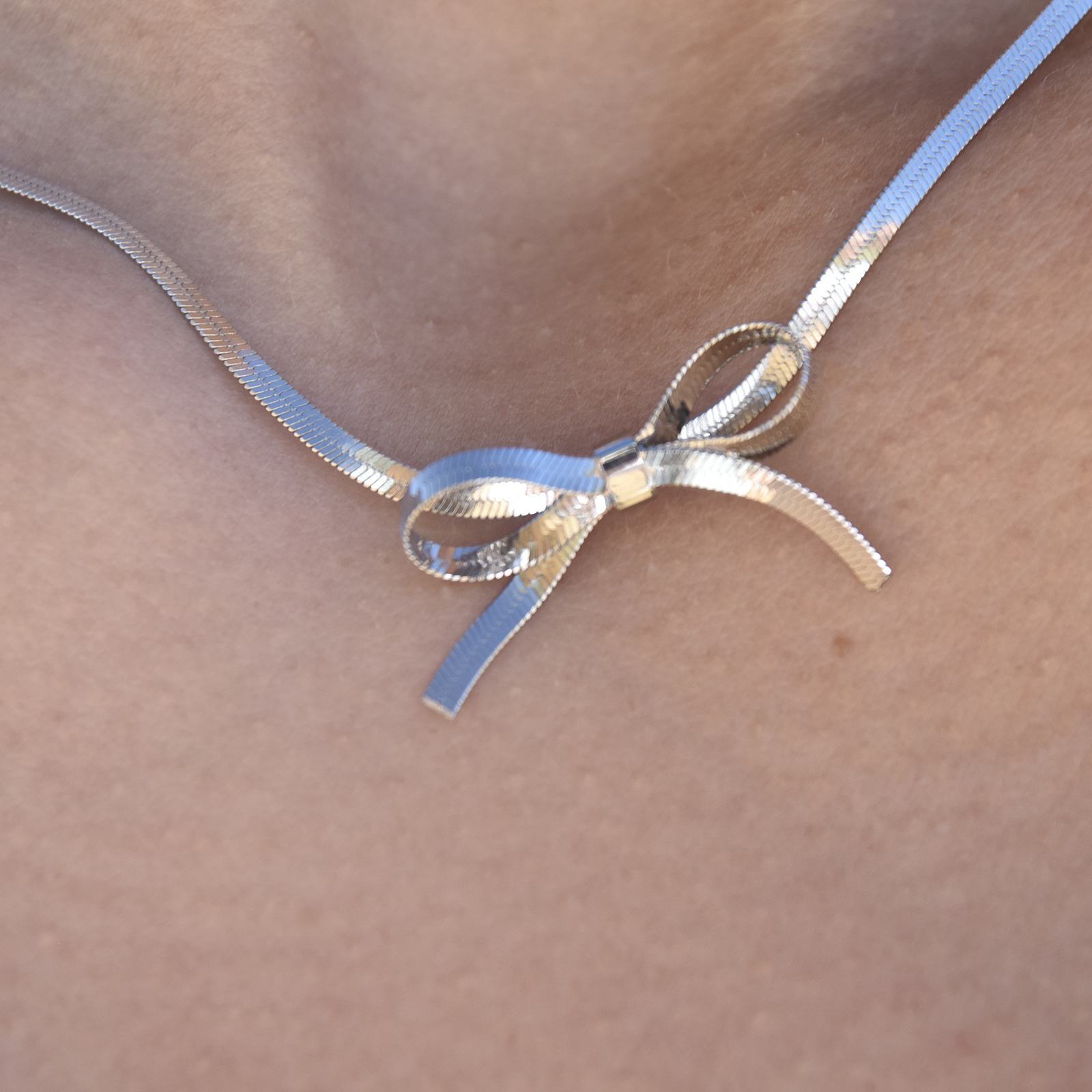 Introducing Adria Bow Tie Snake Chain Necklace (Silver) - a chic and modern neckpiece adding a feminine and playful touch to your style. This design features a gold snake chain with a bow tie in the middle. The necklace is made in environmentally friendly stainless steel. It is 36cm long including a 6cm adjustable link for a more flexible fitting. Perfect for contemporary, chic, artsy, girly, smart casual, casual, necklace layering and everyday styles. Hypoallergenic, nickel, lead, and cadmium free.