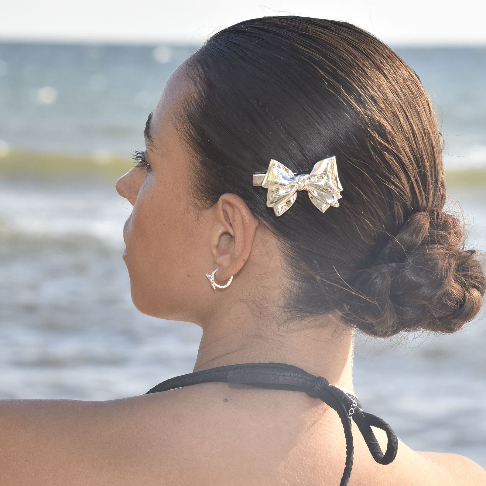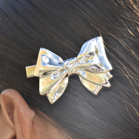 Add a sweet retro chicness and youthful energy to your styling. Introducing Adriel Bow Tie Hair Clip - a vintage inspired hair accessory for those who feel forever young. This design features a chrome-plated acrylic bow clip with a metal alligator clip underneath. It is easy to clip on and off and is of a comfortable weight to wear long hours. Suitable for bow-lovers of all ages.