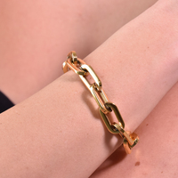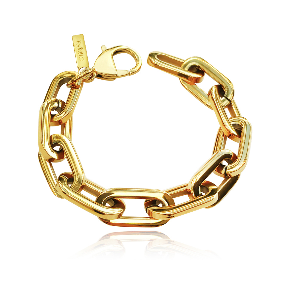 Chicness with strength. Introducing Aella Modern Muse Gold Chain Bracelet - a retro transformed punk chain with a modern chicness. This on-trend design features an inter-joined oval shaped wide link chain with a smooth polish and high shine. The bracelet is made of environmentally friendly stainless (nickel free) with 3 layers of 18k gold electroplating, forming a thick gold bond to the metal. It is versatile for styling and works well with modern, punk, chic, glamour, party, smart casual, casual styles and more. Hypoallergenic, nickel, cadmium and lead free.