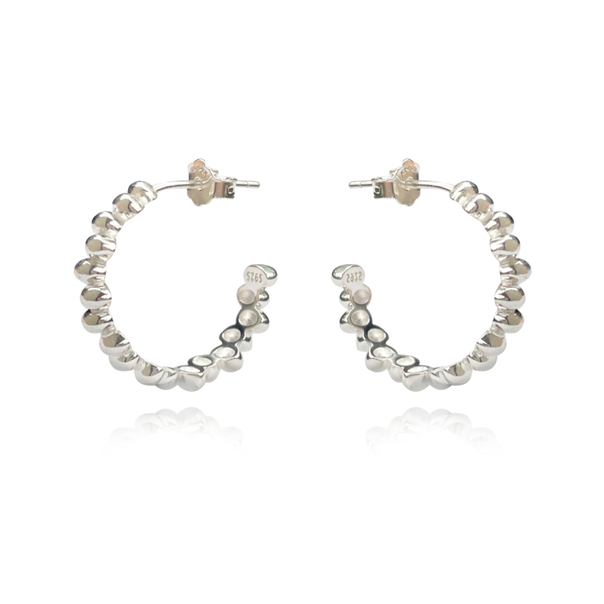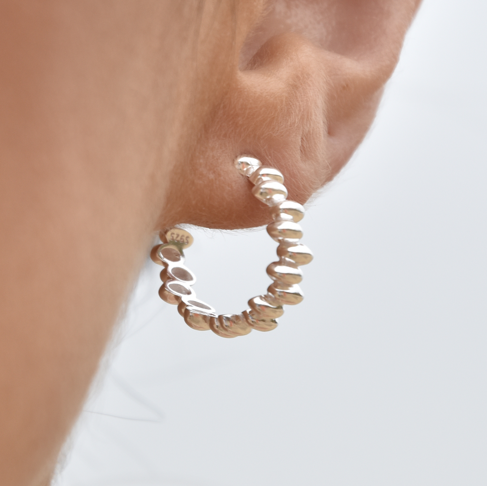 Delicate, unique and chic. Introducing Aisling Beaded C Hoop Earrings (Silver) - a contemporary artsy style ear love adding a subtle uniqueness to your everyday styling. This design features asymmetric beaded style C hoops with a smooth and shiny polish. The earrings are made in solid sterling silver with precious white rhodium plating for enduring wear and an extra anti-tarnish protection. They are of a comfortable weight to wear all day. Perfect for modern, retro, chic, trendy, earring layering, smart casual, casual, everyday styles and more. Hypoallergenic, nickel, cadmium and lead free.