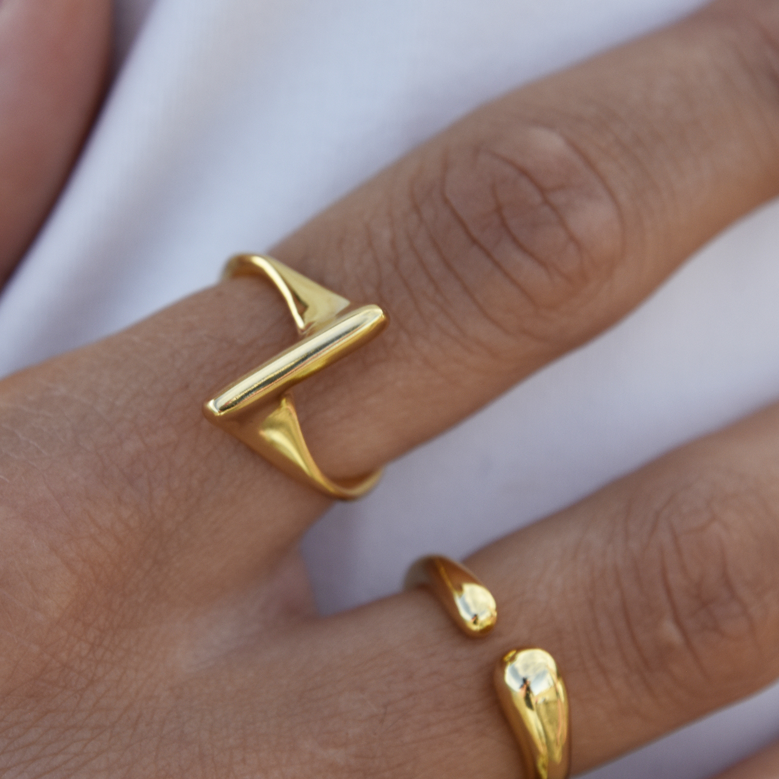 Sold OutA contemporary and succinct finger statement with a flow element. Introducing Aja Artisan Sculptural Flow Open Ring - an artisan crafted finger love inspired by modern sculpturing. This design features a vertical front line across the top with the band offset down each side. The ring is made in solid sterling silver with 2.5 microns of quality 18K gold plating (to Gold Vermeil & Premium Jewellery Standards). Due to the softness of sterling silver, this ring can be easily adjusted manually for your ideal fit. Perfect for modern, creative, chic, punk, artsy, statement, minimalist, ring stacking, smart causal, casual, everyday styles and more. Hypoallergenic, nickel, cadmium and lead free.