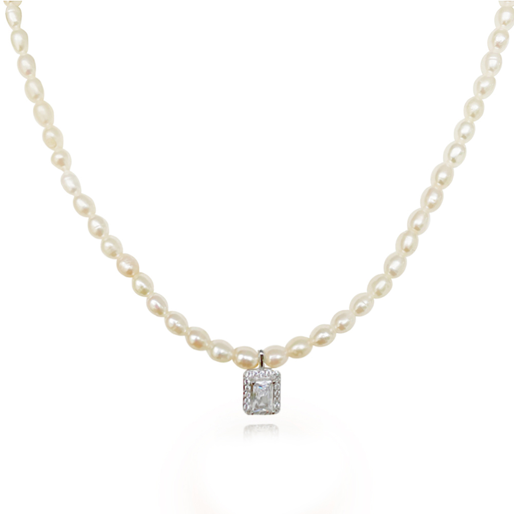 More than just pearls…pearl elegance adorned with a sparkle of Austrian zircons. Introducing Alaire Austrian Zircon Freshwater Pearl Necklace (Silver) - a timeless pearl beauty for your elevated chic styling. This design features handpicked natural freshwater pearls of constant shape, size and a gorgeous high lustre. This necklace is made of 66 natural freshwater pearls and 1 Austrian clear zircon stone embedded in a diamante embellished rectangular frame. The metal is made in solid sterling silver with rhodium plating for hypoallergenic and enduring wear. Perfect for modern, retro, coastal, dressy, chic, feminine, necklace layering, smart casual style, casual, everyday styles and more. Hypoallergenic, nickel, lead, and cadmium free.