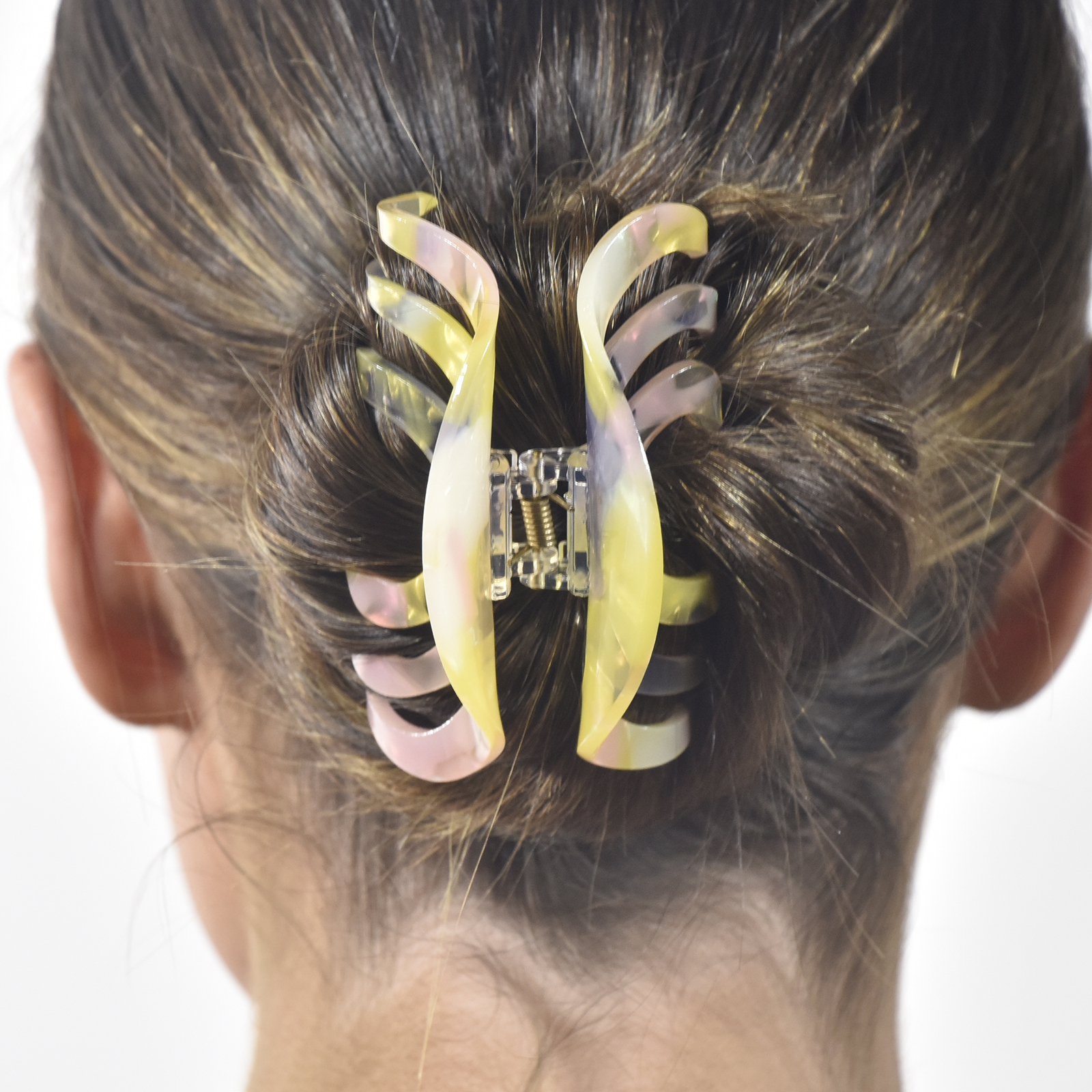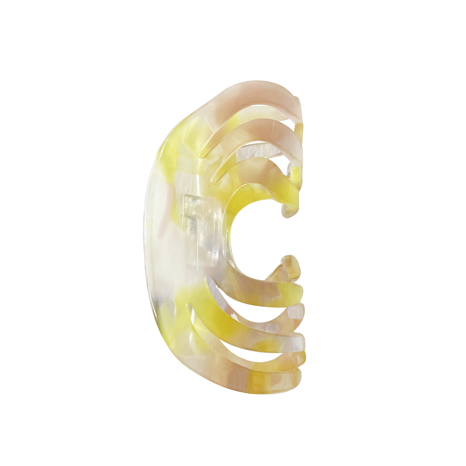 Modern, chic and unique. Introducing Alani Artsy Wave Hair Claw – a contemporary style hair claw style for women and girls of all styles. This style features a medium sized wave hair claw perfect to hold your hair in a bun or any other clip-on style. It has a translucent shimmer with a colour blend of yellow and soft peach, making it bubbly and bright for styling. A statement hair claw that makes everyday styling effortless and delightful.