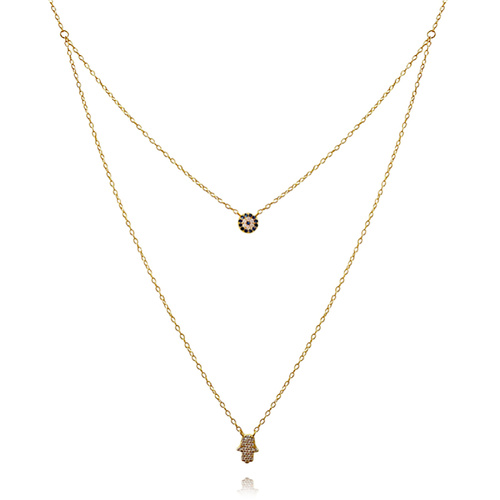 May this evil eye protect you as you go about your day. May happiness surround you and stay out of harm’s way. Introducing Alara Luck Evil Eye Layering Necklace (Gold) - a delicate and layered fine piece featuring a round blue zircon evil eye and a hand evil eye made of quality Austrian zircons. The round evil eye has a blue zircon in the centre, surrounded by a ring of clear zircons and another ring of blue zircons. The hand evil eye is fully embellished with pave zircons. This necklace is made in sterling silver with 18ct gold plating for enduring and hypoallergenic everyday wear. Perfect for layering and all personal styles, and especially for evil eye lovers. This necklace is 45cm long including a 5cm adjustable link for a more flexible personal fit. Hypoallergenic, nickel, lead, and cadmium free. Available in 18ct gold or silver.