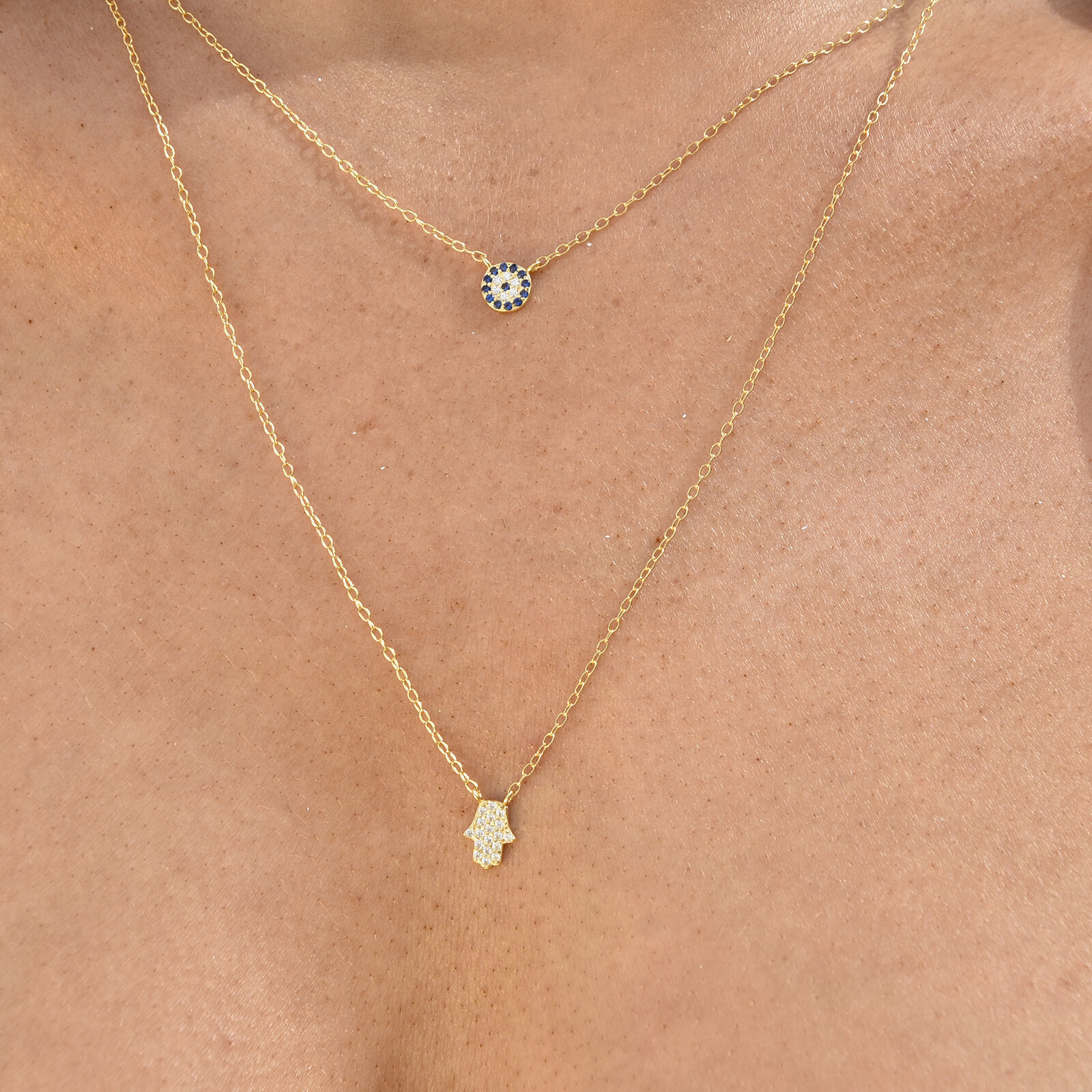May this evil eye protect you as you go about your day. May happiness surround you and stay out of harm’s way. Introducing Alara Luck Evil Eye Layering Necklace (Gold) - a delicate and layered fine piece featuring a round blue zircon evil eye and a hand evil eye made of quality Austrian zircons. The round evil eye has a blue zircon in the centre, surrounded by a ring of clear zircons and another ring of blue zircons. The hand evil eye is fully embellished with pave zircons. This necklace is made in sterling silver with 18ct gold plating for enduring and hypoallergenic everyday wear. Perfect for layering and all personal styles, and especially for evil eye lovers. This necklace is 45cm long including a 5cm adjustable link for a more flexible personal fit. Hypoallergenic, nickel, lead, and cadmium free. Available in 18ct gold or silver.