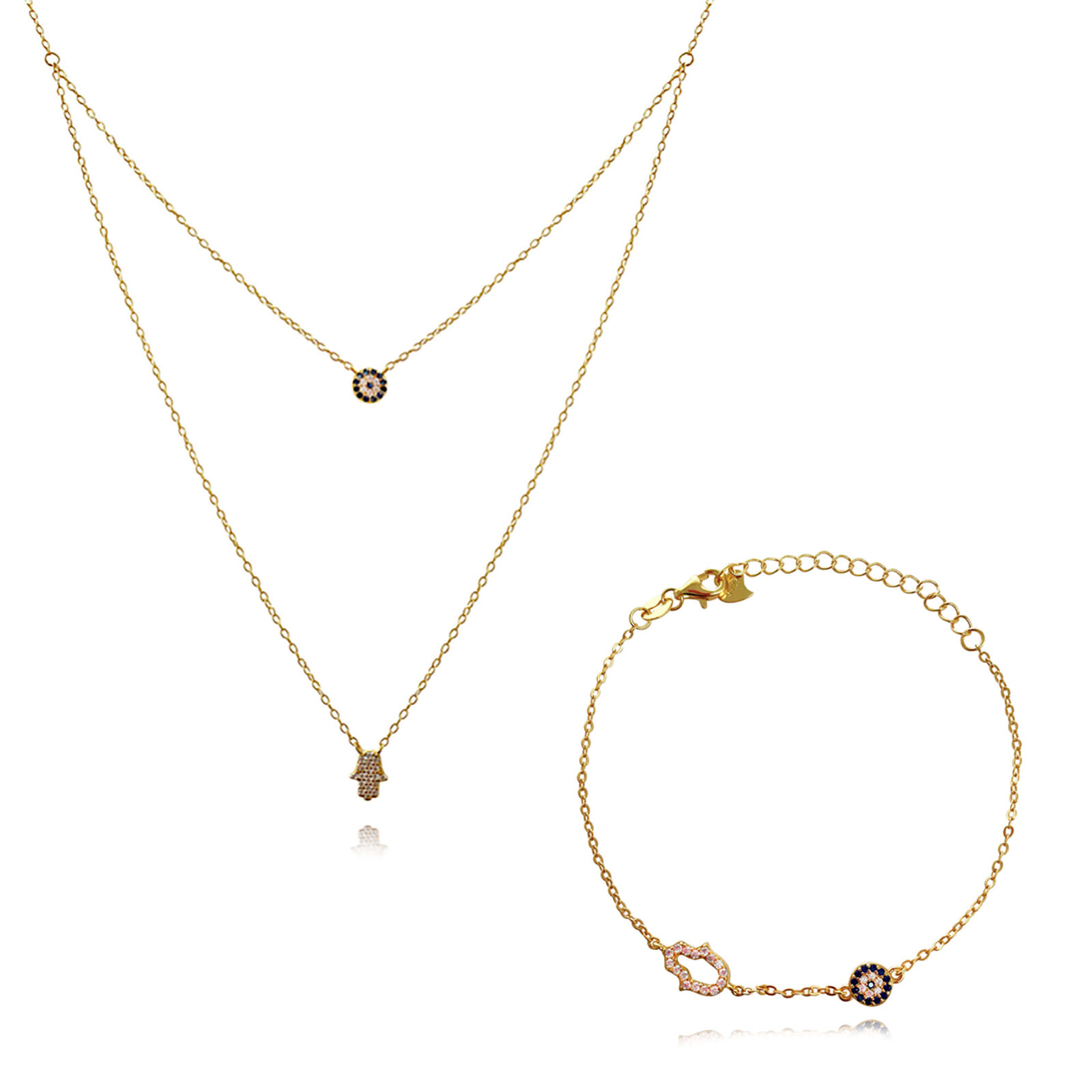 This Gift Set includes: Alara Luck Evil Eye Layering Necklace (Gold) + Azra Luck Evil Eye Bracelet (Gold)