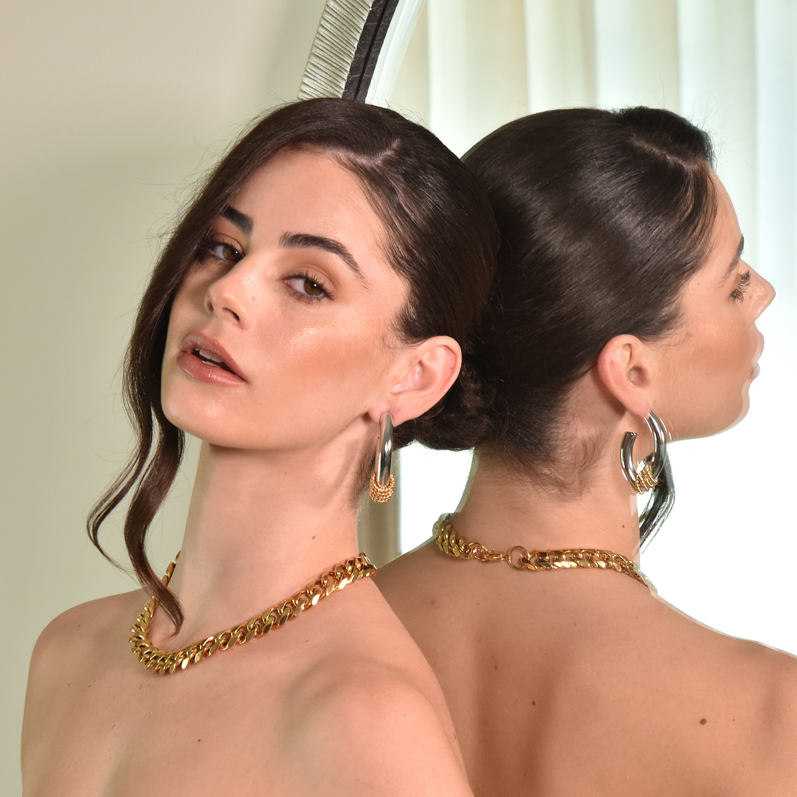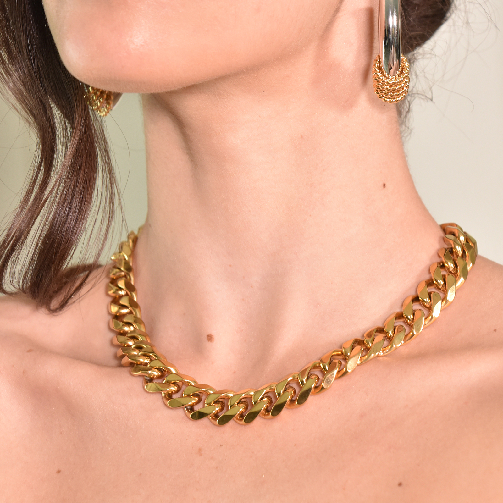 Femininity with strength. Introducing Alek Modern Muse Gold Chain Necklace - a statement neckpiece for modern fashionistas who dare to make their attitude shine. The design features a classic cuban chain with widened width. The necklace is made of titanium steel for higher durability. It is plated with 3 layers of 18k gold electroplating forming a thick gold bond to the metal. A quality statement to interpret modern femininity. Perfect for modern, retro, punk, chic, high fashion, smart causal, casual styles and more.