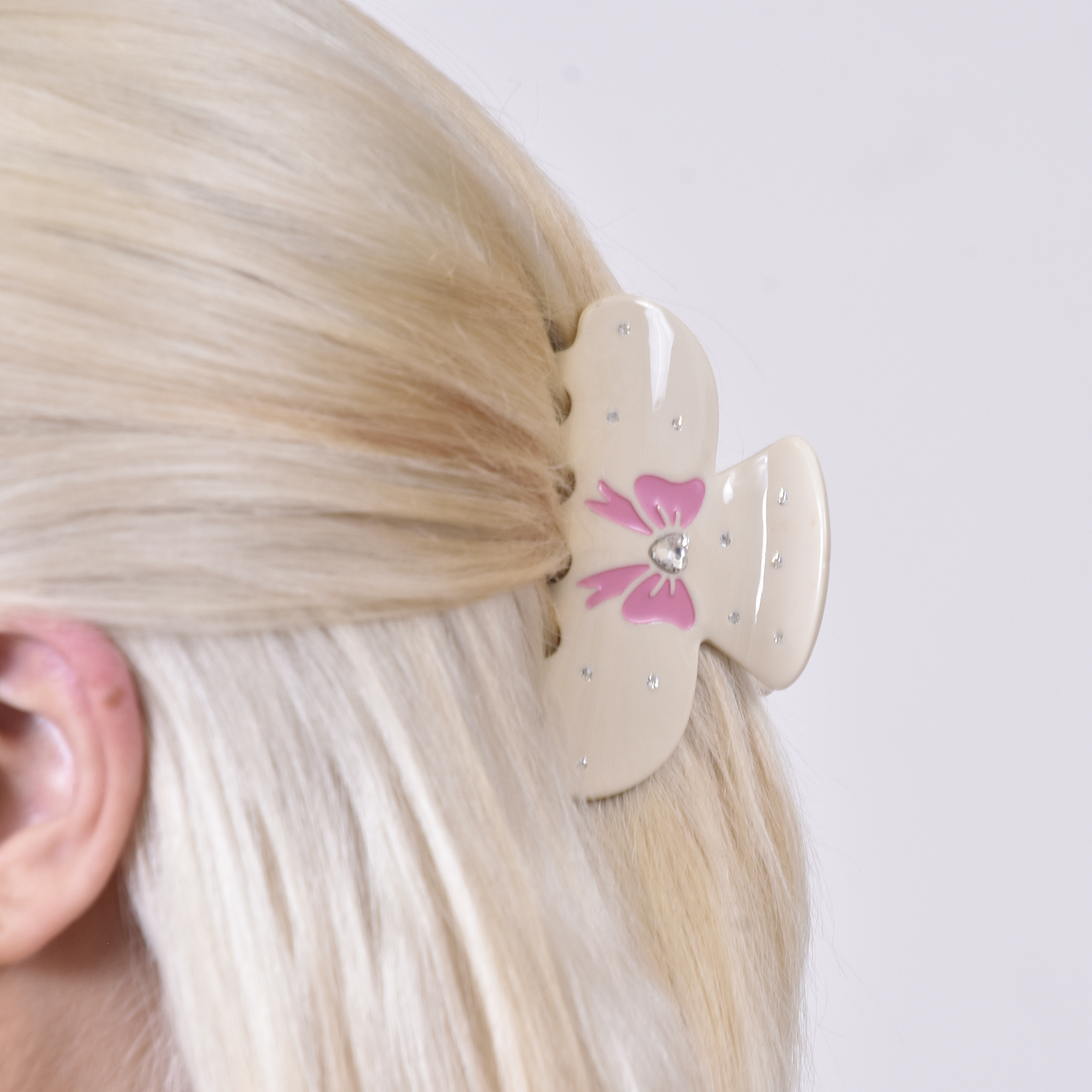 Bows cheer me up. Introducing Alessia Bow Print Hair Claw - a sweet and slightly flamboyant hair cutie for bow lovers. This hair claw is made of thickened acrylic in a beige base colour decorated with shimmering zirconias and rhinestones. This claw is approximately 72mm in length and features one pink bow print on each side of the claw. It offers a solid grasp of hair. Suitable for modern, retro, chic, feminine, girly, smart casual, casual, and everyday wear.