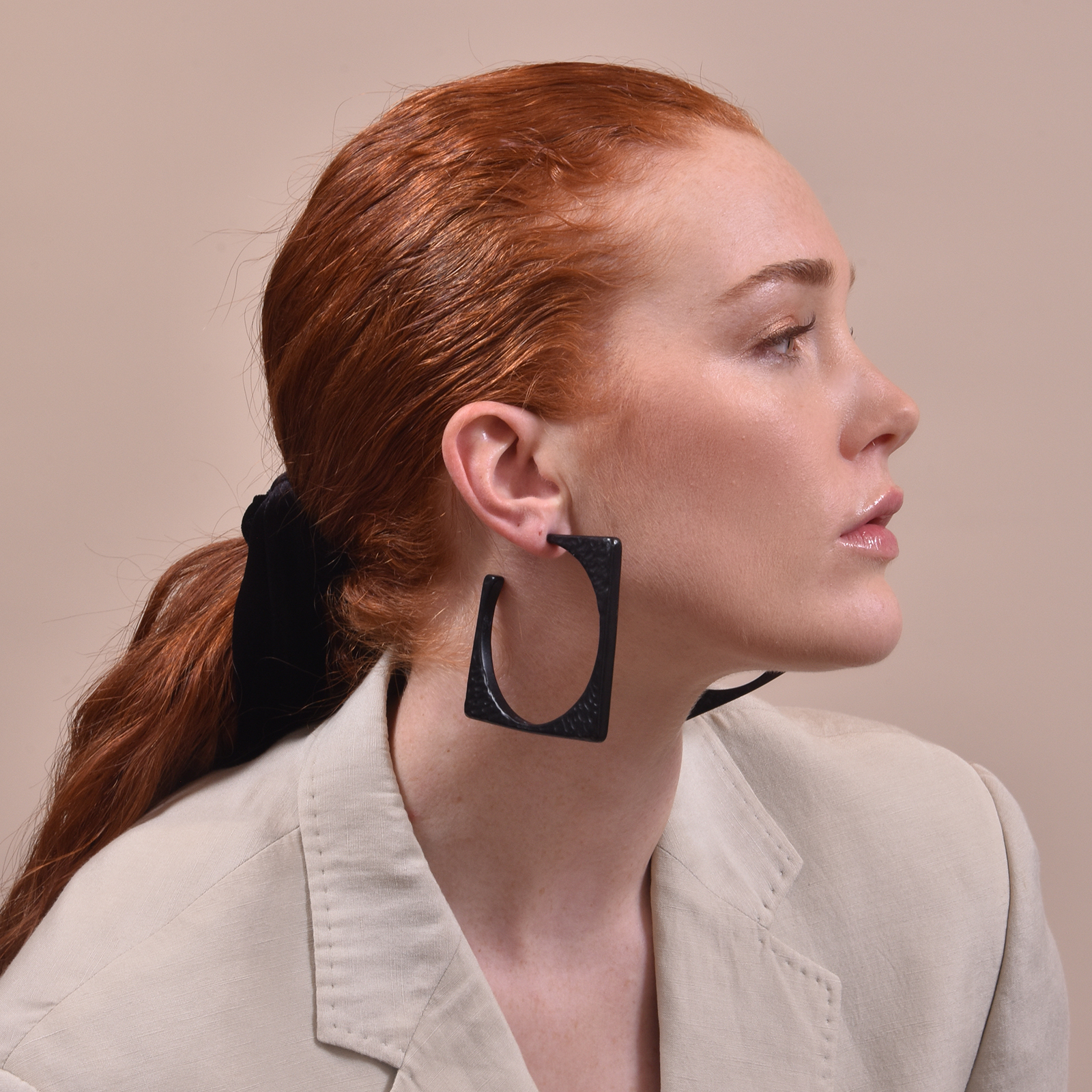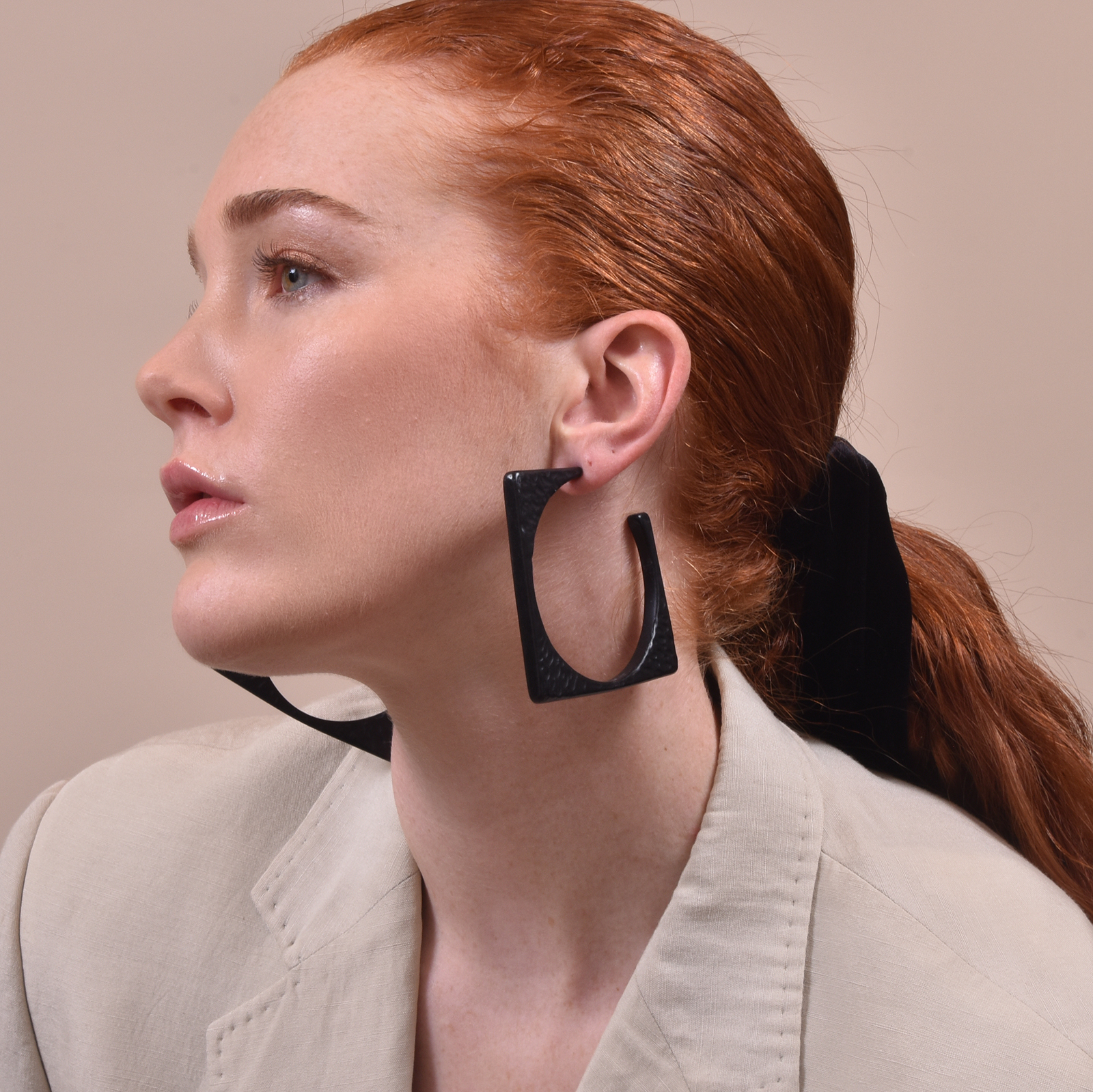 Punk, bold and eye-catching, Alia Geo Shape Statement Earrings are such a simple yet expressive design that draws attention in no time. The simple geo shape and textured black colour make this design a unique statement piece. Perfect for punk, street, fashion events, runway and minimalist styles.
