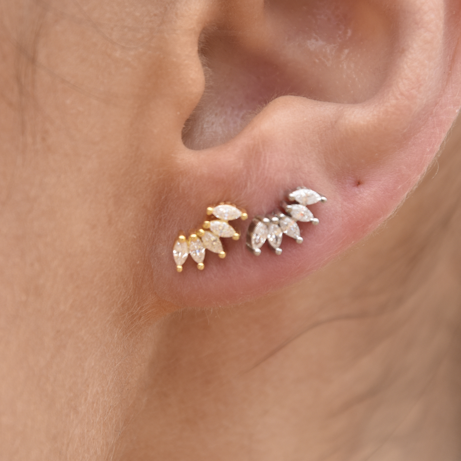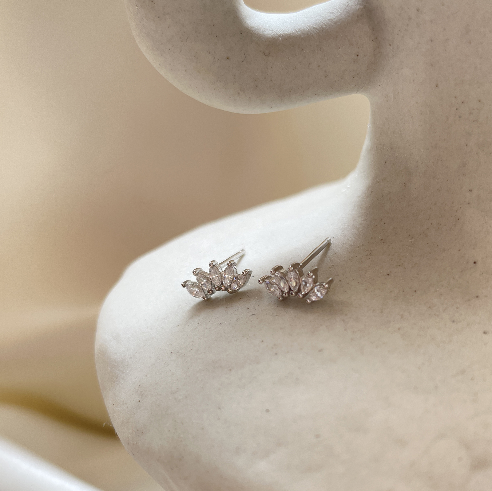 Dainty, chic, with a playful and tasteful vibe. Introducing Aliz Zircon Arc Stud Earrings (Silver) - a contemporary style stud love for a subtle shimmer and sparkle. This design features Austrian clear zircons clustered together in a curve. The earrings are made of solid sterling silver for hypoallergenic wear. Suitable for women and girls of all ages. Perfect for dainty, chic, feminine, minimalist, earring layering, smart casual, causal, everyday styles and more. Hypoallergenic, nickel, cadmium and lead free.