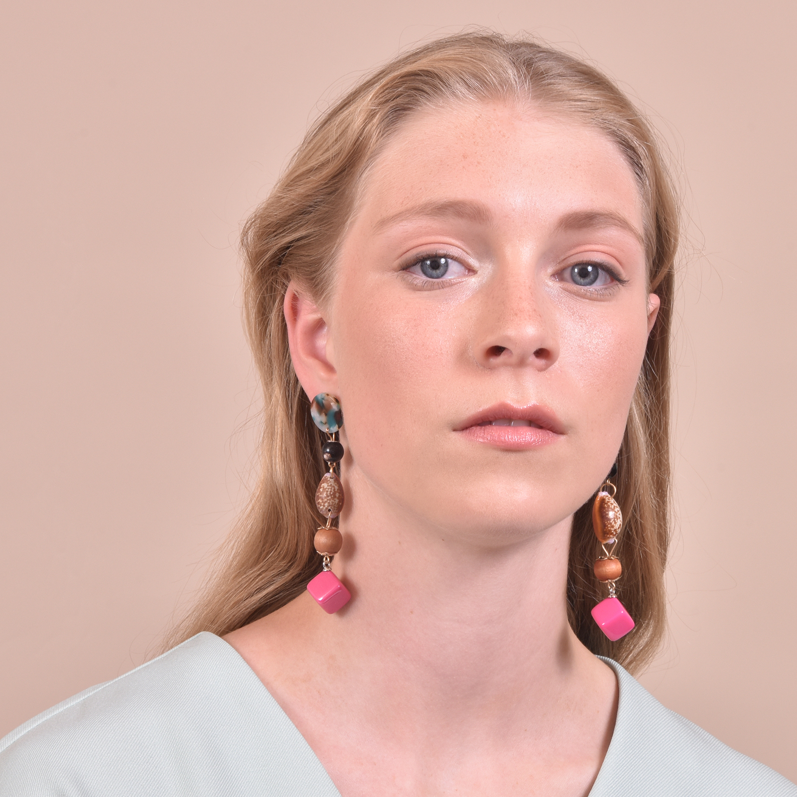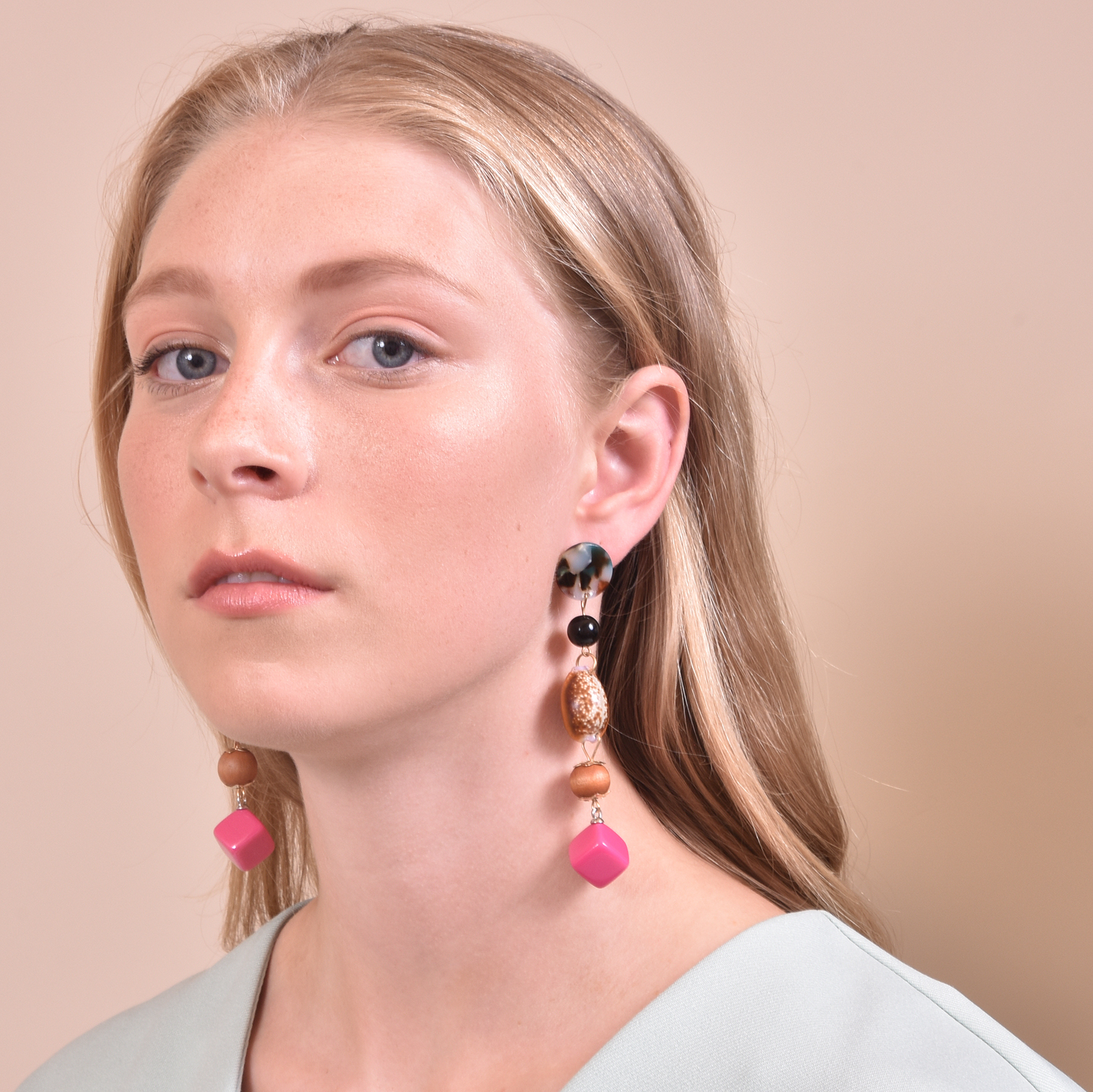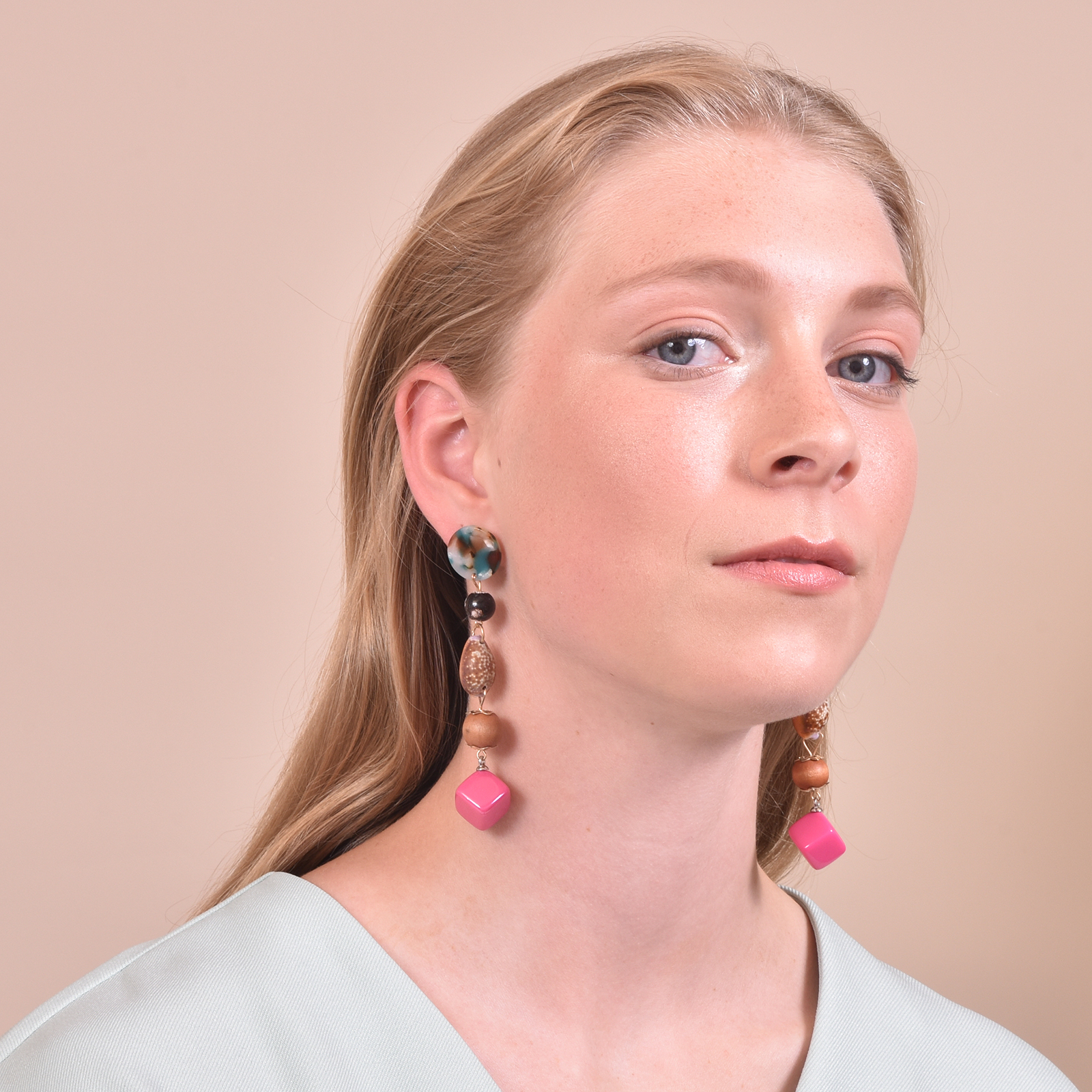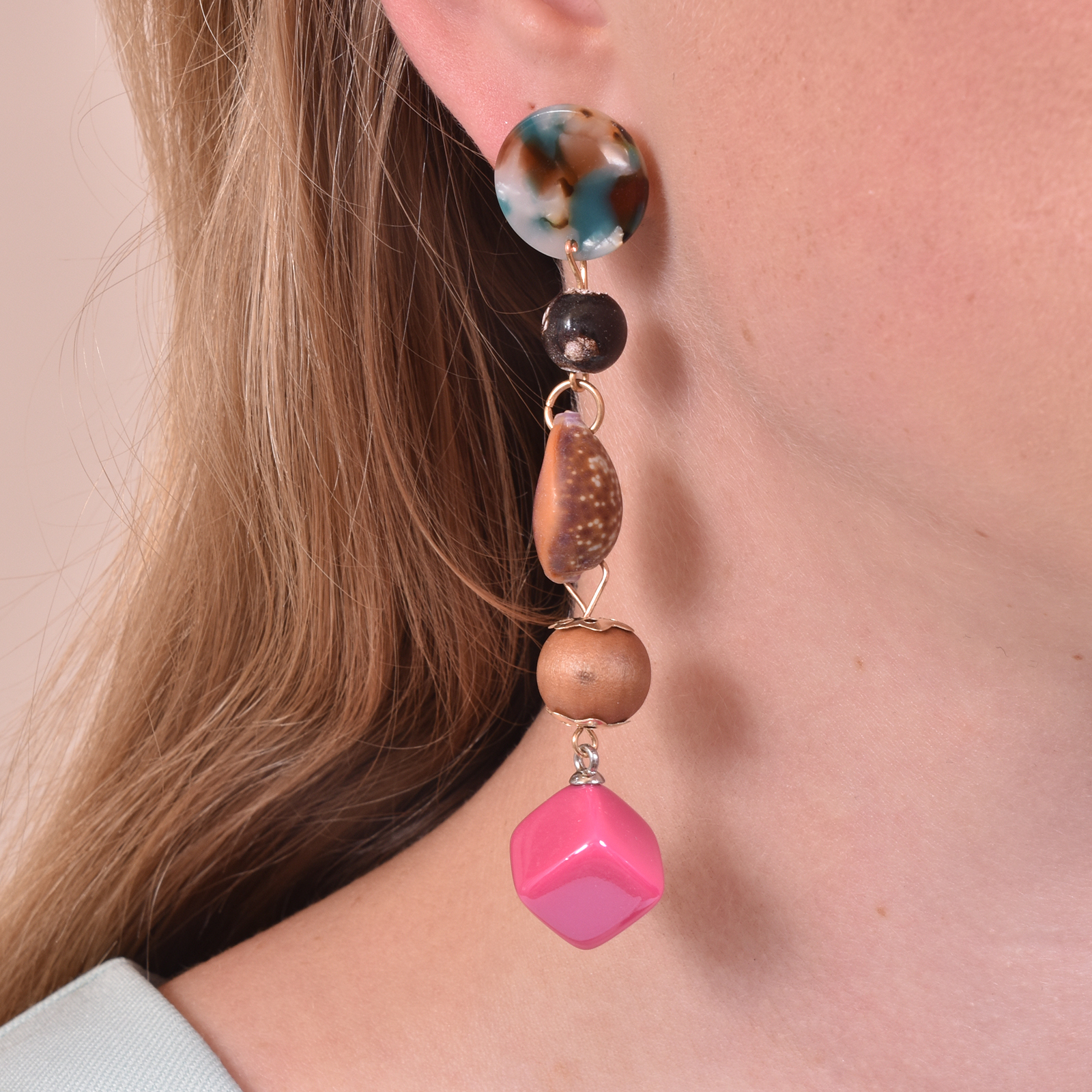Combined dangle earrings with push back closure, this design is inspired by island cultures where treasures from the ocean are collected and crafted to express an appreciation of beauty and creativity.