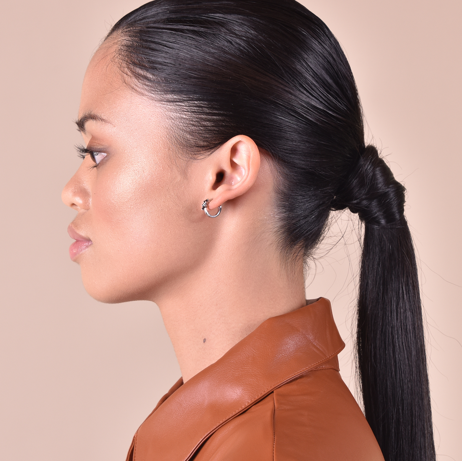 Versatile everyday style hoops with a pinch of edginess. Introducing Alma Minimalist Silver Hoop Earrings - a contemporary style ear love for those who prefer something a little out of the ordinary. This design features 3 black zirconia stones embedded on the front of each earring, adding a subtle strength to traditional silver hoops. The earrings are made of solid sterling silver for durability and hypoallergenic wear. Perfect for dainty, fine, minimalist, punk, earring layering, casual, everyday styles and more. Suitable for women and girls of all ages. Hypoallergenic, nickel, cadmium and lead free.