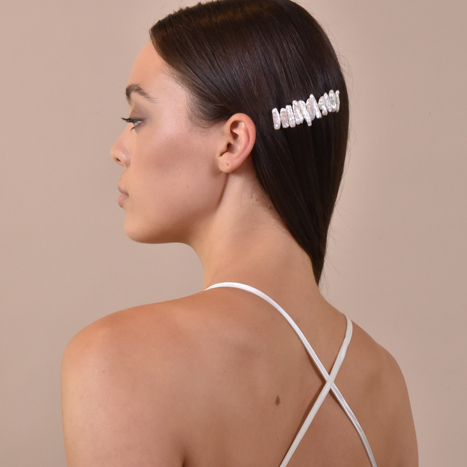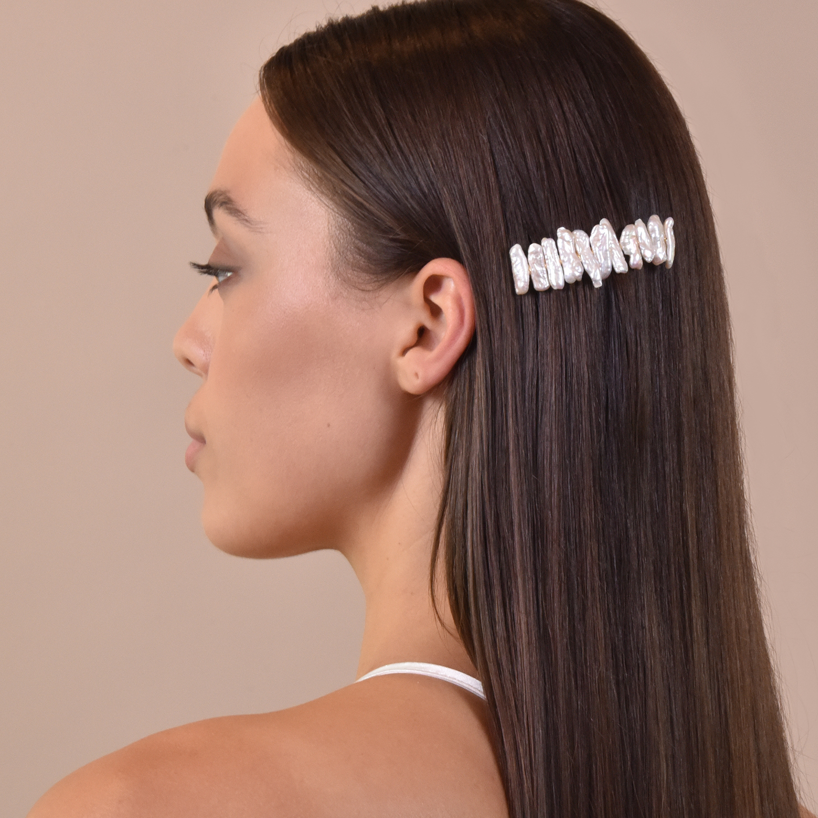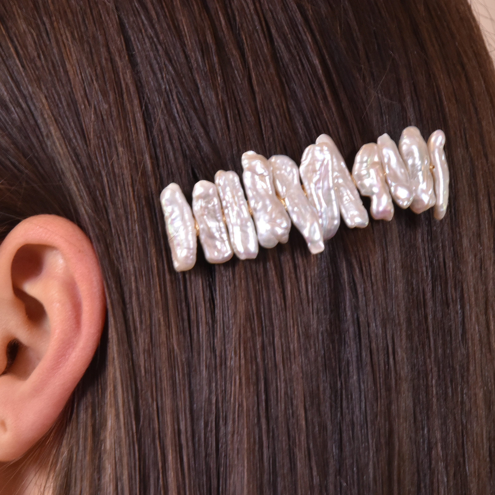 Modern pearl classiness with a luxurious touch. Introducing Alora Baroque Pearl Barrette — a hand assembled pearl beauty for your elevated elegance. This barrette features handpicked natural stick baroque pearls with smooth surface and high stunning lustre. Each pearl is natural and authentic in shape. The pearls are manually wound with gold wires attached to a spring barrette crafted in environmentally friendly stainless steel with 14K flash gold. Perfect for bridal, wedding, formal, semi-formal, boho, coastal, summer, feminine styles and more.