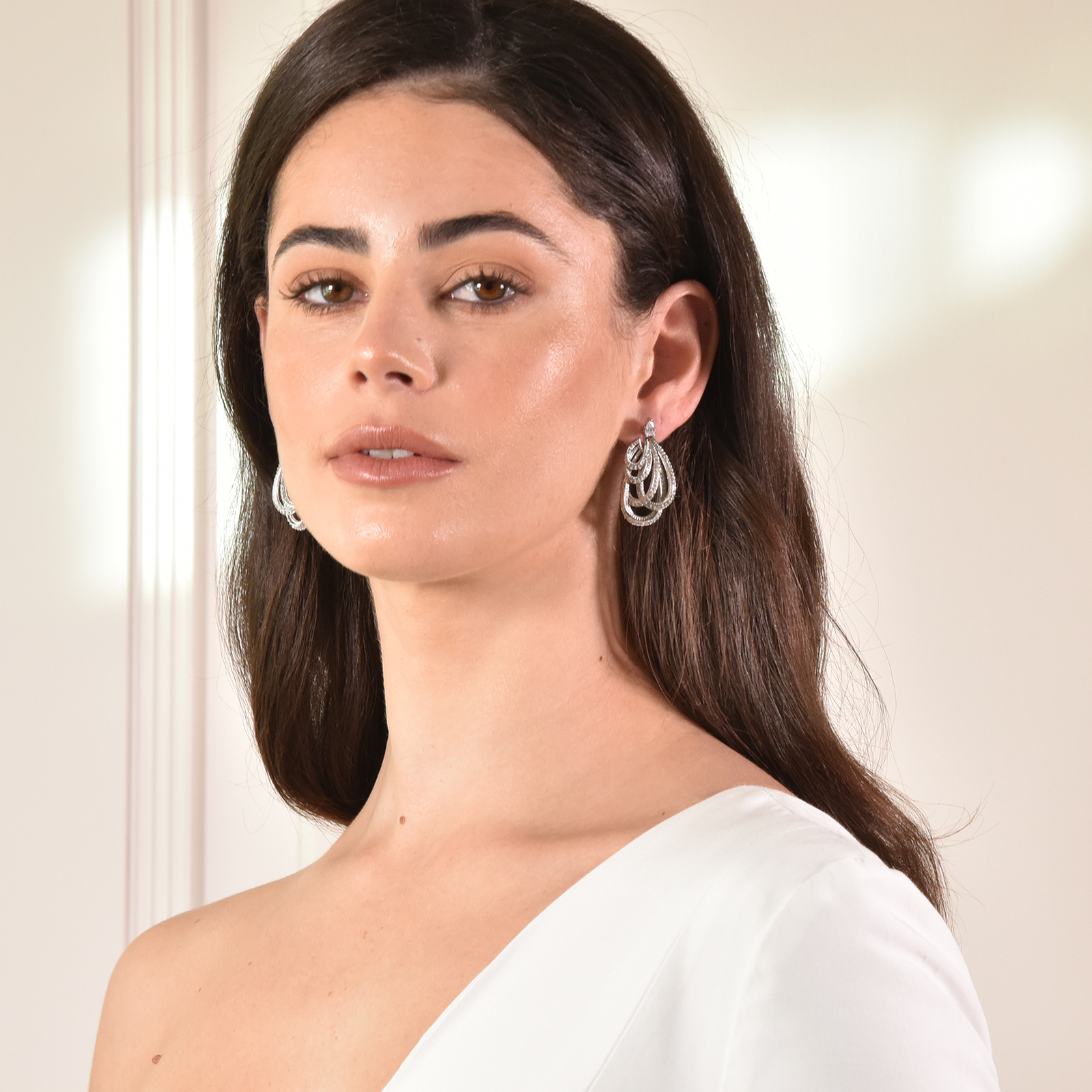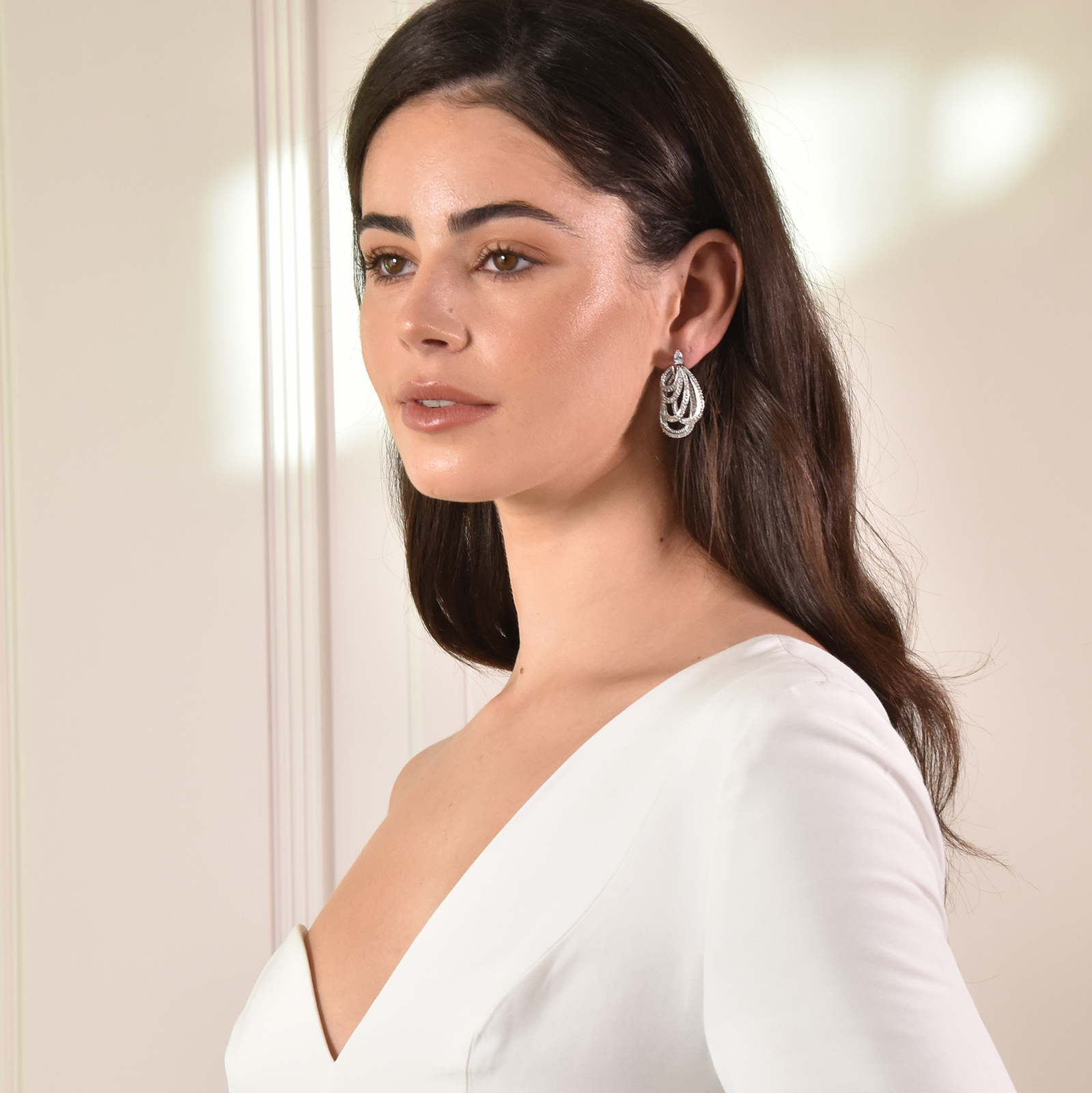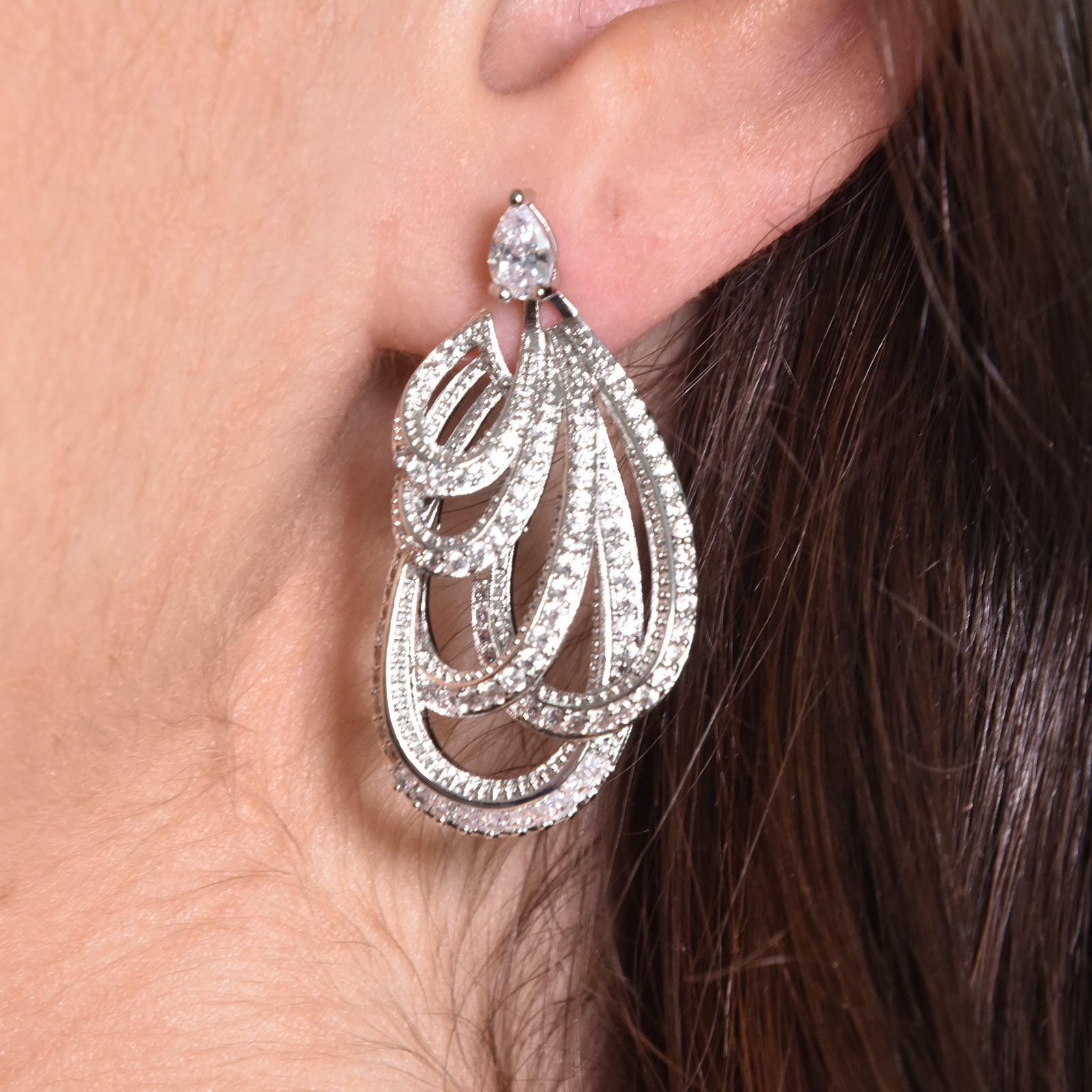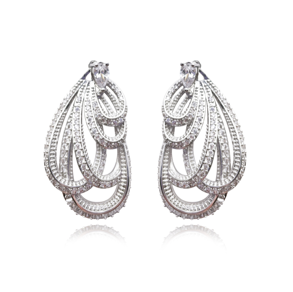 Red carpet earring style effortlessly done. Introducing Alora Glamour Ready Zircon Loop Earrings - a high end glamorous ear love delicately made with details. This deign features artistically laid out multi loops fully embellished with quality Austrian zircons. The top of the earring features a single Austrian zircon which can also be detached and worn as a separate stud earring. The earrings are made of environmentally friendly brass with rhodium plating, made for quality and durability. A sophisticated and eye-catching ear art speaking of grace and elegance. Perfect for formal, semi-formal, wedding, bridal, red carpet, dressy, celebrity styling, creative styling, cocktail, high tea, racing styles, special occasions and more. Hypoallergenic, nickel, cadmium and lead free.