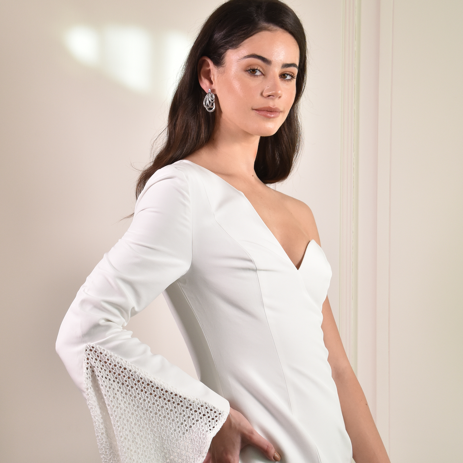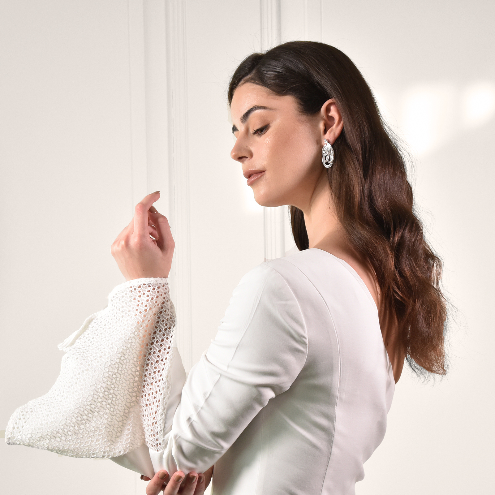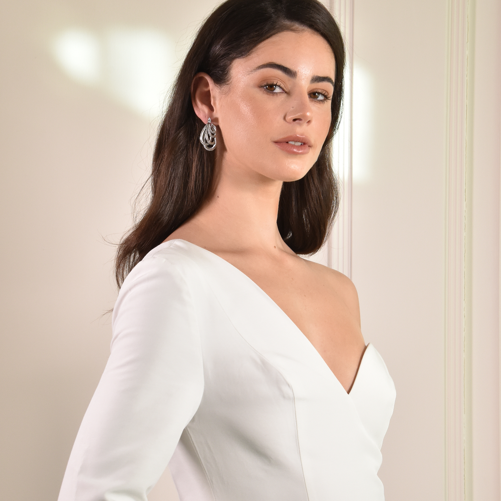 Red carpet earring style effortlessly done. Introducing Alora Glamour Ready Zircon Loop Earrings - a high end glamorous ear love delicately made with details. This deign features artistically laid out multi loops fully embellished with quality Austrian zircons. The top of the earring features a single Austrian zircon which can also be detached and worn as a separate stud earring. The earrings are made of environmentally friendly brass with rhodium plating, made for quality and durability. A sophisticated and eye-catching ear art speaking of grace and elegance. Perfect for formal, semi-formal, wedding, bridal, red carpet, dressy, celebrity styling, creative styling, cocktail, high tea, racing styles, special occasions and more. Hypoallergenic, nickel, cadmium and lead free.