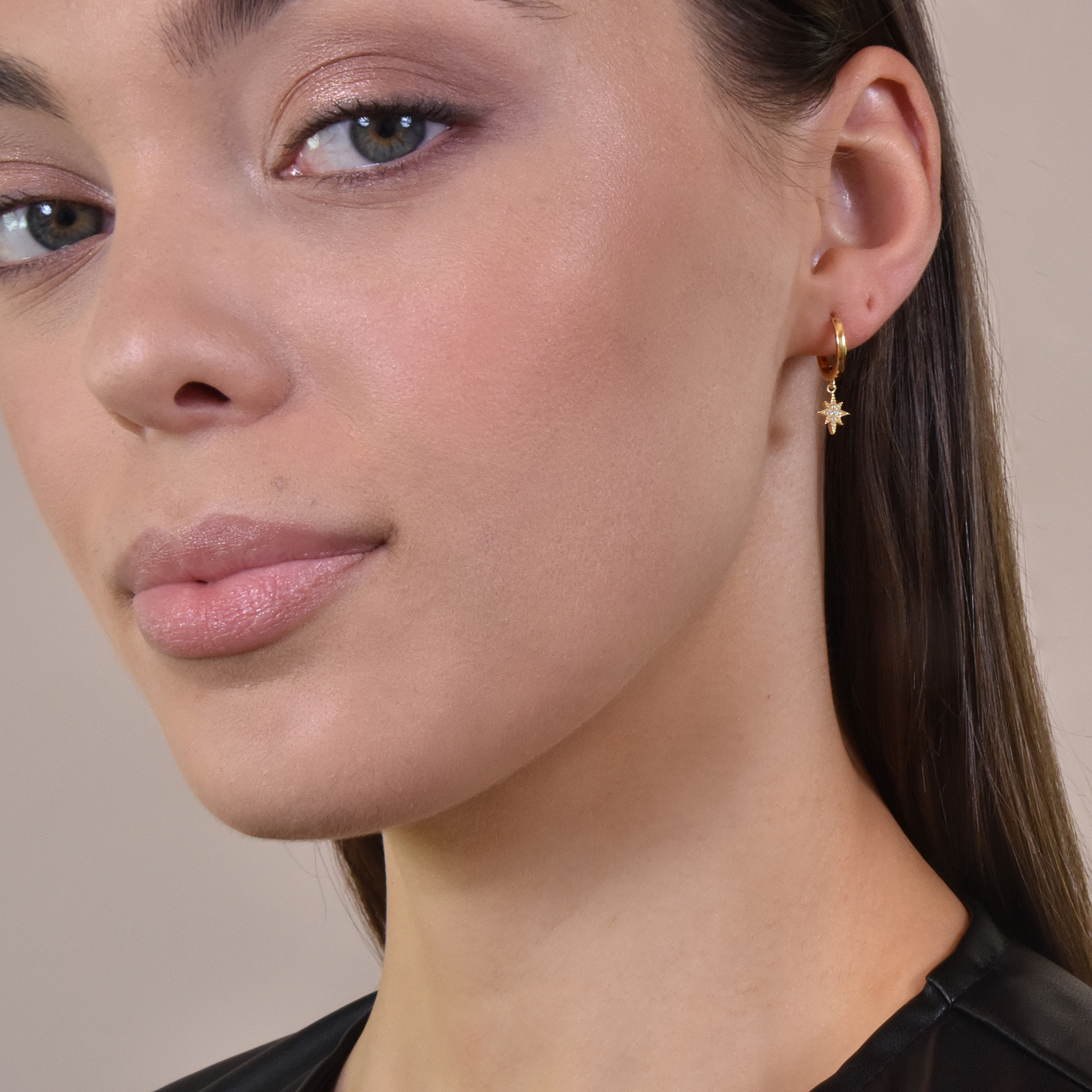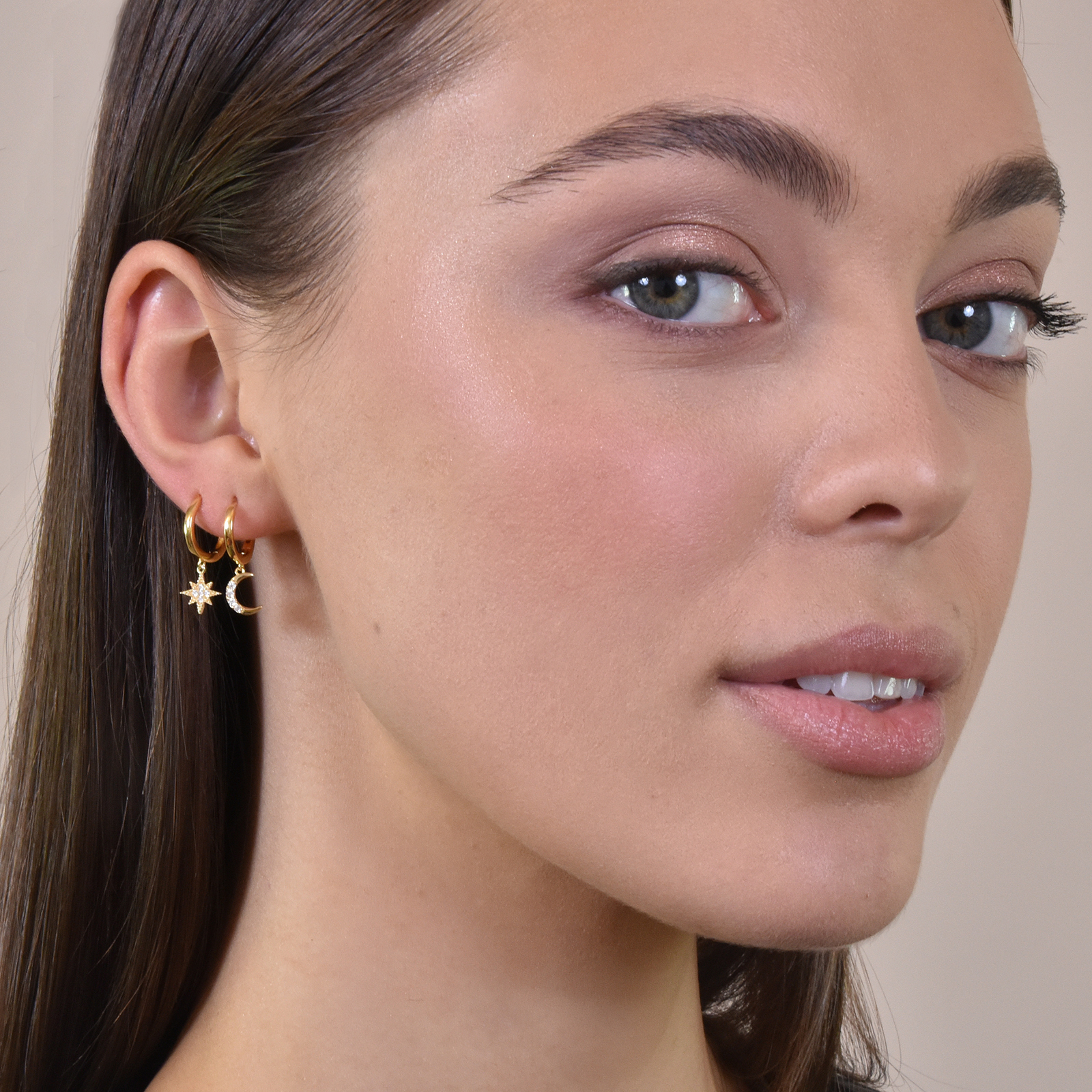 Aesthetically pleasing and adorable. Introducing Alula Celestial Beauty Mismatching Earrings - a trendy and durable earring style for women and girls of all ages. This design features a mismatching pair of star and moon drop earrings, with the star and moon drops embellished with cubic zirconias to fine detail. The earrings are made of solid sterling silver with 18k gold plating for a subtle gold shine. Perfect for modern, chic, retro, girly, minimalist, earring layering, casual, everyday styles and more. Hypoallergenic, nickel, cadmium and lead free.