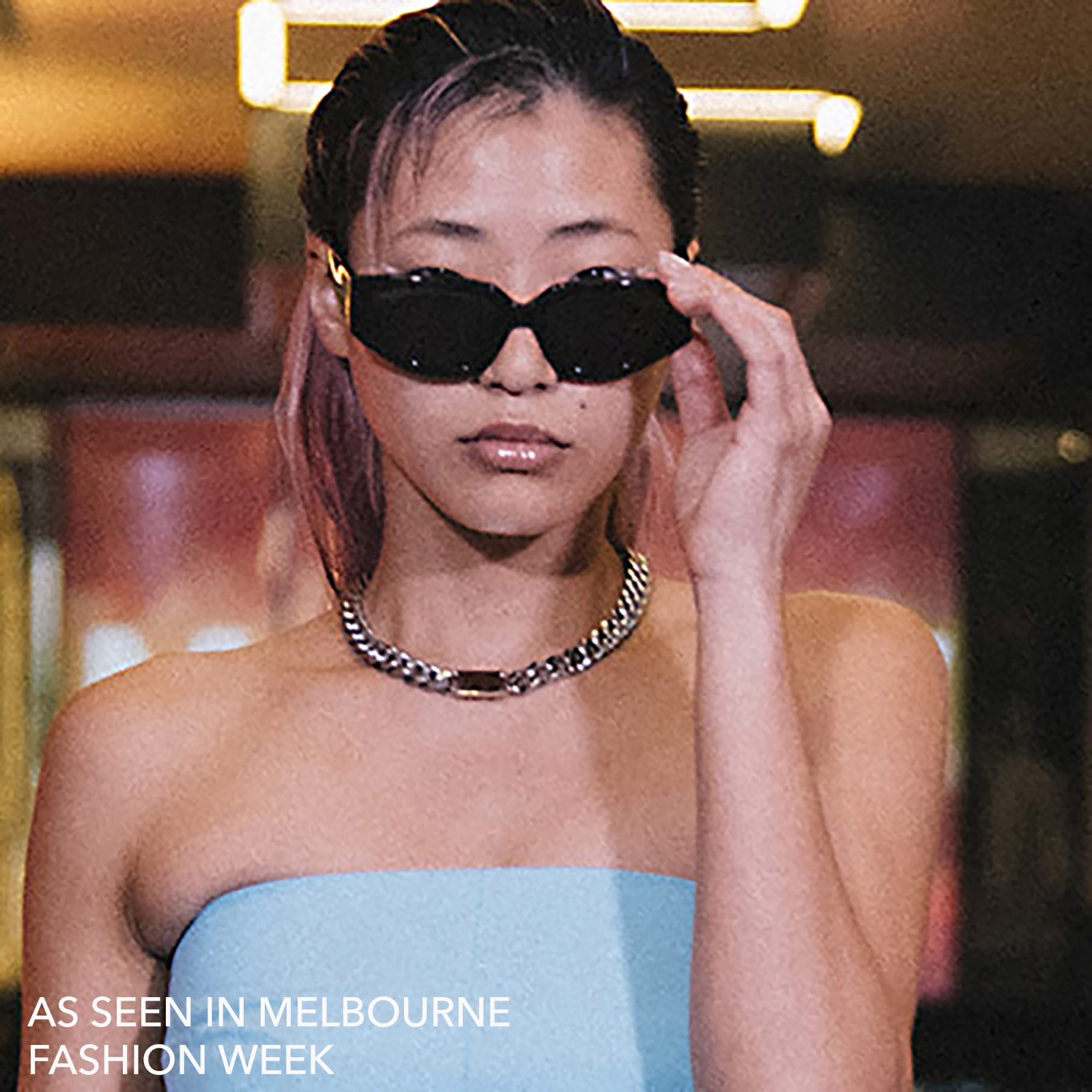 This necklace is 43.5cm long. Please kindly note that the position of the necklace sitting on your chest can vary from individual to individual depending on your top size. Model is a size 8.