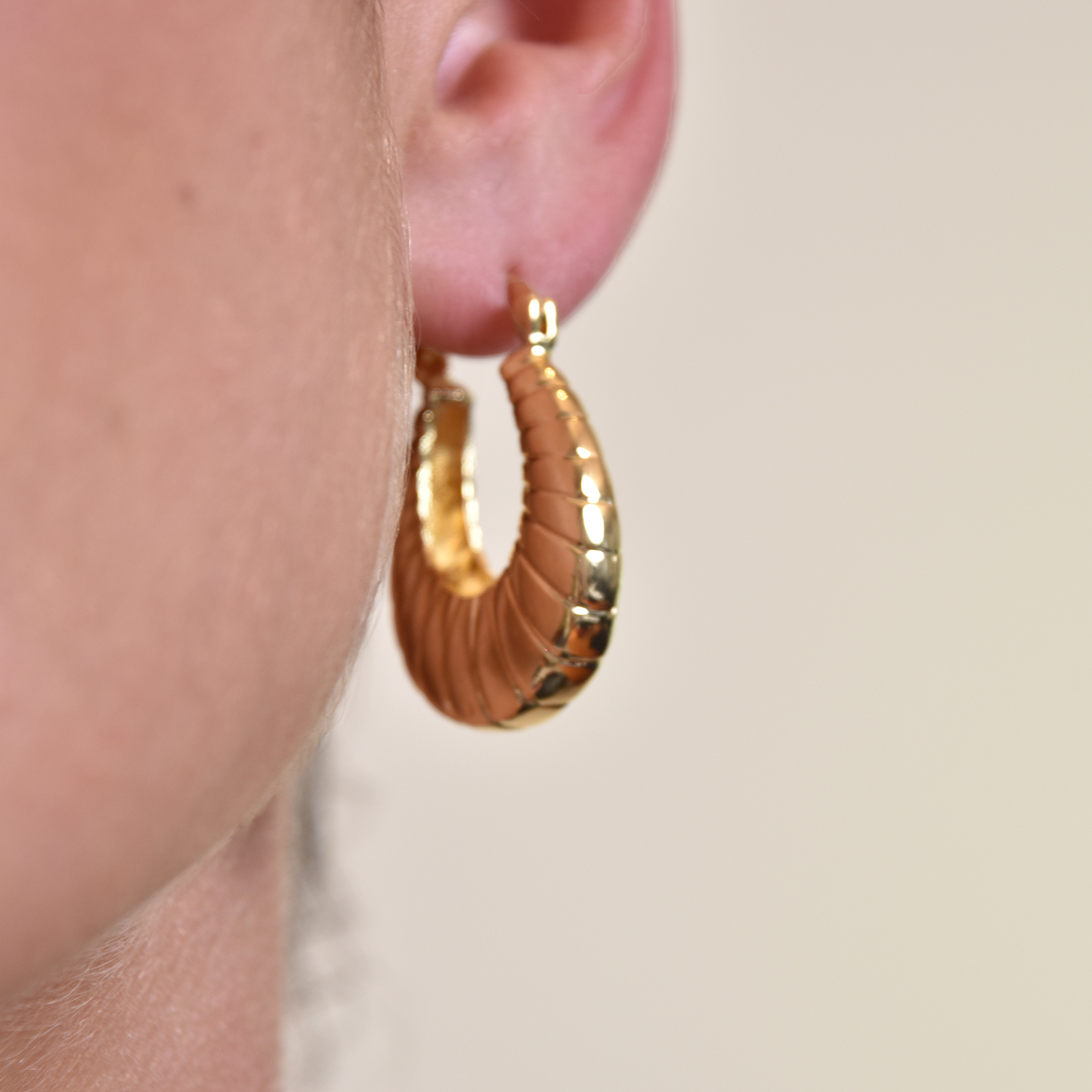 Trendy bowl huggie delight with a chunky chicness. Introducing Ambrose 24K Bowl Huggie Earrings - a stylish ear love for your versatile styling. This design features a French style curved oval bowl with a radiating pattern. The chunky bowl drop tapers off towards the top. The earrings are made of environmentally friendly brass (nickel free) with pure 24k gold plating manually polished. Perfect for modern, retro, chic, minimalist, smart casual styles and more. Hypoallergenic, nickel, cadmium and lead free.