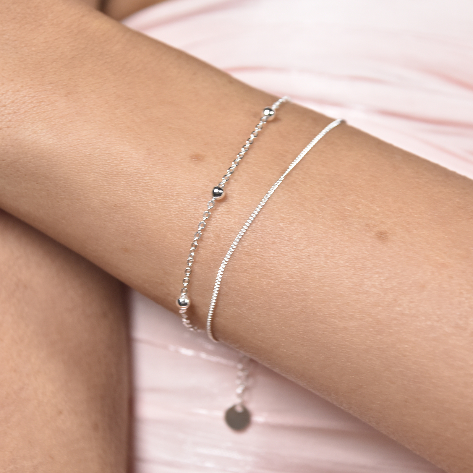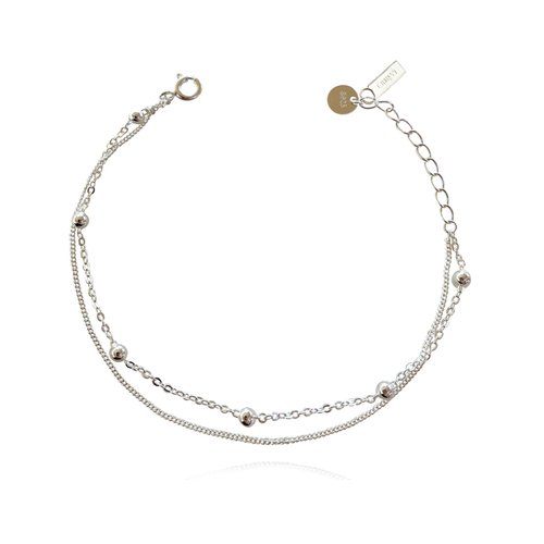Dainty, chic and versatile for styling. Introducing Amour Fine Silver Dual Chain Bracelet - a modern fine wrist love adding a playful chicness to your styling. This design features a delicate dual chain with a fine chain and a box chain with silver beads evenly spaced. This bracelet is made of solid sterling silver with white rhodium plating for hypoallergenic wear, a brighter silver shine, and an extra anti-tarnish protection. It is 18cm long including a 3.5cm adjustable link for a more flexible fitting. Perfect for wearing on its own or layering with other bracelets. Suitable for all personal styles. Hypoallergenic, nickel, cadmium and lead free.