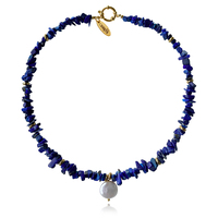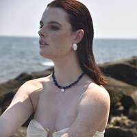 Chic coastal indulgence with a calming and smoothing deep blue hue. Introducing Anaise Natural Lapis Lazuli Pearl Pendant Necklace - a bohemian style neck love for coastal and spiritual-loving muses. This design features stacked clusters of natural lapis lazuli stones in natural shapes, separated with flat gold beads and adorned with a natural freshwater pearl pendant. The gold beads and the clasp are made in environmentally friendly brass with 18K gold plating. Perfect for modern, coastal, beach, bohemian, summer, chic, necklace layering, smart casual, casual styles and more.
