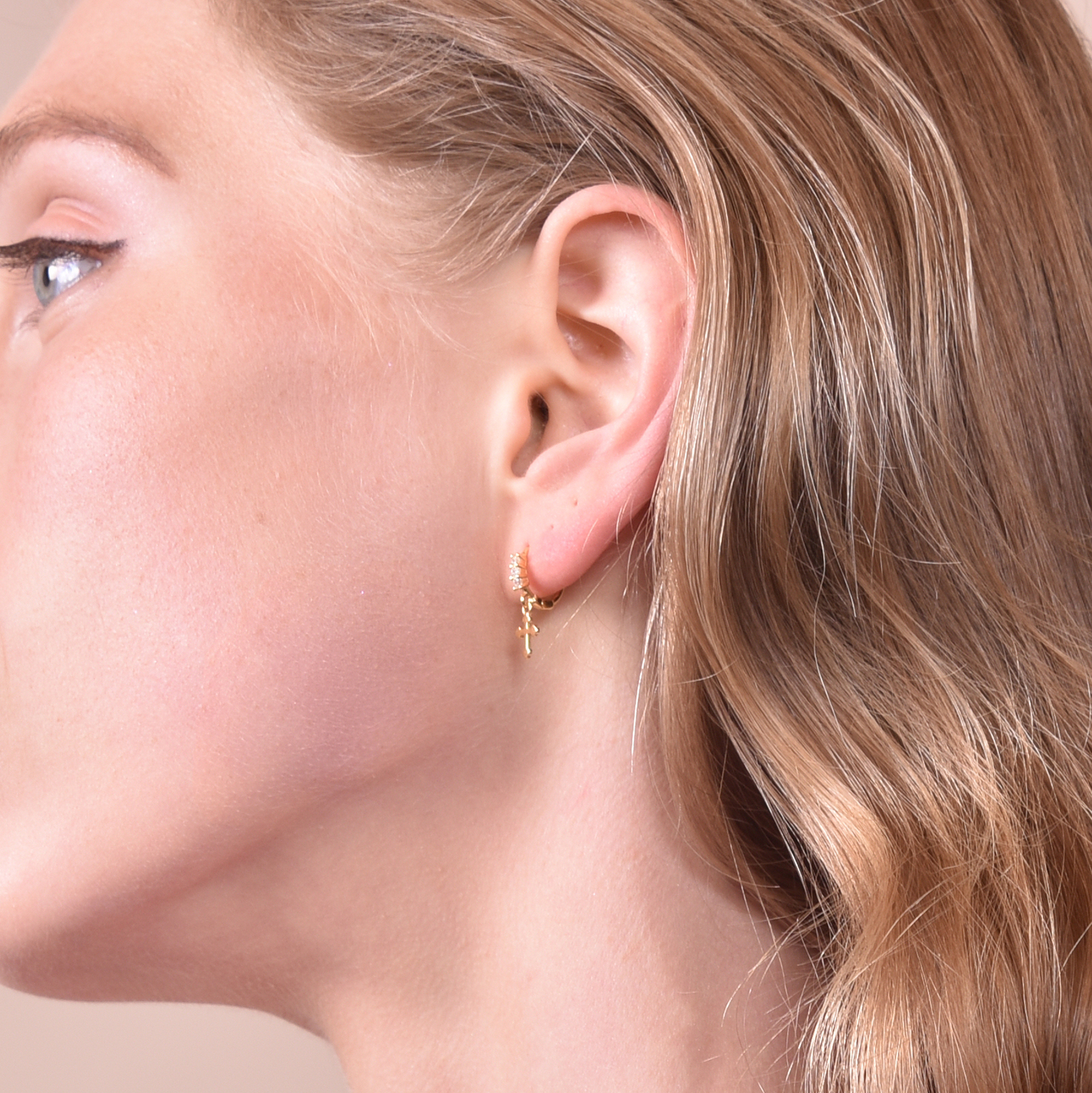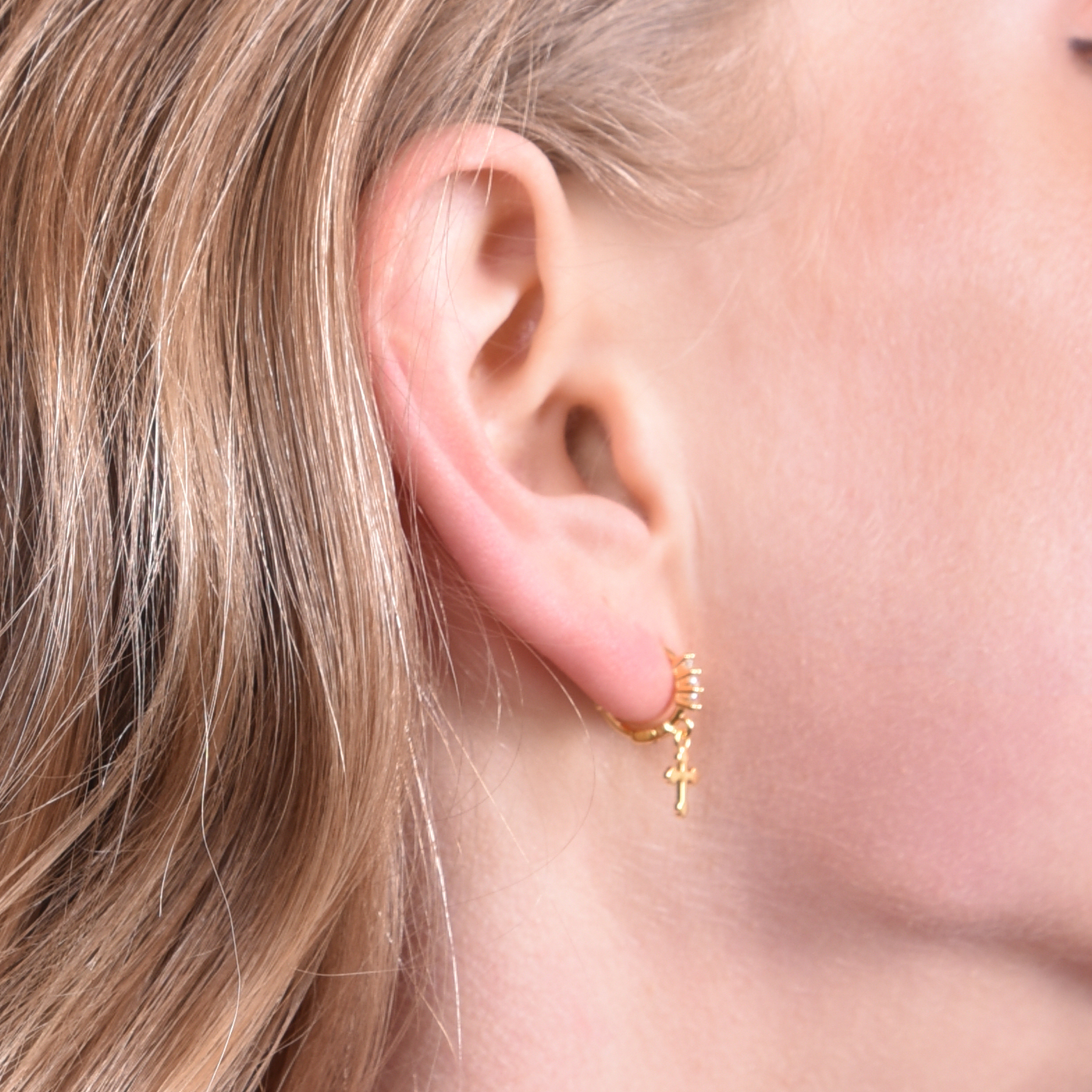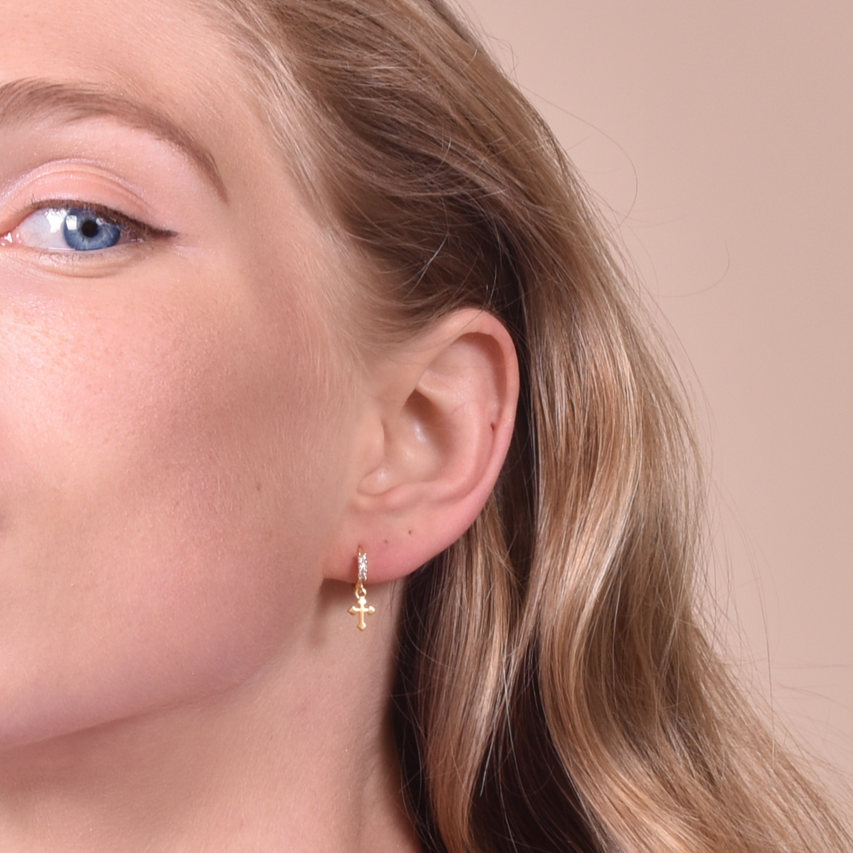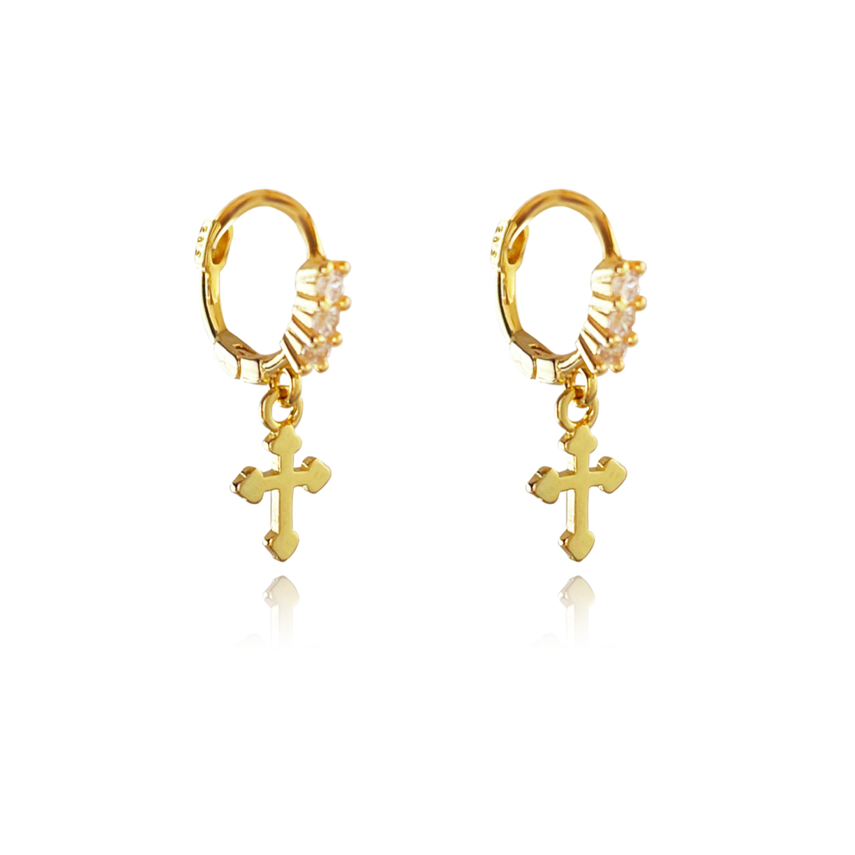 Religious earring style with a modern fine touch. Introducing Anesha Dainty Cross Drop Earrings (Gold) - a delicate yet detail rich ear love for lovers of fine styles. This design features gold orthodox cross drops attached to gold hoops - the front sides of which are embellished with inlaid Austrian zirconias. The earrings are made of solid sterling silver and 18k gold plating for durable and hypoallergenic wear. Suitable for women and girls of all ages and for all personal styles. Hypoallergenic, nickel, cadmium and lead free.
