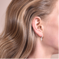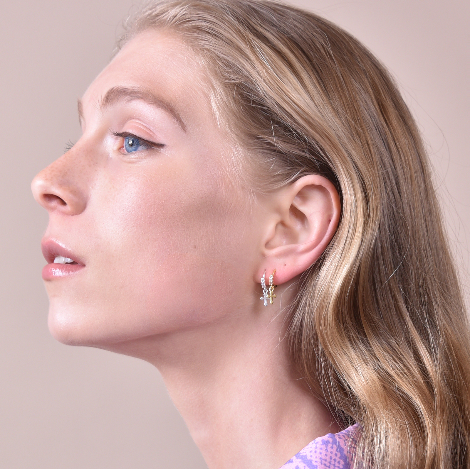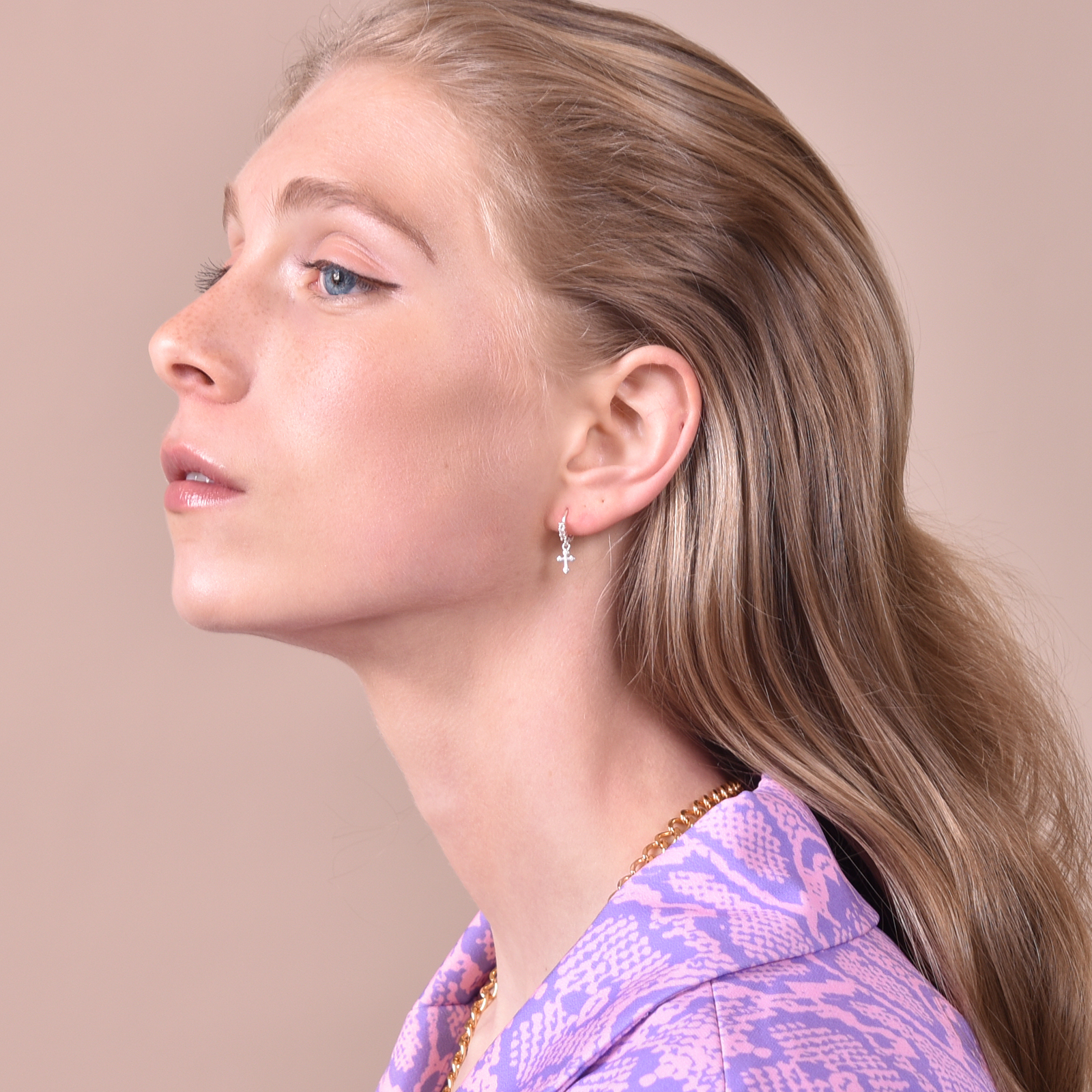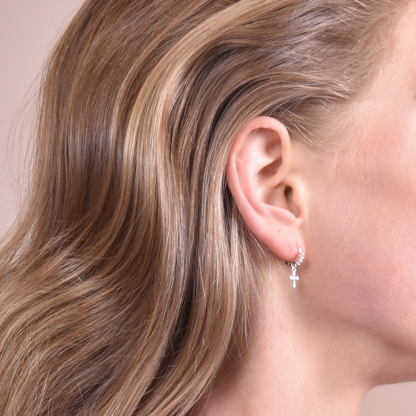 Religious earring style with a modern fine touch. Introducing Anesha Dainty Cross Drop Earrings (Silver) - a delicate yet detail rich ear love for lovers of fine styles. This design features gold orthodox cross drops attached to gold hoops - the front sides of which are embellished with inlaid Austrian zirconias. The earrings are made of solid sterling silver for durable and hypoallergenic wear. Suitable for women and girls of all ages and for all personal styles. Hypoallergenic, nickel, cadmium and lead free.