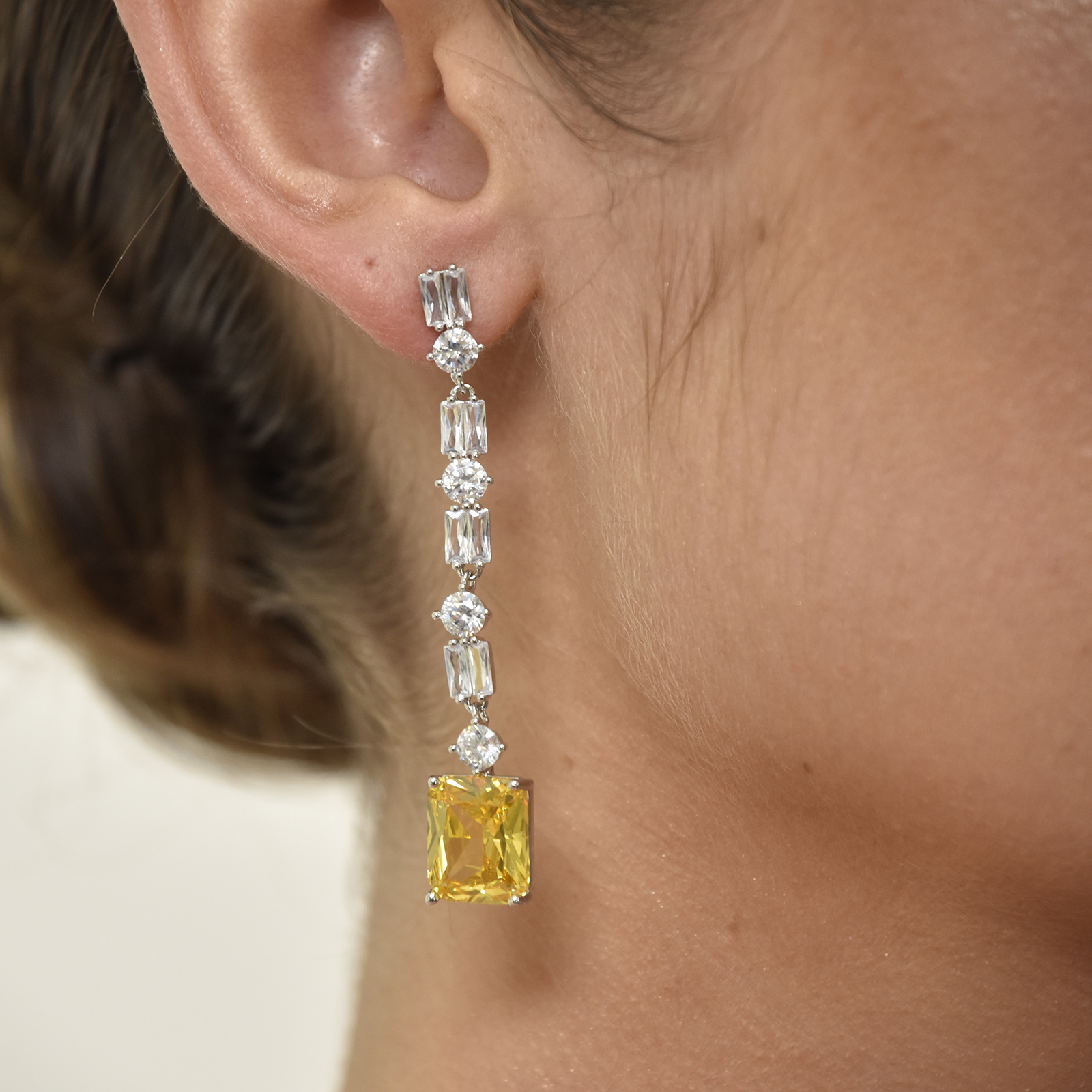 Introducing Annalee Crystal Drop Earrings (Citrine) - a feminine and sublime crystal beauty to brighten your mood. This design features a pink/citrine/deep ocean blue rectangular crystal drop in a claw setting attached to a shimmering string fully embellished with clear crystals. The body of each earring is made of environmentally friendly brass with silver plating and the earring posts are made in sterling silver for hypoallergenic and comfortable wearing. Perfect for crystal lovers who would like to strike an elegant and bright shimmer. Suitable for formal, semi-formal, dressy, racing, chic, feminine, retro, smart casual styles and more. Hypoallergenic, nickel, lead, and cadmium free.