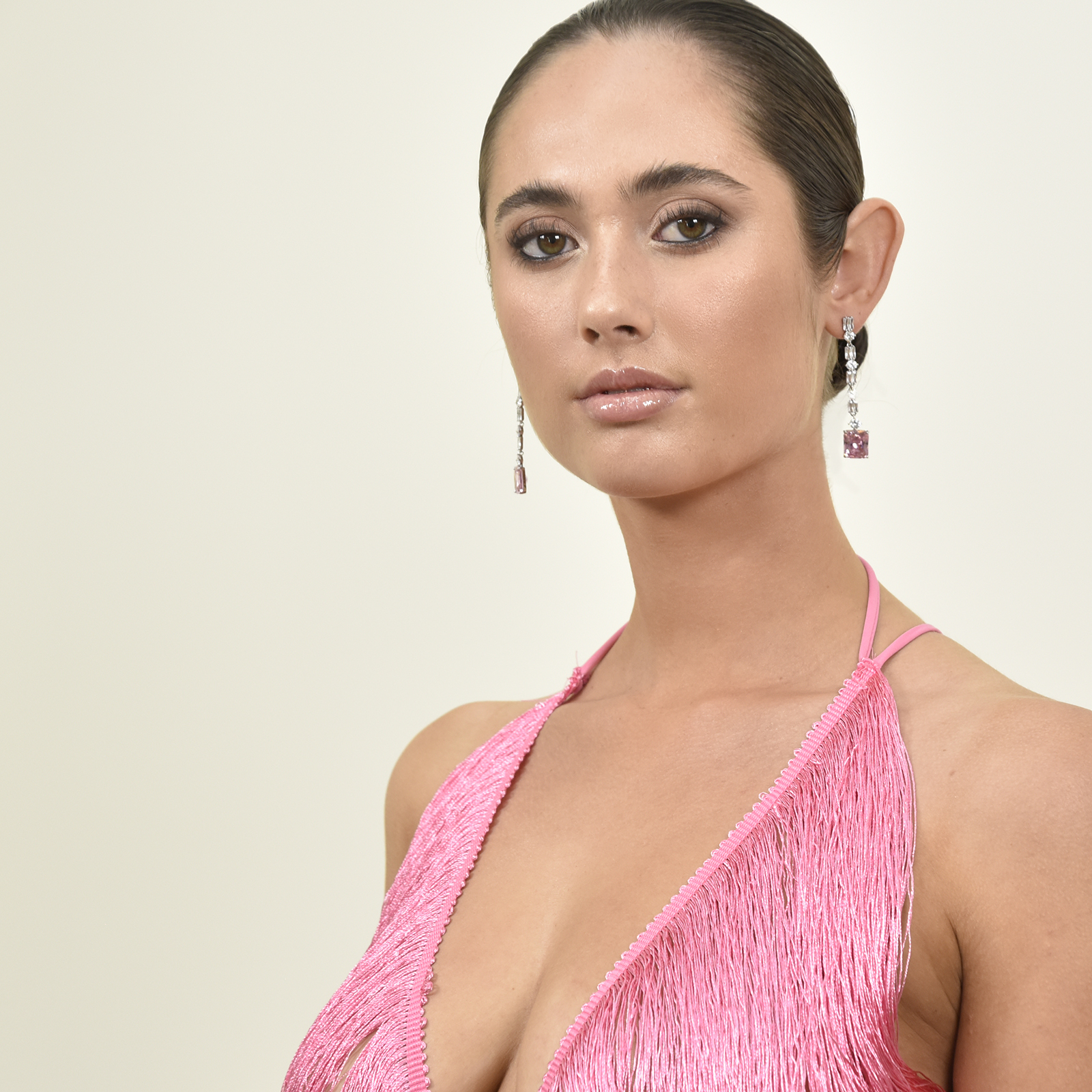 Introducing Annalee Crystal Drop Earrings (Rose Blush) - a feminine and sublime crystal beauty to brighten your mood. This design features a pink/citrine/deep ocean blue rectangular crystal drop in a claw setting attached to a shimmering string fully embellished with clear crystals. The body of each earring is made of environmentally friendly brass with silver plating and the earring posts are made in sterling silver for hypoallergenic and comfortable wearing. Perfect for crystal lovers who would like to strike an elegant and bright shimmer. Suitable for formal, semi-formal, dressy, racing, chic, feminine, retro, smart casual styles and more. Hypoallergenic, nickel, lead, and cadmium free.