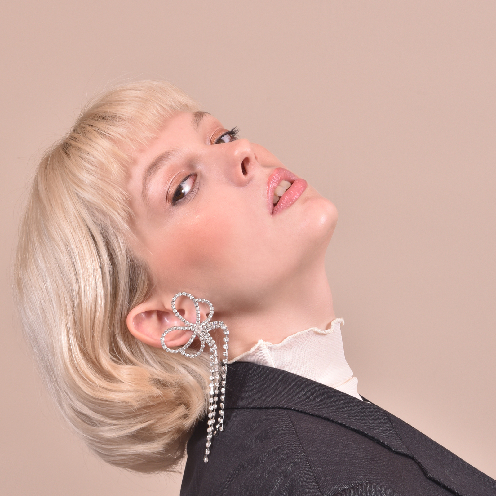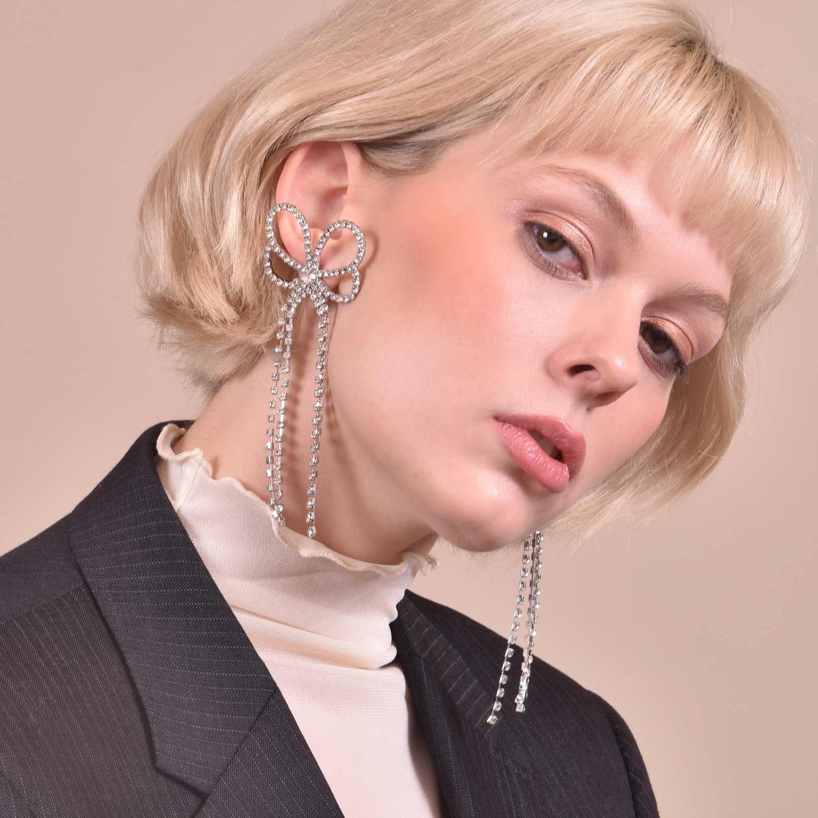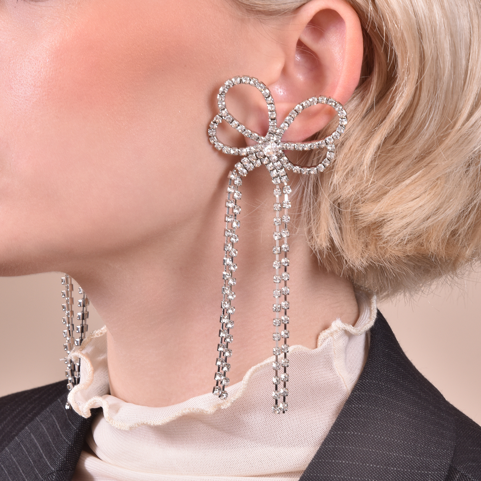 Extravagantly elegant with a sweet indulgence, introducing Annelise Catwalk Diamante Earrings — a vogue inspired runway style for your exquisite high fashion taste. This feminine and magazine style ear love is crafted in environmentally friendly stainless steel with silver plating, and embellished with clear crystal diamantes for a luxurious and glamorous shimmer. Perfect for formal, semi-formal, runway, dressy, racing, fashion events, and modern fashionistas with a sense of daring. Available for both pierced and non-pierced ears.
