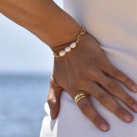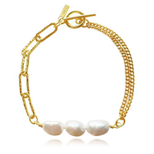 Modern fine chain statement adorned with a soft touch of pearls. Introducing Anouk Freshwater Pearl Dual Chain Bracelet (Gold Vermeil) - a contemporary and artsy style wrist love adding a subtle strength to your femininity. This design features a twin link chain - including a half textual oval link chain and a half dual link chain, with 3 freshwater pearls in the middle. This bracelet is made of solid sterling silver with 2.5 microns of 18K gold plating to Gold Vermeil Jewellery Standards. It also comes with a stylish T bar closure. A unique, subtle and creative piece perfect for modern, artsy, chic, punk, smart casual, casual styles and more. Hypoallergenic, nickel, cadmium and lead free.