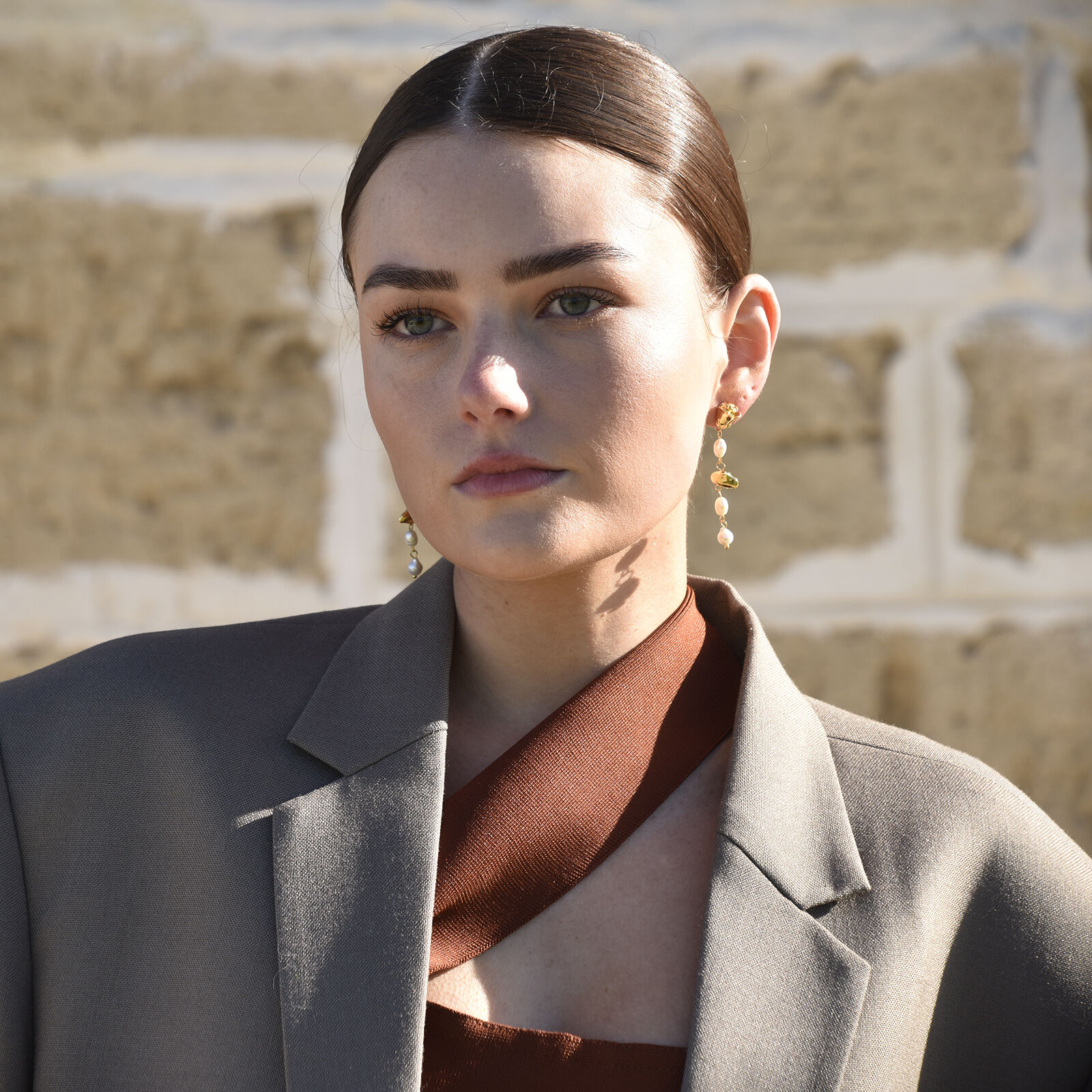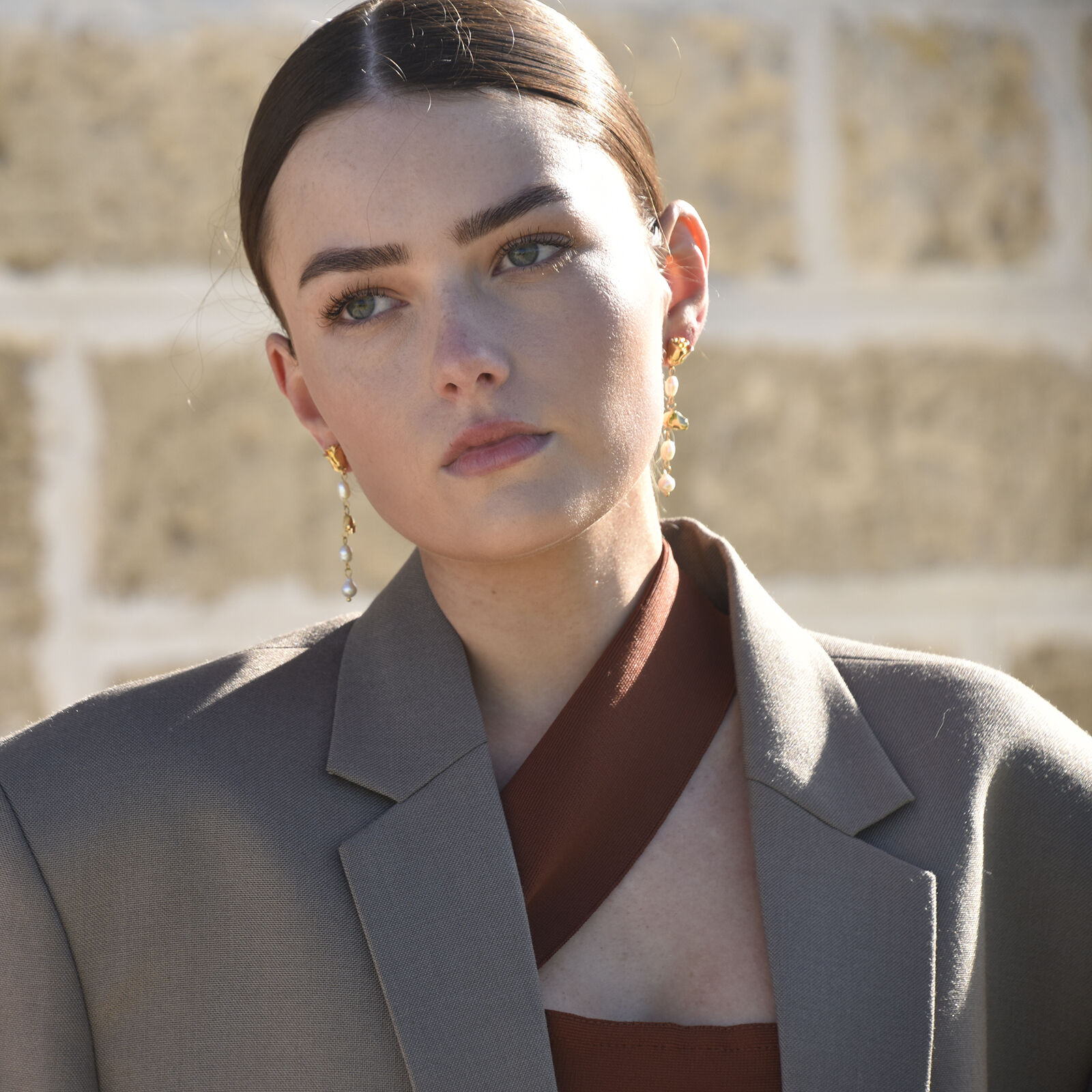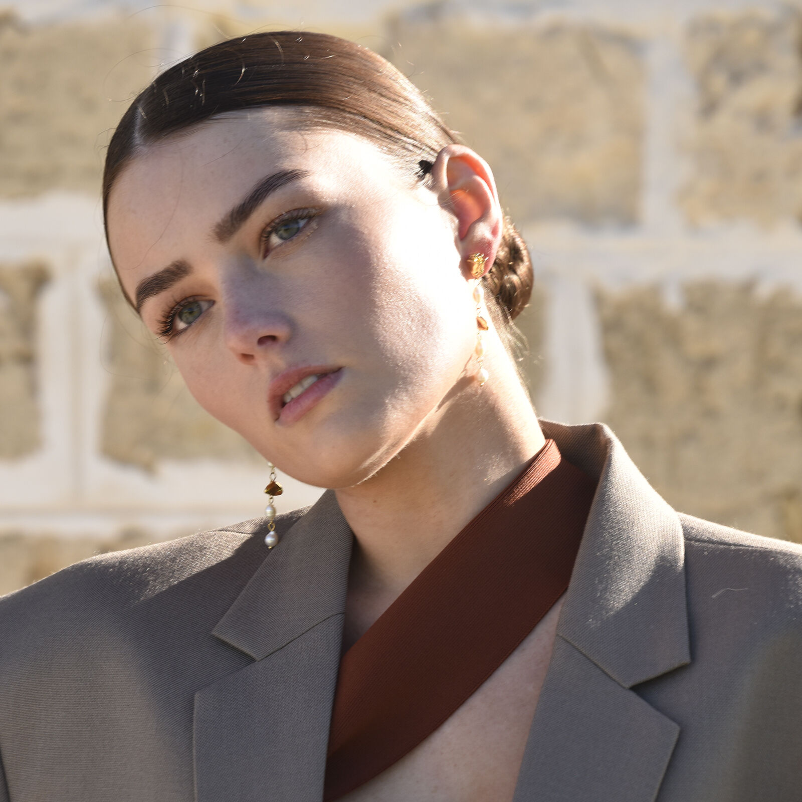 Aesthetics is a mindset - an expression of beauty. Introducing Apri Aesthetic Rose Pearl Drop Earrings - a creative style pearl drop crafted with aesthetics in mind. This design features a rose-shaped top stud with 3 cultured freshwater pearls separated by an asymmetrical gold metal hanging below. The earrings are made in environmentally friendly brass with 18k gold plating. A unique and chic pearl love for modern, retro, vintage, coastal, layering, chic, feminine, dressy, smart casual, casual styles and more. Hypoallergenic, nickel, lead, and cadmium free.