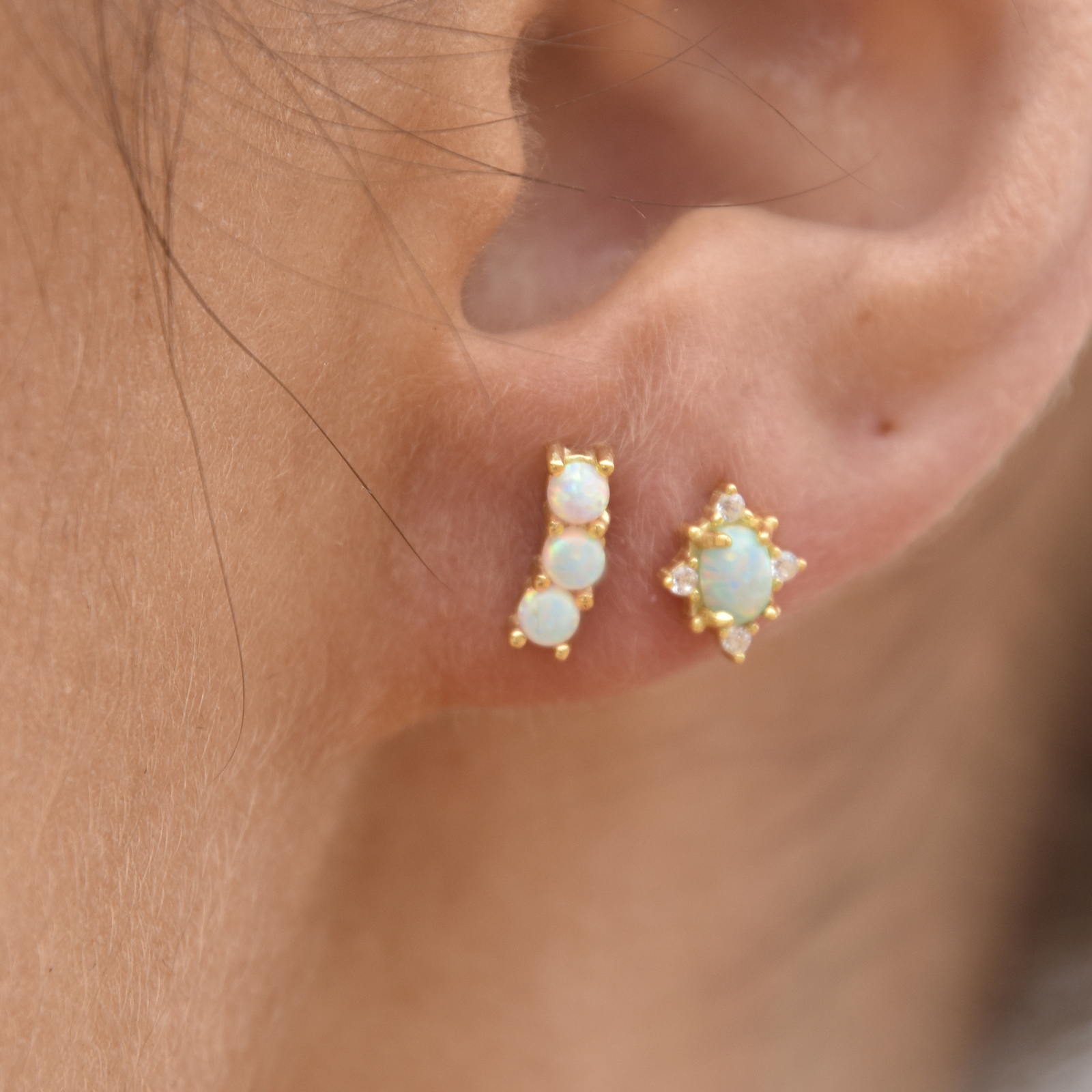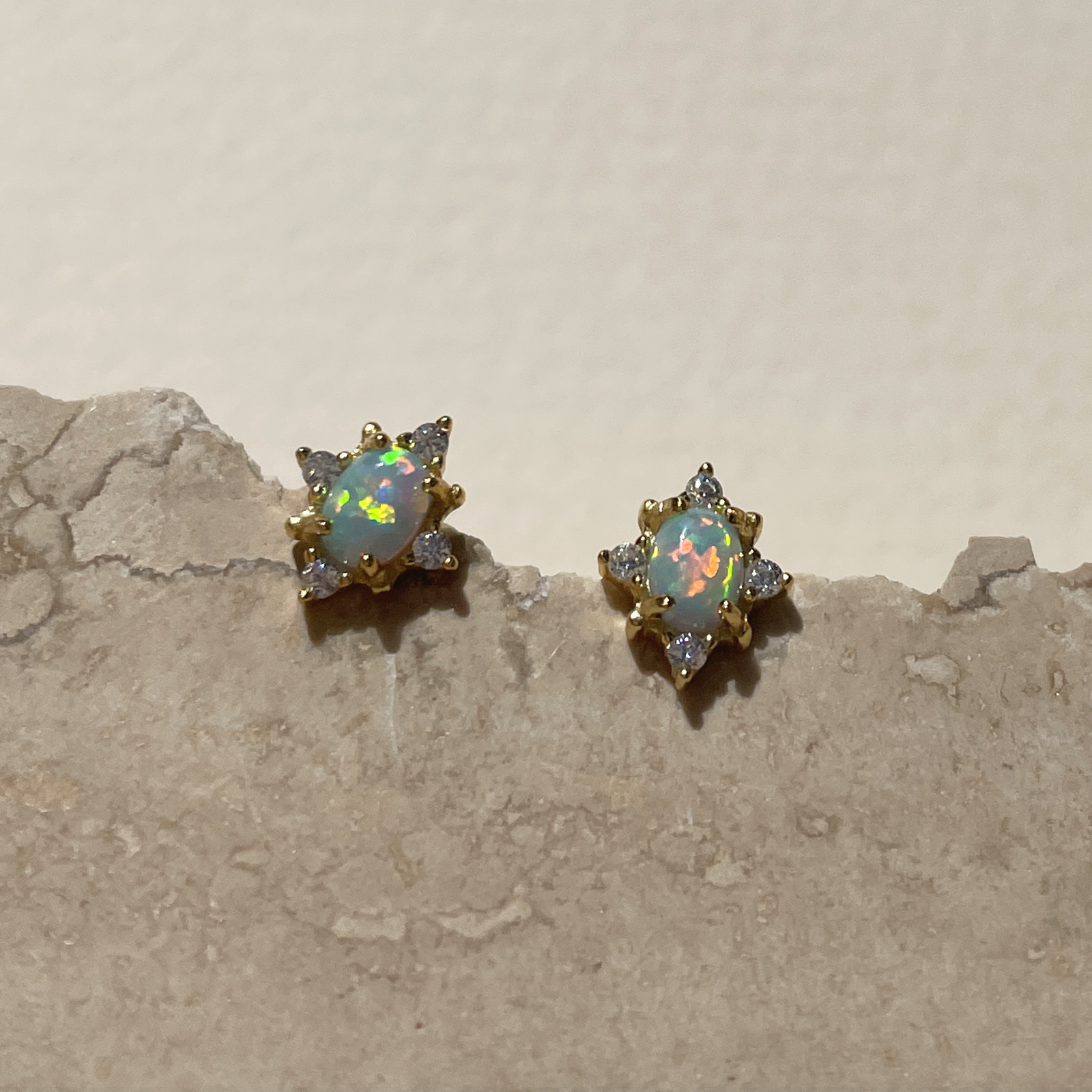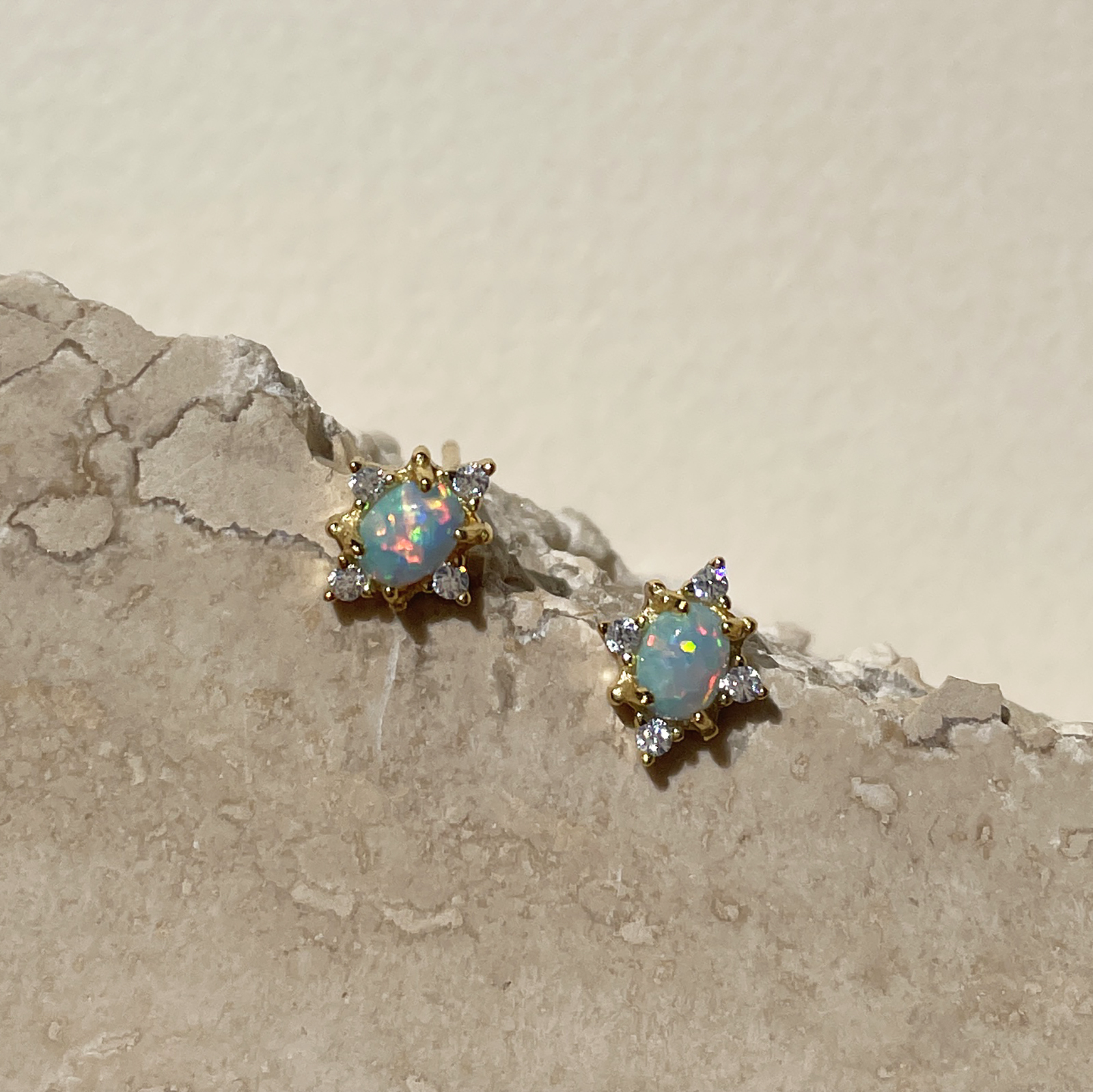 Dainty, chic and detail rich. Introducing Apricia Dainty Opal Stud Earrings - a refined and delicate ear stud with a little extra zest. This design features small solid opals embedded in a star shaped frame adorned with clear Austrian zircons. Watch the brilliant hues and colours dance as the opal catches the sunlight. The earrings are made of solid sterling silver with 18k gold plating. Suitable for women and girls of all ages. Perfect for dainty, chic, feminine, minimalist, earring layering, smart casual, causal, everyday styles and more. Hypoallergenic, nickel, cadmium and lead free.