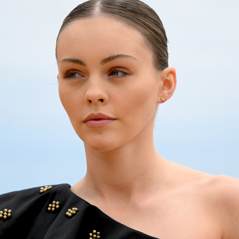 Each earring is meticulously crafted from solid sterling silver and finished with 2 microns of thick 18K gold plating, offering exceptional durability and a rich, luminous finish. The surface is set with Australian cubic zirconia pavé, creating a delicate constellation of light that catches and reflects with every movement.