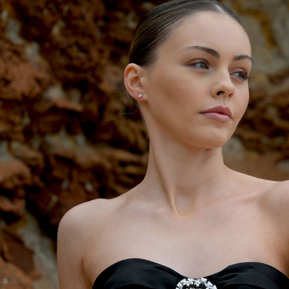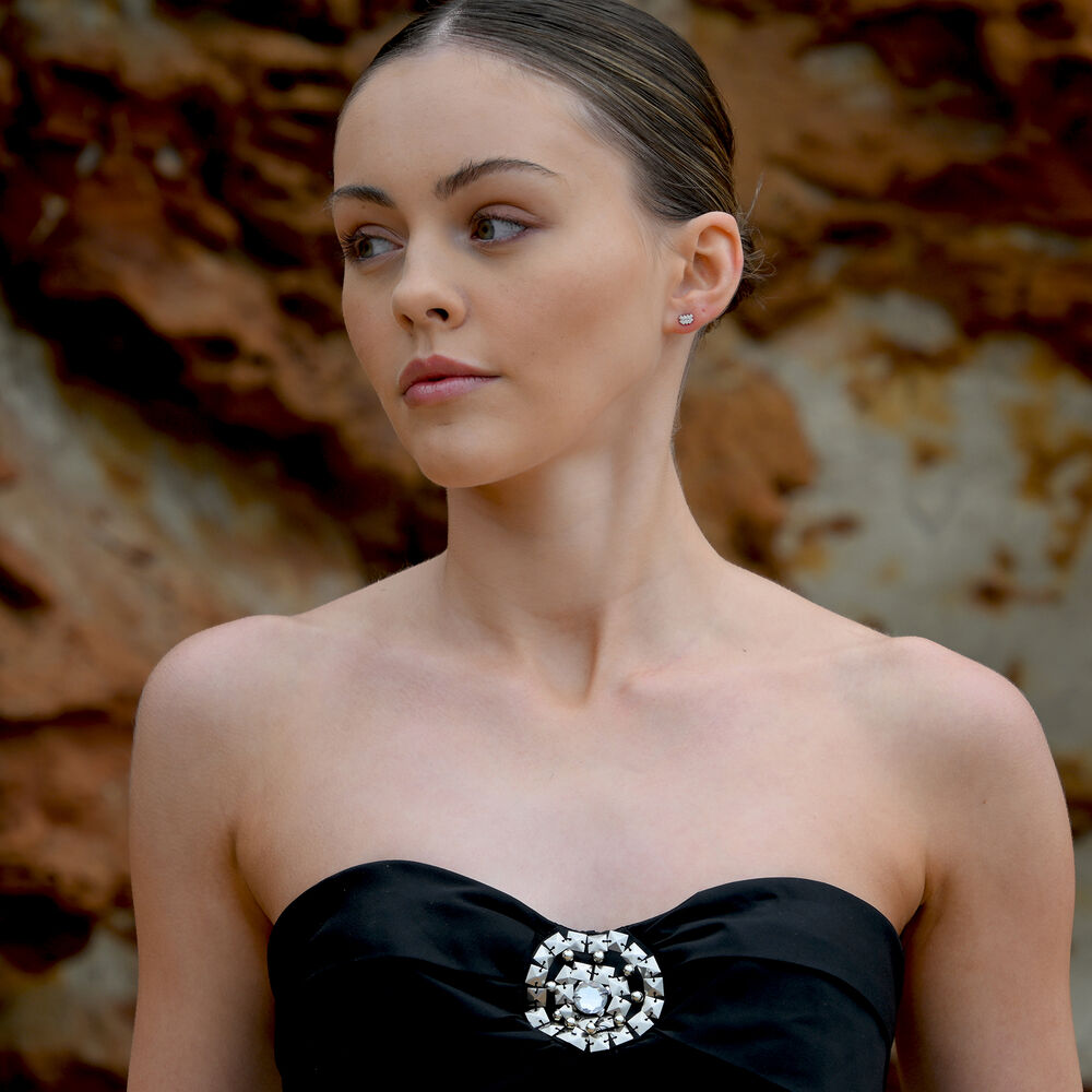 Each earring is meticulously crafted from solid sterling silver and finished with precious white rhodium plating, offering enhanced anti-tarnish protection and a brighter, more radiant silver shine. The surface is set with Australian cubic zirconia pavé, forming a delicate constellation of light that sparkles beautifully with every movement.