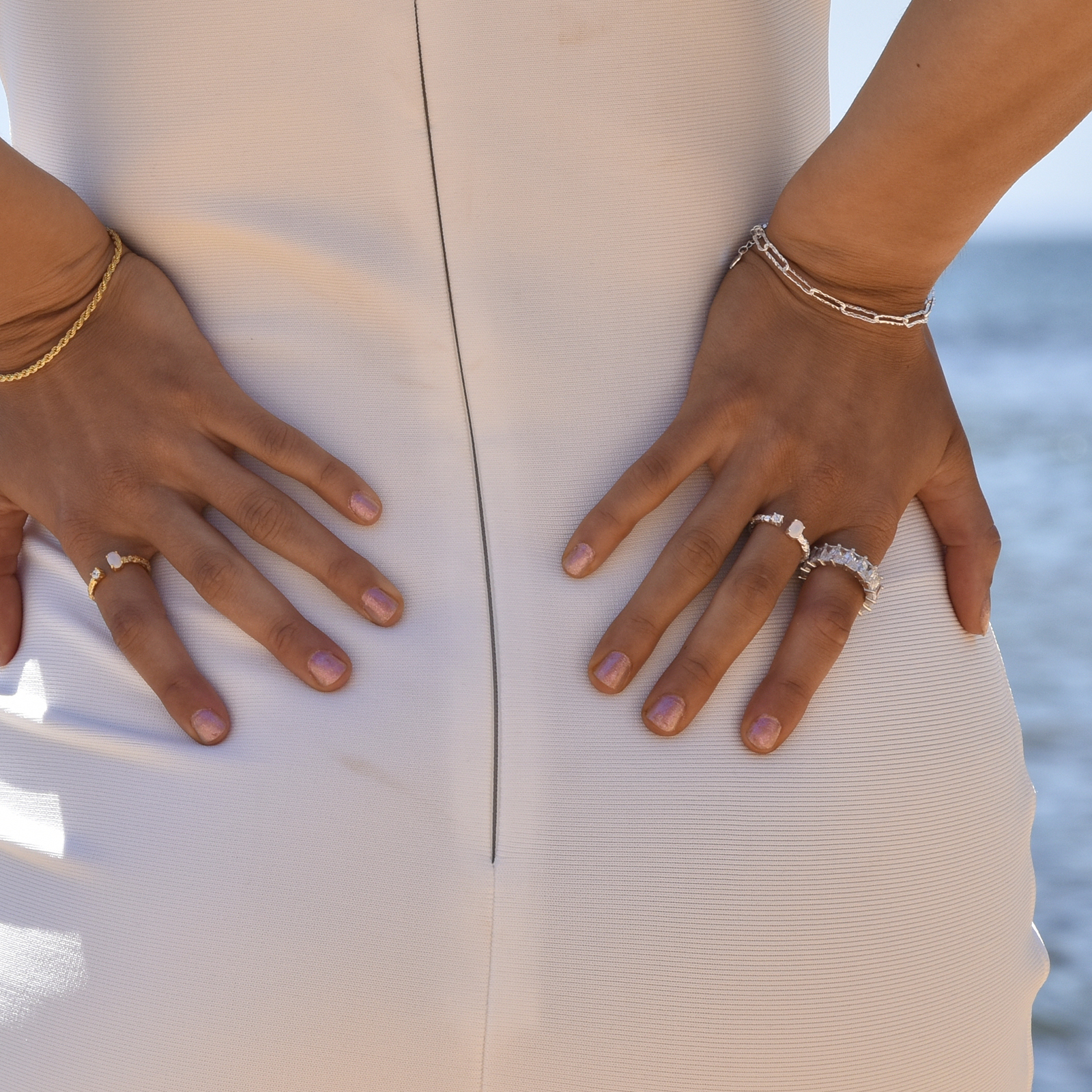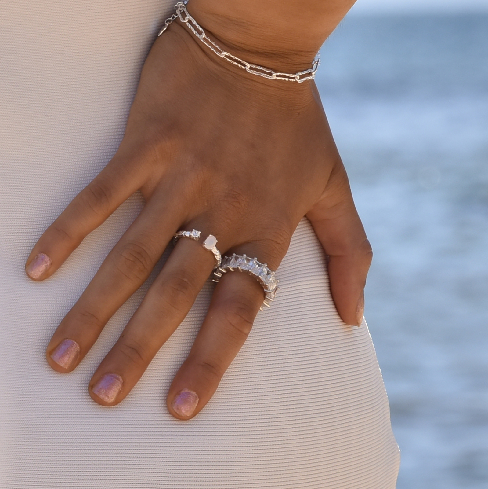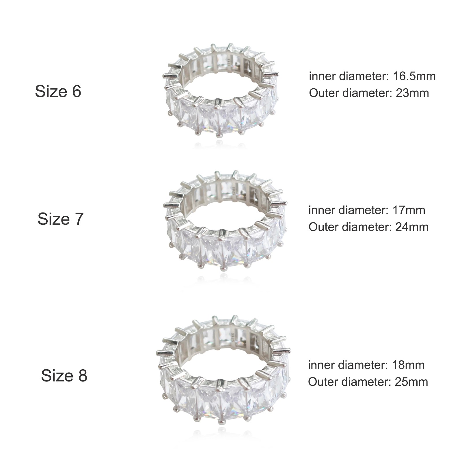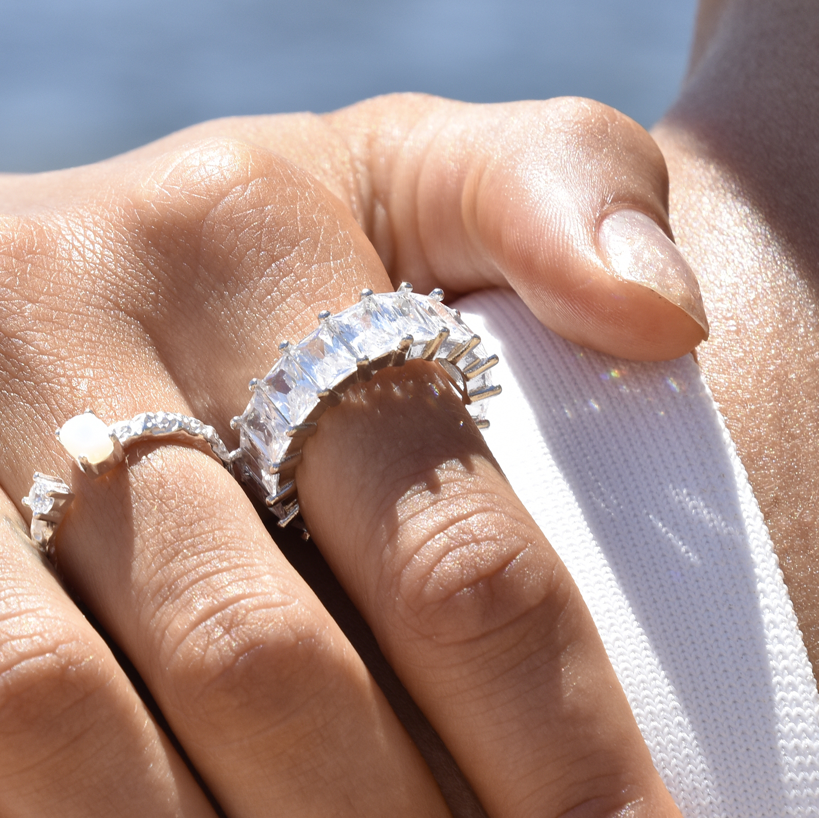 Silver glamour with a full zircon shimmer. Introducing Arcene Luxury Inlaid Zircon Ring - a glamorous and eye-catching statement ethically crafted to last a lifetime. This design features 15 pieces of premium quality Austrian clear zircons in a rectangular cut, perfectly embedded in a claw setting. The ring is made of solid sterling silver and smoothly polished on every angle. It comes in 3 sizes: size 6, size 7 and size 8. A classy yet outspoken finger statement/bling for those who appreciate style and high quality. Hypoallergenic, nickel, cadmium and lead free.