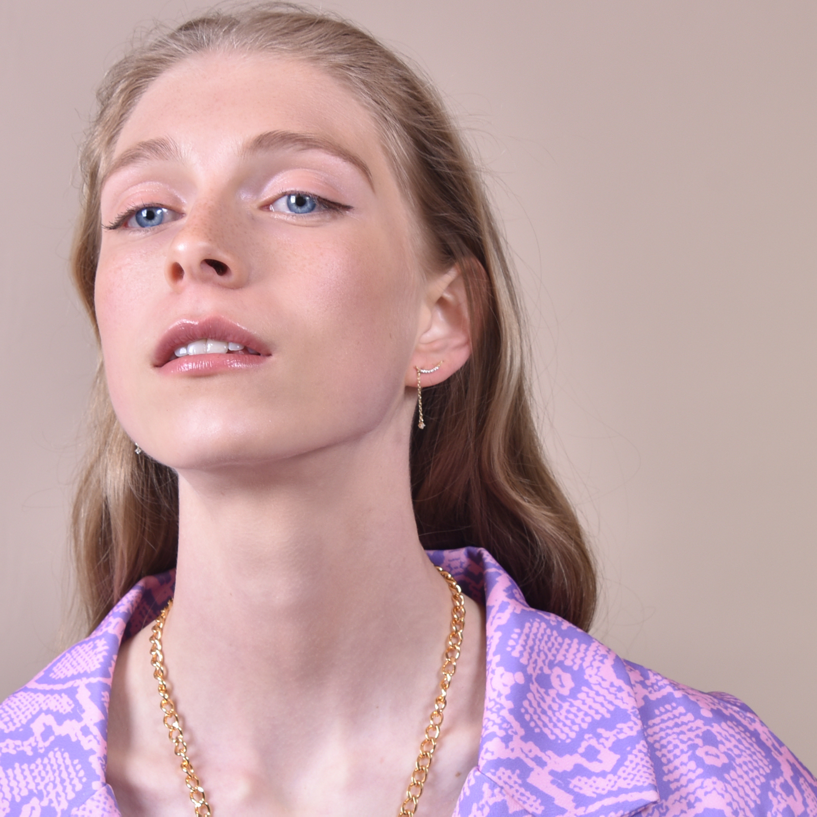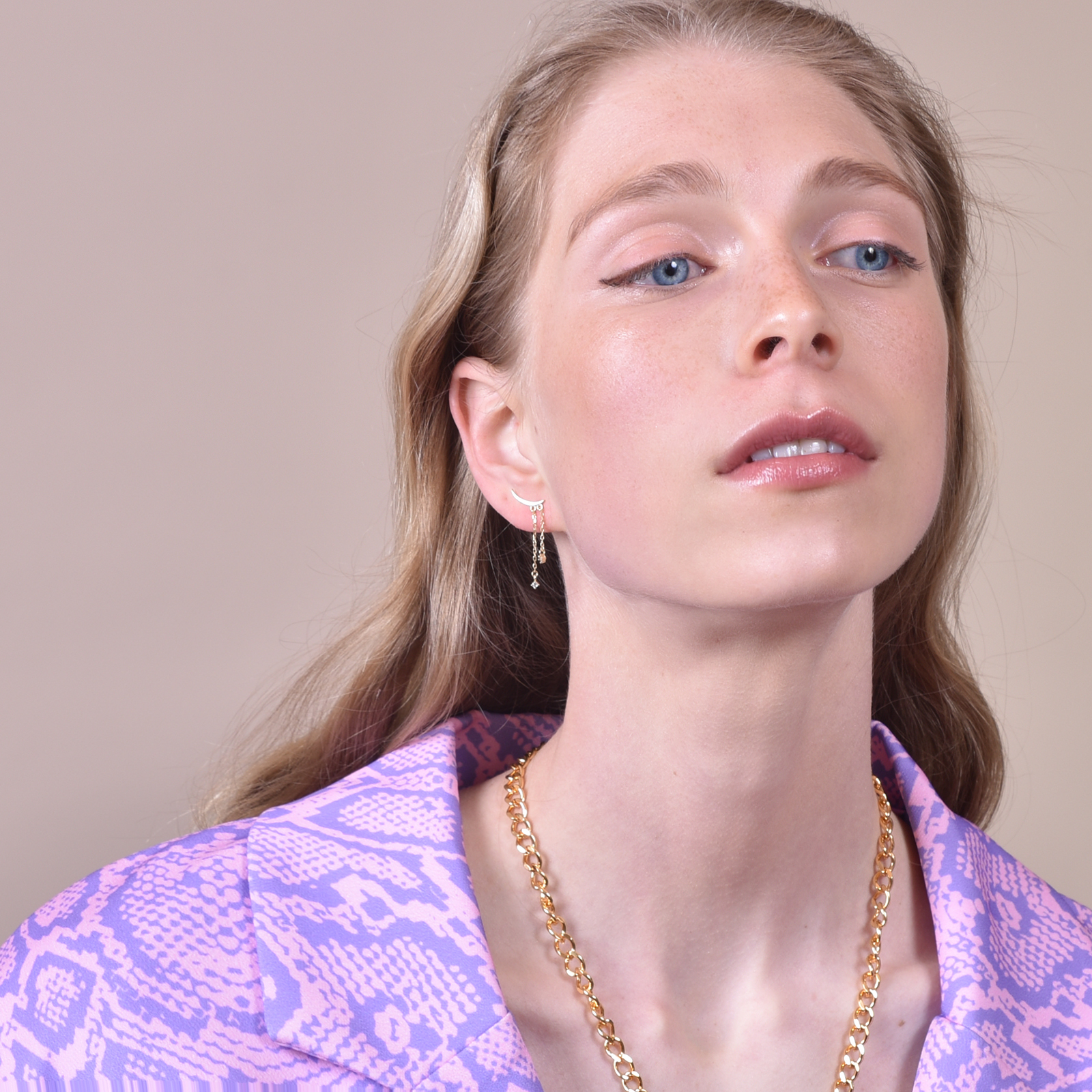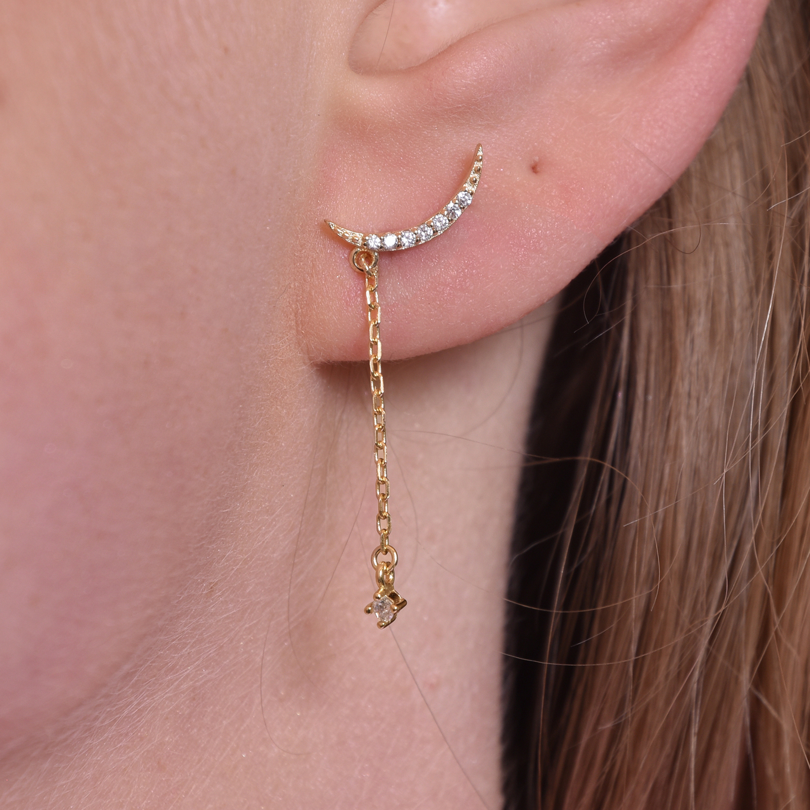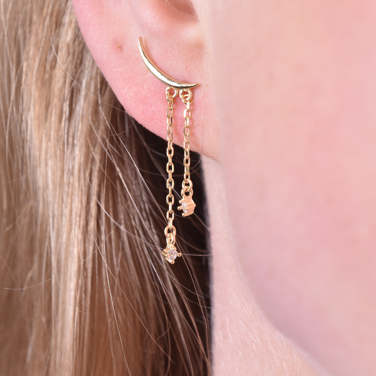 Delicate, romantic and dreamy. Introducing Ariella Dainty Moon String Mismatching Earrings (Gold) - a stylish and sweet mismatched ear love for your unique chic styling. This design features 2 chain-drop pieces both with a highlight of moon - one earring with a smooth polished crescent moon on the top, and the other earring with a zirconia embellished crescent moon on the top. The earrings are made in sterling silver with 18k gold plating to ensure hypoallergenic wear. Perfect for modern, retro, bohemian, chic, girly, earring multi layering, smart casual, casual and everyday styles. Suitable for women and girls of all ages. Also suitable in silver. Hypoallergenic, nickel, cadmium and lead free.