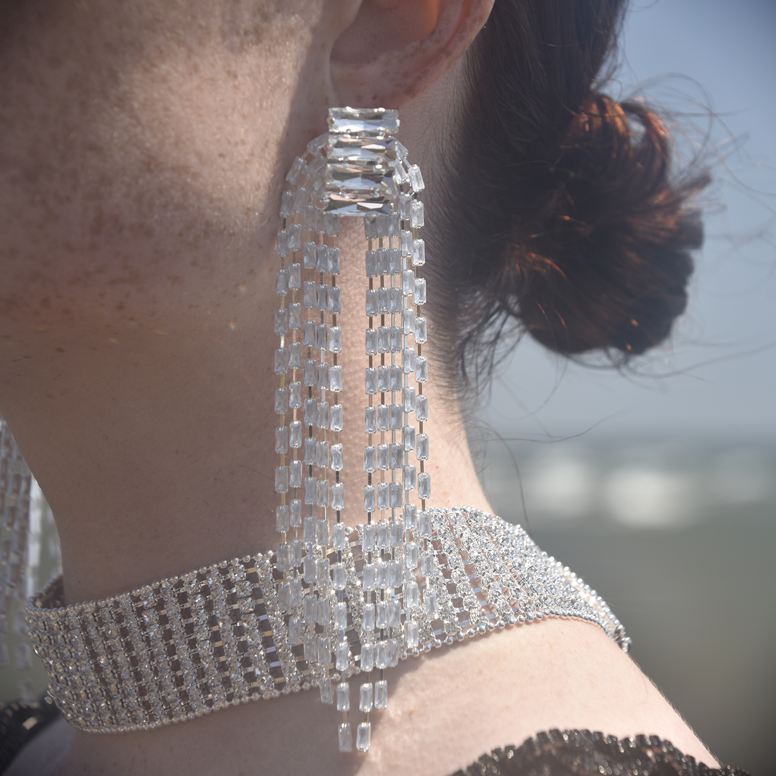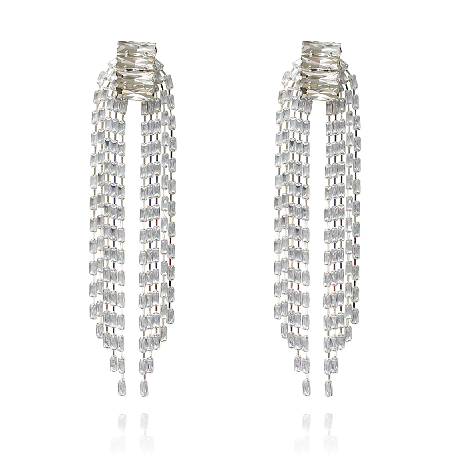 Too glam not to make a statement. Introducing Aries Arch String Statement Earrings - a bold and chic ear statement adding a high fashion element to your styling. This design features clouded diamante strings forming a waterfall on either side of a stack of four larger rectangular rhinestones at the top. The earrings are made in environmentally friendly alloy with silver plating. Perfect for modern, retro, high fashion, glamour, fashion event, runway styling, bold, chic, smart casual styles and more.