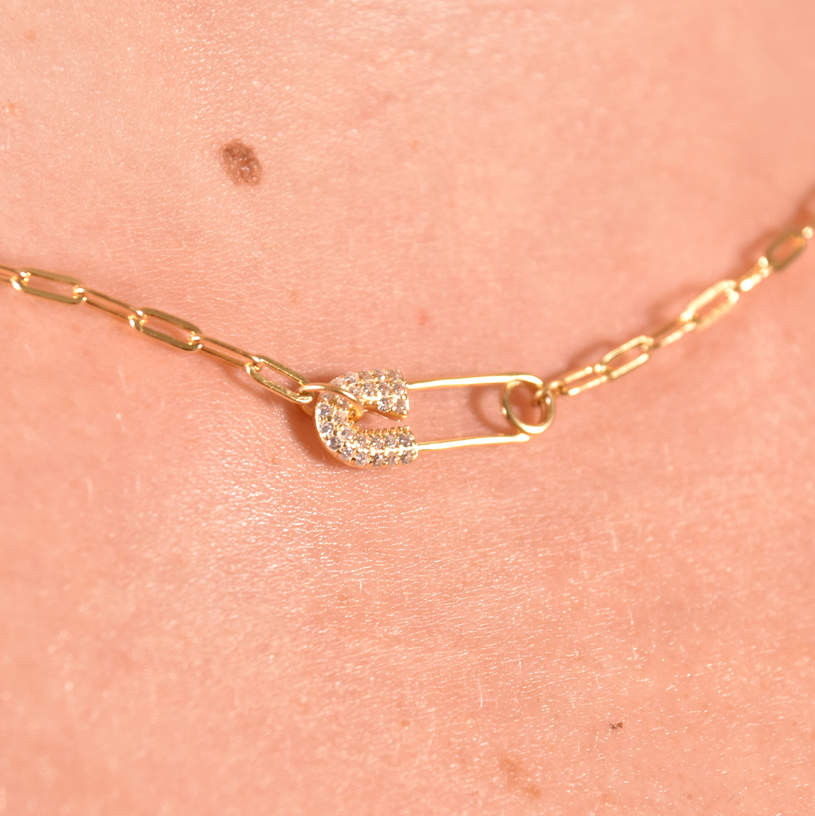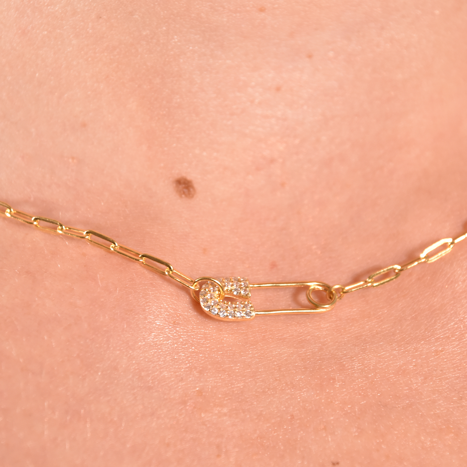 Chic, creative and refined. Introducing Arlette Fine Chain Necklace / Choker - a contemporary style neckpiece blending modern femininity with a pinch of edginess. This design features a delicate link chain necklace with an adorable safety pin embellished with quality cubic zirconias. This neckpiece is crafted in solid sterling silver with 2.5 microns of 18K gold plating to premium jewellery standards. Perfect for modern, minimalist, fine, chic, punk, artsy, necklace layering, smart casual, casual  styles and more. Hypoallergenic, nickel, cadmium and lead free.