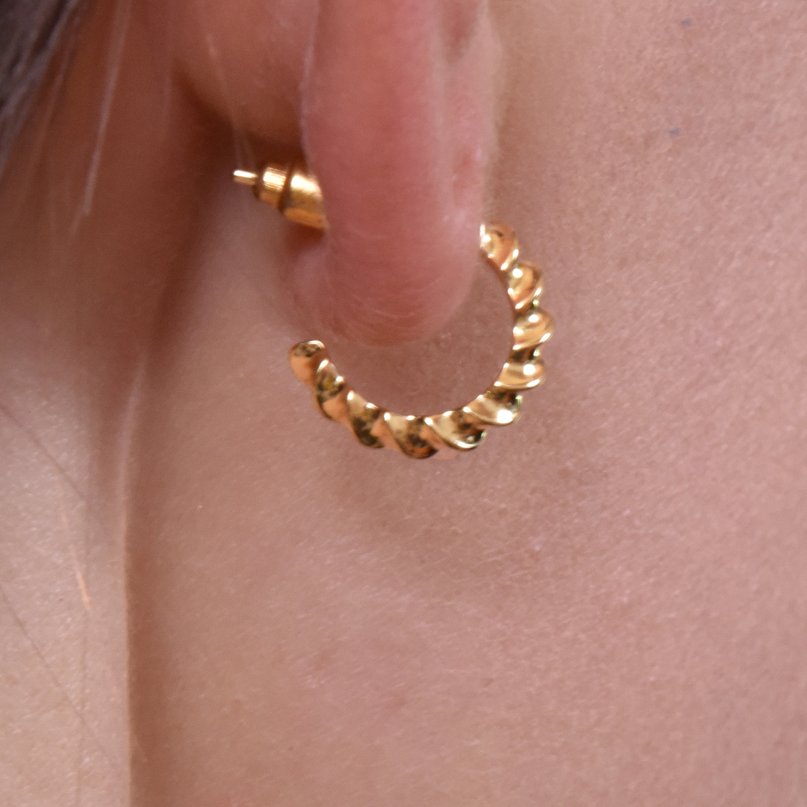 Dainty, timeless, enduring and allergy free. Introducing Aster Gold Filled Dainty Twist Earrings - an ethically crafted piece for your chic and elevated everyday earring style. This design features an on-trend twisted croissant hoop element crafted in solid sterling silver with 18k rolled gold (gold filled), forming a much thicker gold bond to the sterling silver metal. This style can be worn by women and girls of all ages who appreciate quality and comfort. Perfect for modern, retro, chic, earring multilayering, everyday style and more. Hypoallergenic, nickel, cadmium and lead free. Allergy free.