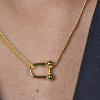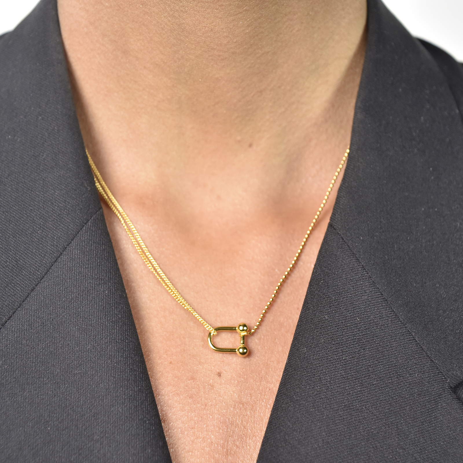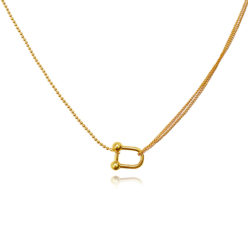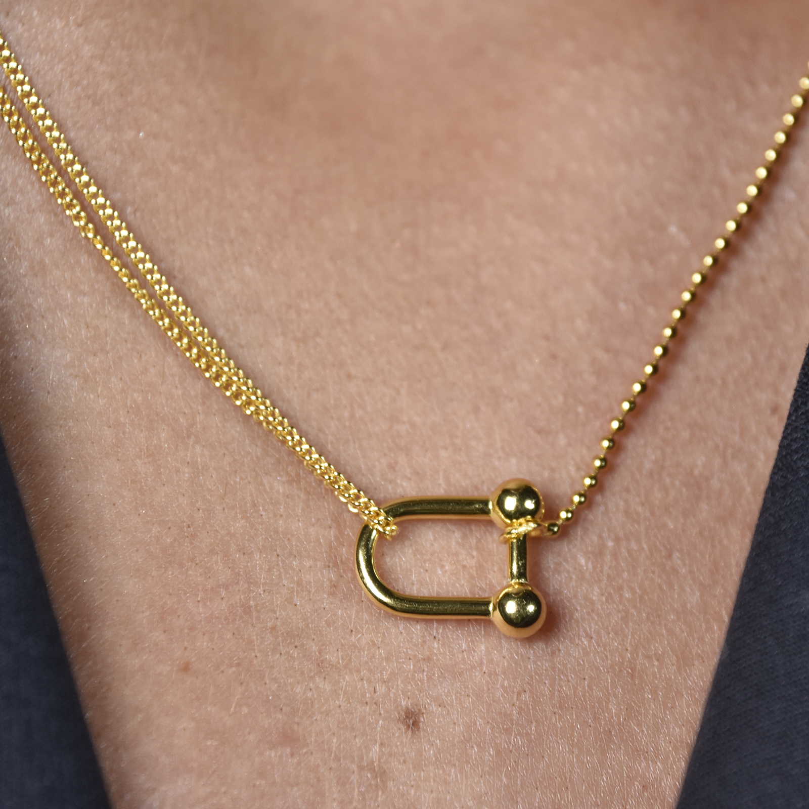 Modern, chic and unique. Introducing Astra Dual Link Pendant Chain Necklace - a contemporary style chain neck beauty adding a subtle sophistication to your everyday styling. This design feature a half fine beaded chain and a half twin link chain with a U-shaped link pendant in the middle. This neckpiece is made in sterling silver with 18K gold plating for hypoallergenic wear and a noble gold shine. This neckpiece is 45cm long including a 4cm adjustable link for your ideal fit. Perfect for modern, artsy, minimalist, necklace layering, smart casual, casual, everyday styles and more. Hypoallergenic, nickel, lead, and cadmium free.
