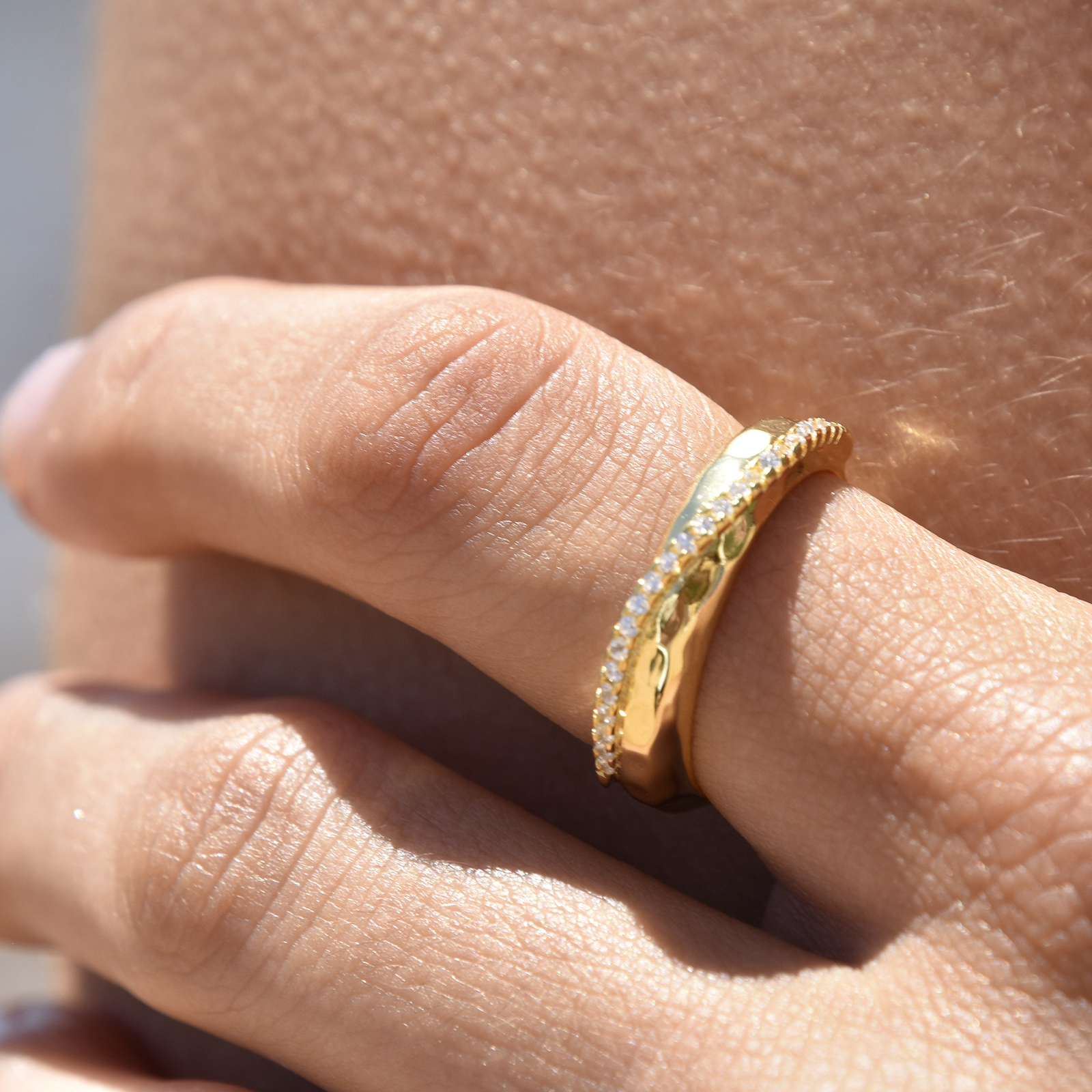Contemporary and elegant finger beauty with a soft and shimmering flow. Introducing Astre Artisan Diamante Wave Open Ring (Gold Vermeil) - a unique and feminine style artisan ring for your timeless and classy styling. This design features a classic ring band with a lightly hammered surface - adorned with a gorgeous twist and flow of Austrian zirconias. This ring is made in solid sterling silver with 2.5 microns of quality 18K gold plating (to Gold Vermeil & Premium Jewellery Standards). Due to the softness of sterling silver, this ring can be easily adjusted manually for your ideal fit. Perfect for modern, creative, chic, feminine, girly, elegant, formal, semi-formal, dressy, ring stacking, smart causal, casual, everyday styles and more. Hypoallergenic, nickel, cadmium and lead free.