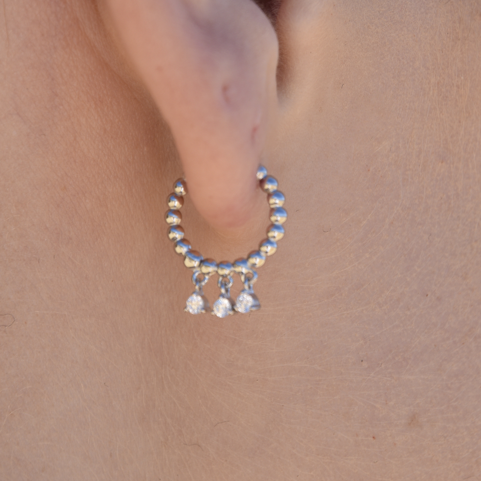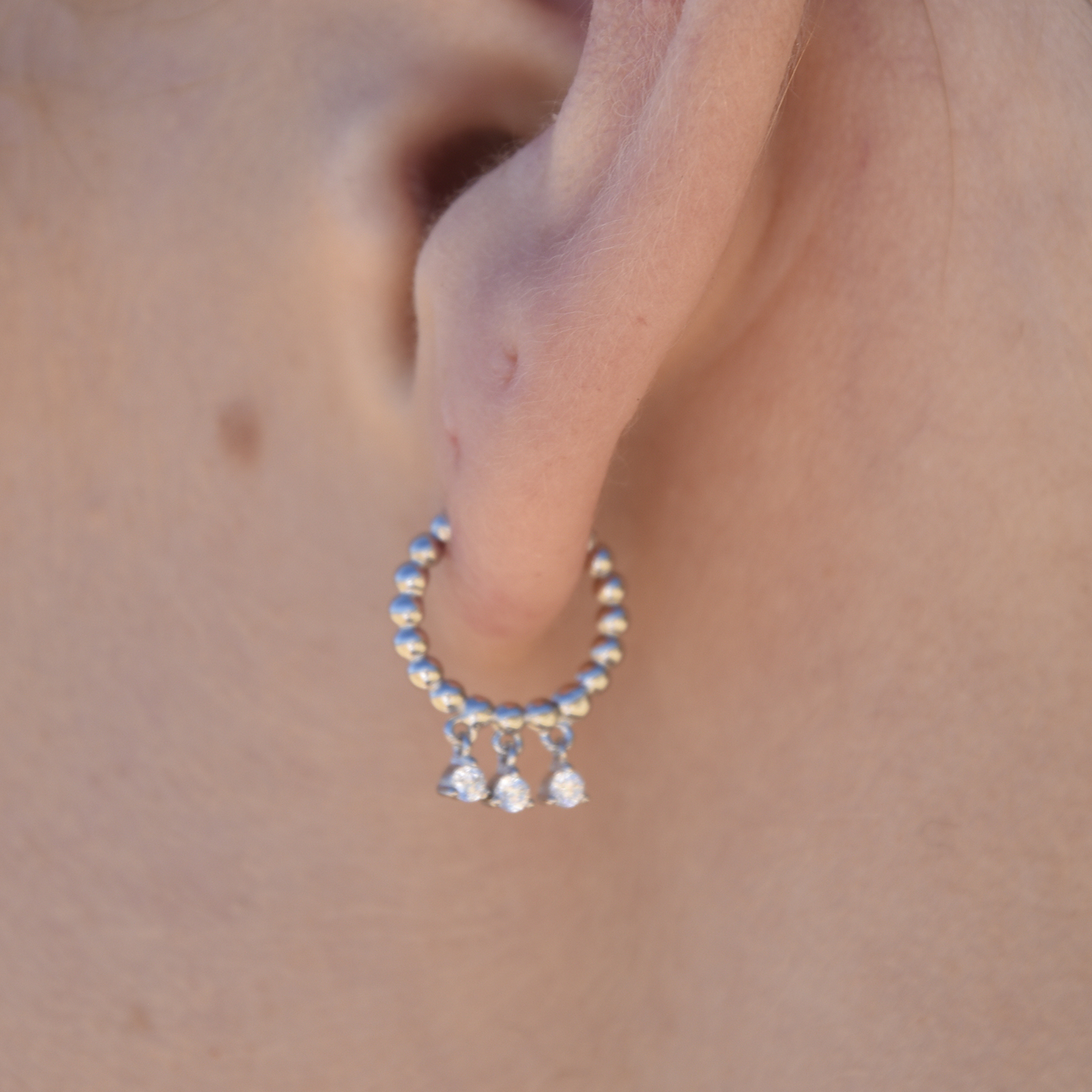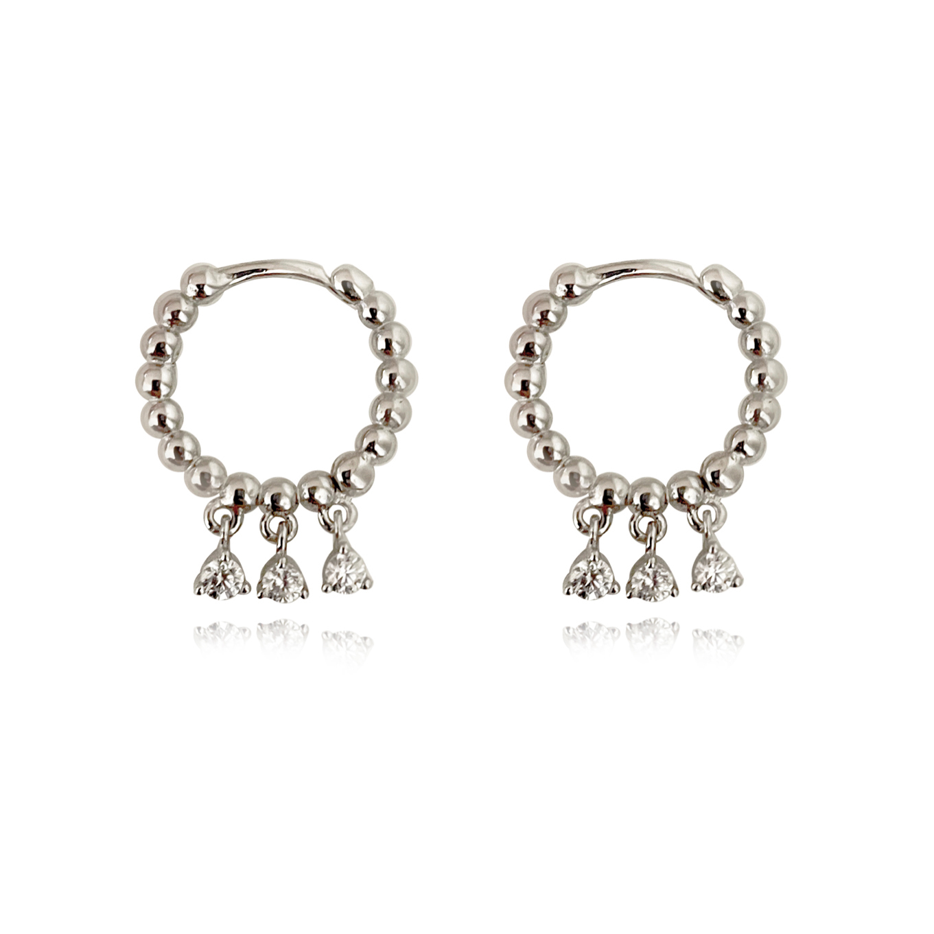 Love a beaded earring style? How about adding some sparkles as well? Introducing Augusta Beaded Zirconia Drop Earrings (Silver) - a chic and trendy dainty ear love for your elevated everyday styling. This design features beaded style dainty hoops with 3 Austrian zircons attached to each earring - adding a subtle shimmer and movement as you walk. The earrings are crafted in solid sterling silver with rhodium plating to ensure hypoallergenic wear, durability, and an extra anti-tarnish protection. Perfect for modern, chic, minimalist, feminine, girly, boho, earring layering, smart causal, casual, everyday styles and more. Hypoallergenic, nickel, cadmium and lead free.