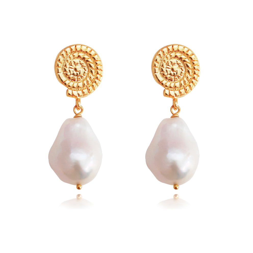 Shine bright with gold glory and pearl luxury. Introducing Aurelia 24K Baroque Pearl Drop Earrings — an artisan crafted piece inspired by the marine culture. This design features gold shell swirls with a spiral texture. The gold shell features are crafted in environmentally friendly brass (nickel free) with a 2.5 microns of thick 24K gold plating, giving the pieces a luxurious gold shine that is also tarnish resistant. The pearls used in this design are handpicked high quality baroque pearls with stunning lustre, adding an illuminating and gorgeous pearl shine to your presence. An elegant and outspoken ear love for those who appreciate fine craftsmanship, quality, endurance, and high fashion. Perfect for bridal, wedding, formal, semi-formal, evening, dressy, high end styling, vintage, feminine, chic styles and more. Hypoallergenic, nickel, cadmium and lead free.